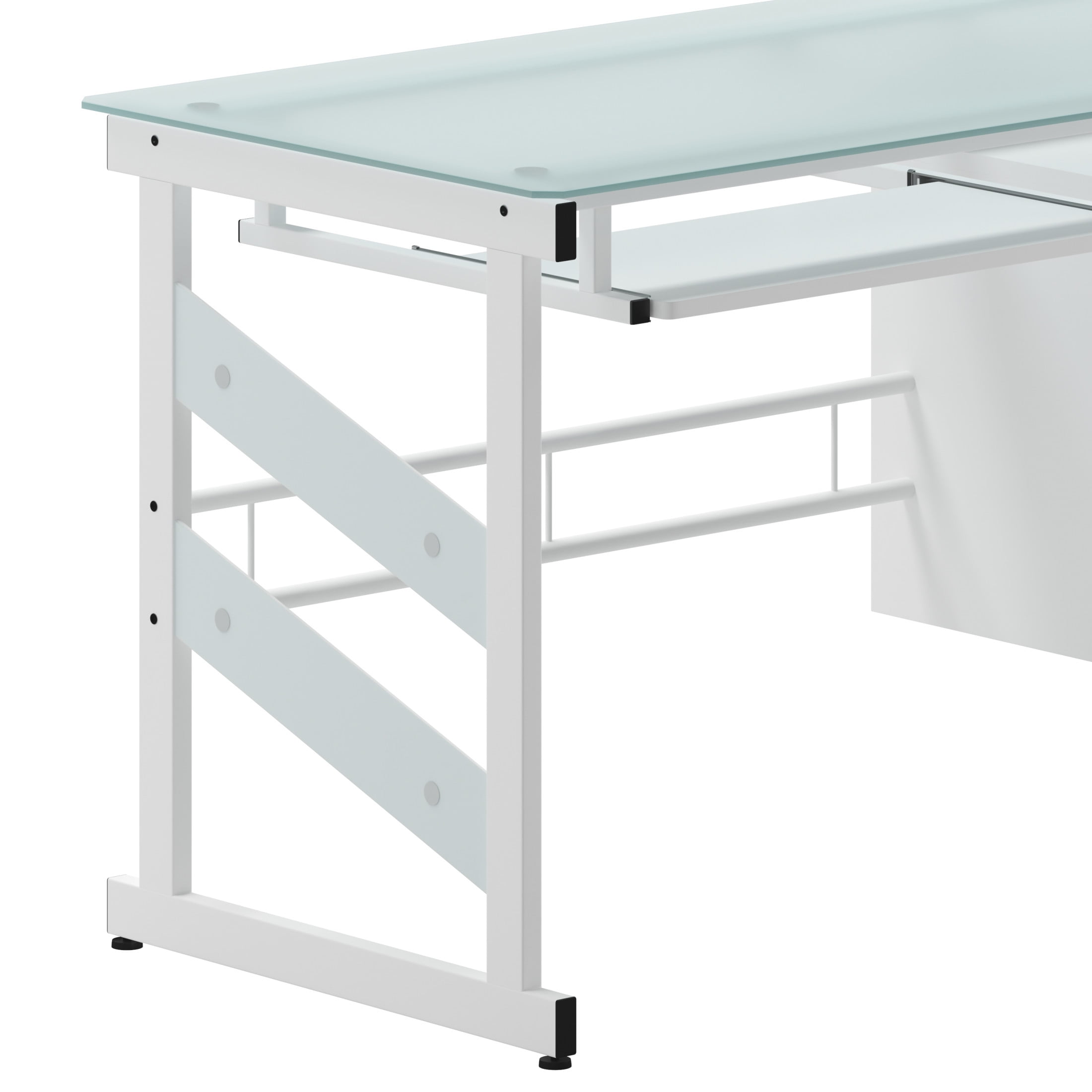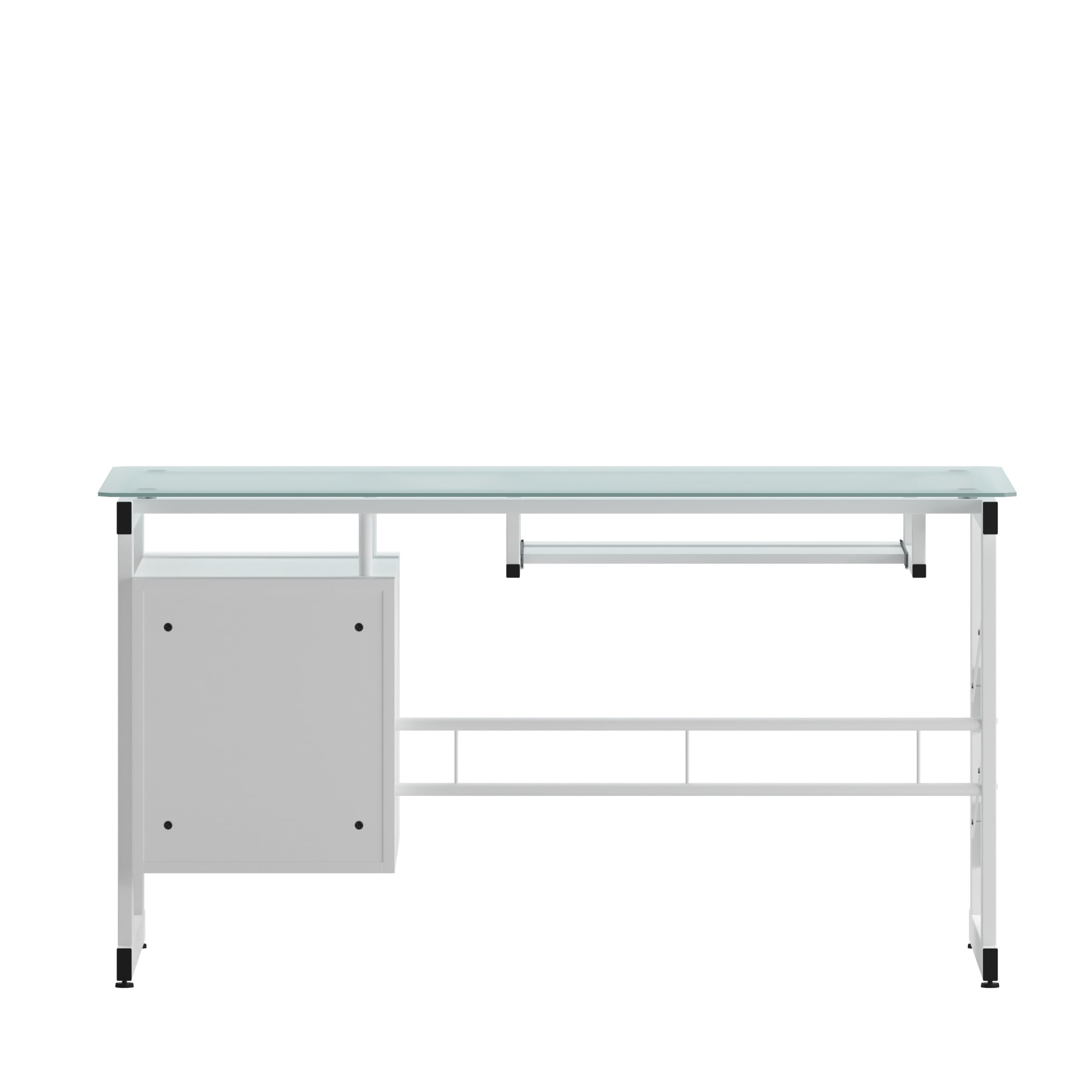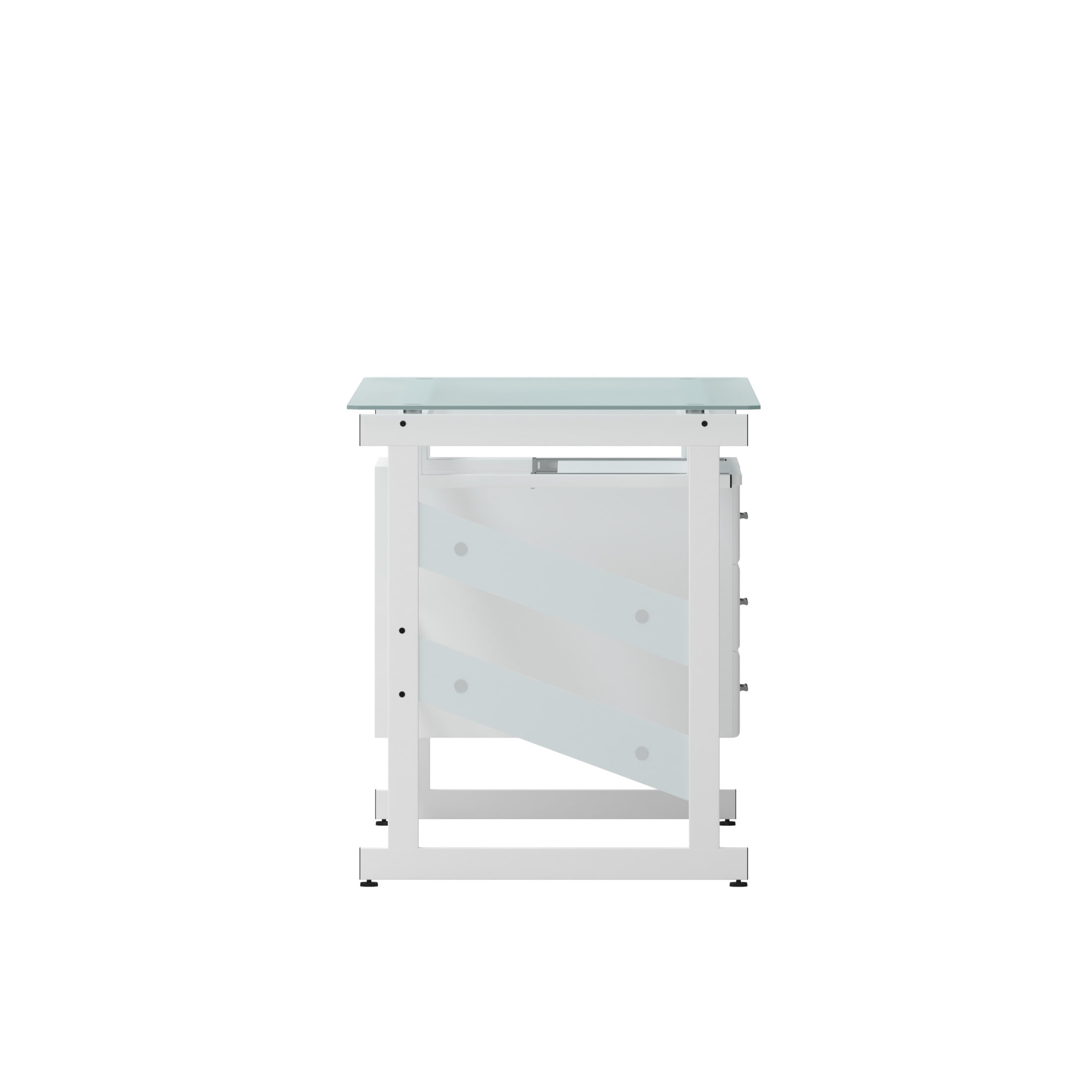 Flash Furniture Singleton White Computer Desk with Frosted Glass Top and Three Drawer Pedestal Contemporary Style Computer Desk Frosted Tempered Glass Surface, Decorative Frosted Side Panels 8mm Thick Glass Spacious Rectangular Desktop Sliding Keyboard Tray: 23.25″W X 11.5″D X 25.25″H From Floor Hanging Three Drawer Pedestal Pedestal Size: 15.75″W X 23.5″D X 24.5″H Box Drawer Size (3): 12.5″W X 13″D X 4.25″H Silver Bar Pulls White Powder Coated Frame Finish with Floor Glides PRODUCT MEASUREMENTS: Overall Size: 55″W x 25.5-33″D x 29.75″H; Pedestal Size: 15.75″W x 23.5″D x 24.5″H; Box Drawer Size (3): 12.5″W x 13″D x 4.25″H; Sliding Keyboard Tray: 23.25″W x 11.5″D x 25.25″H from floor