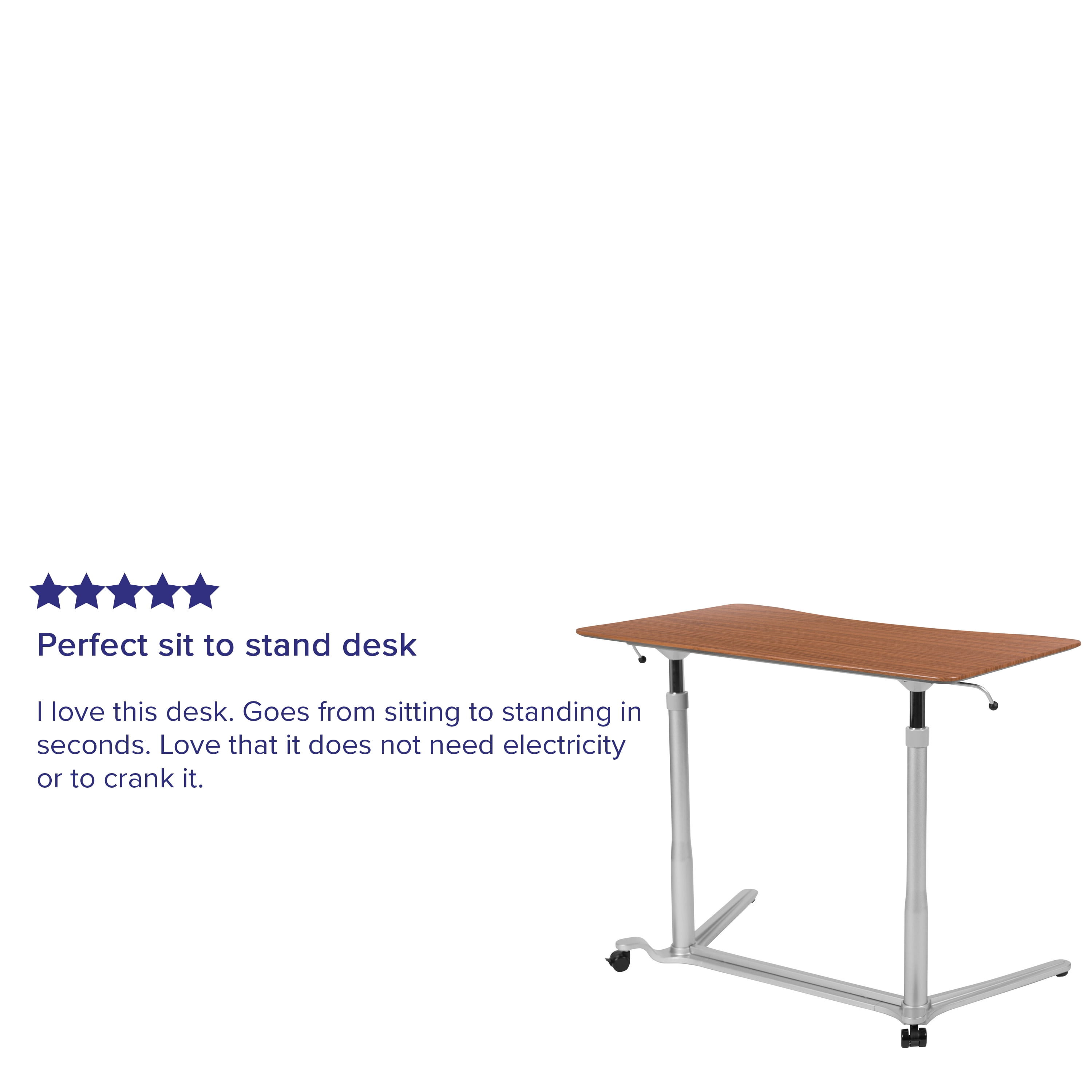 Contemporary Style Ergonomic Sit-Down and Stand-Up Desk Cherry Laminate Finish Top Size: 37.375″W x 18.5-20.5″D .5″ Thick Top Pneumatic Height Adjustable Frame Silver Powder Coat Frame Finish Front Adjustable Floor Glides Back Locking Dual Wheel Casters Base Size: 20-33″W