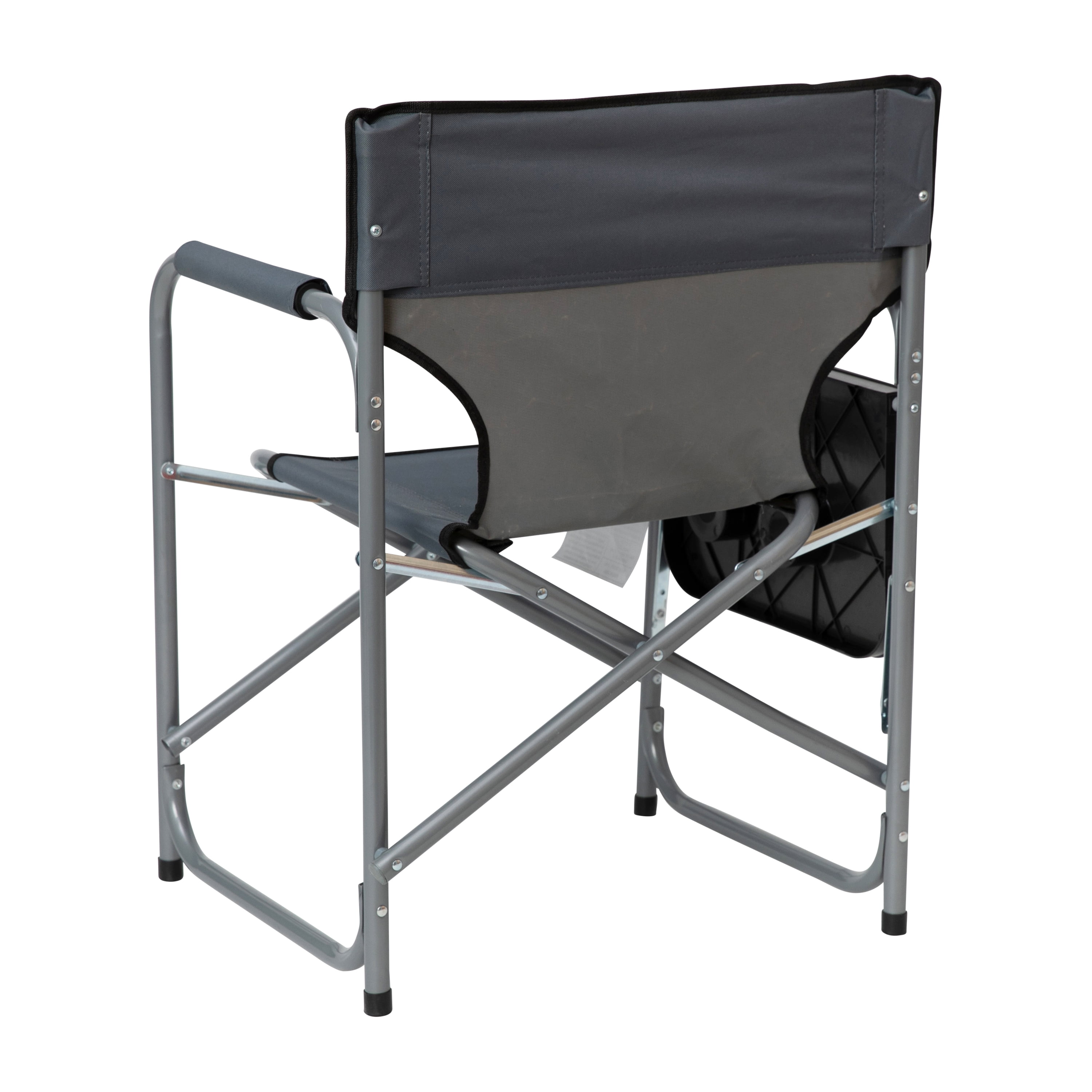 Foldable Directors Camping Chair with Cupholder Side Table for Indoor/Outdoor Use No Assembly Required for instant enjoyment 300D Gray Weather Resistant PE Coated Canvas Fabric for long-lasting use Folded Size: 19.5″W x 6″D x 31.25″H; Table Size: 10.5″W x 15.5″L x 1″ Thick Powder Coated Steel Tube Framing with Galvanized Rivets hold up to 300 LBS. Static Weight Polypropylene Floor Glides prevents damage to indoor flooring Clean with Water and a Dry Cloth to maintain the appearance Collapsible chair ideal for additional seating at any event or for everyday use PRODUCT MEASUREMENTS: Overall Size: 22-31.5″W x 19.5″D x 31.5″H; Seat Size: 15.75″W x 13.25″D x 16.5″H; Back Size: 22″W x 15.5″H; Arm Size: 24.75″H from floor; 7.75″H from seat; Table Size: 10.5″W x 15.5″L x 1″ Thick