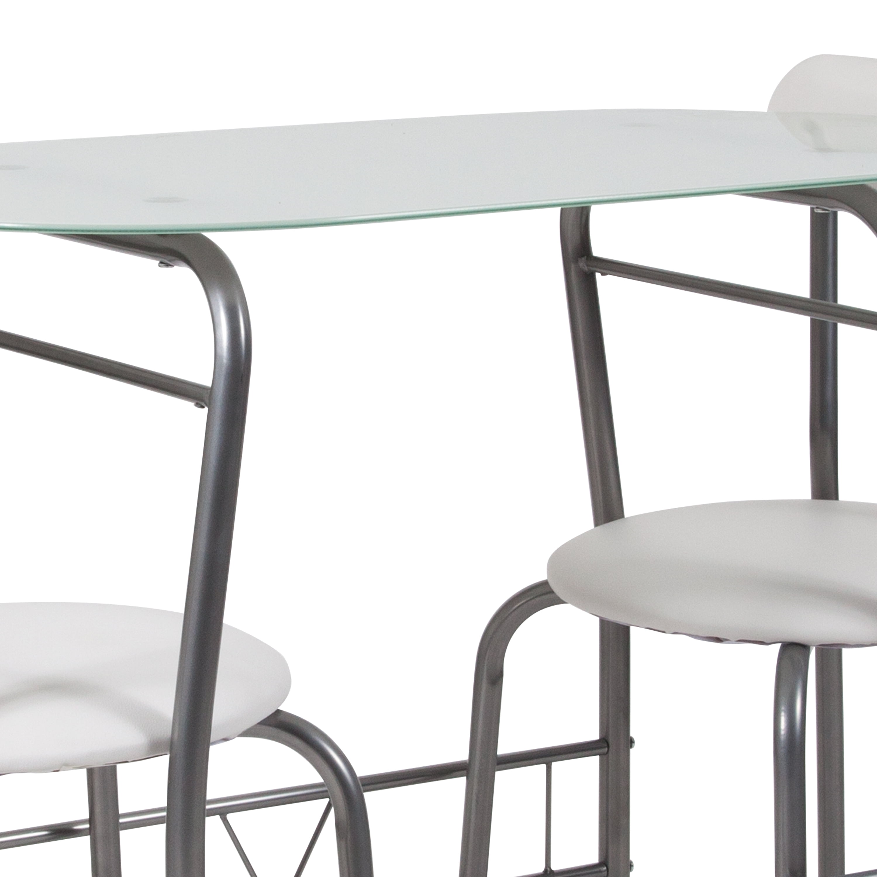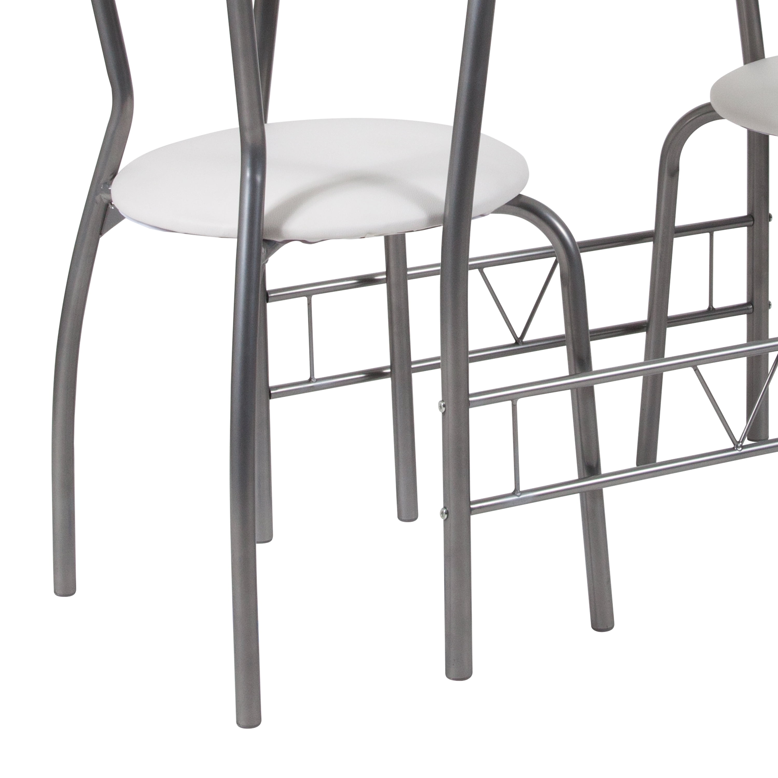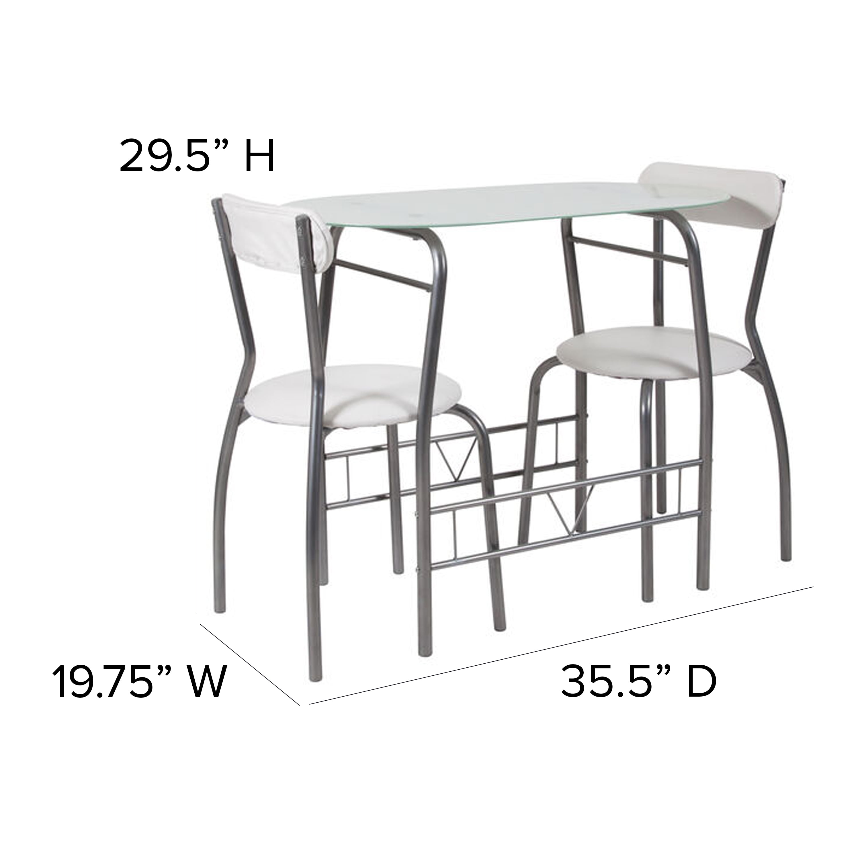 Flash Furniture Sutton 3 Piece Space-Saver Bistro Set with White Glass Top Table and White Vinyl Padded Chairs Retro Style Dinette Set Set Includes Table and 2 Chairs Table Size: 19.75″W x 35.5″L x 29.5″H; Base Size: 14″W x 14.75″L 6mm Thick White Tempered Glass Surface Ornamental Bottom Frame adds stability Chair Size: 16″W x 15.75″D x 30.75″H; Back Size: 16″W x 16″H; Seat Size: 15″W x 15″D x 17.25″H Open Back Dining Chair with White Vinyl Upholstery Café Style Round Seat Silver Powder Coated Frame Finish PRODUCT MEASUREMENTS: Table Size: 19.75″W x 35.5″L x 29.5″H; Base Size: 14″W x 14.75″L; Chair Size: 16″W x 15.75″D x 30.75″H; Back Size: 16″W x 16″H; Seat Size: 15″W x 15″D x 17.25″H