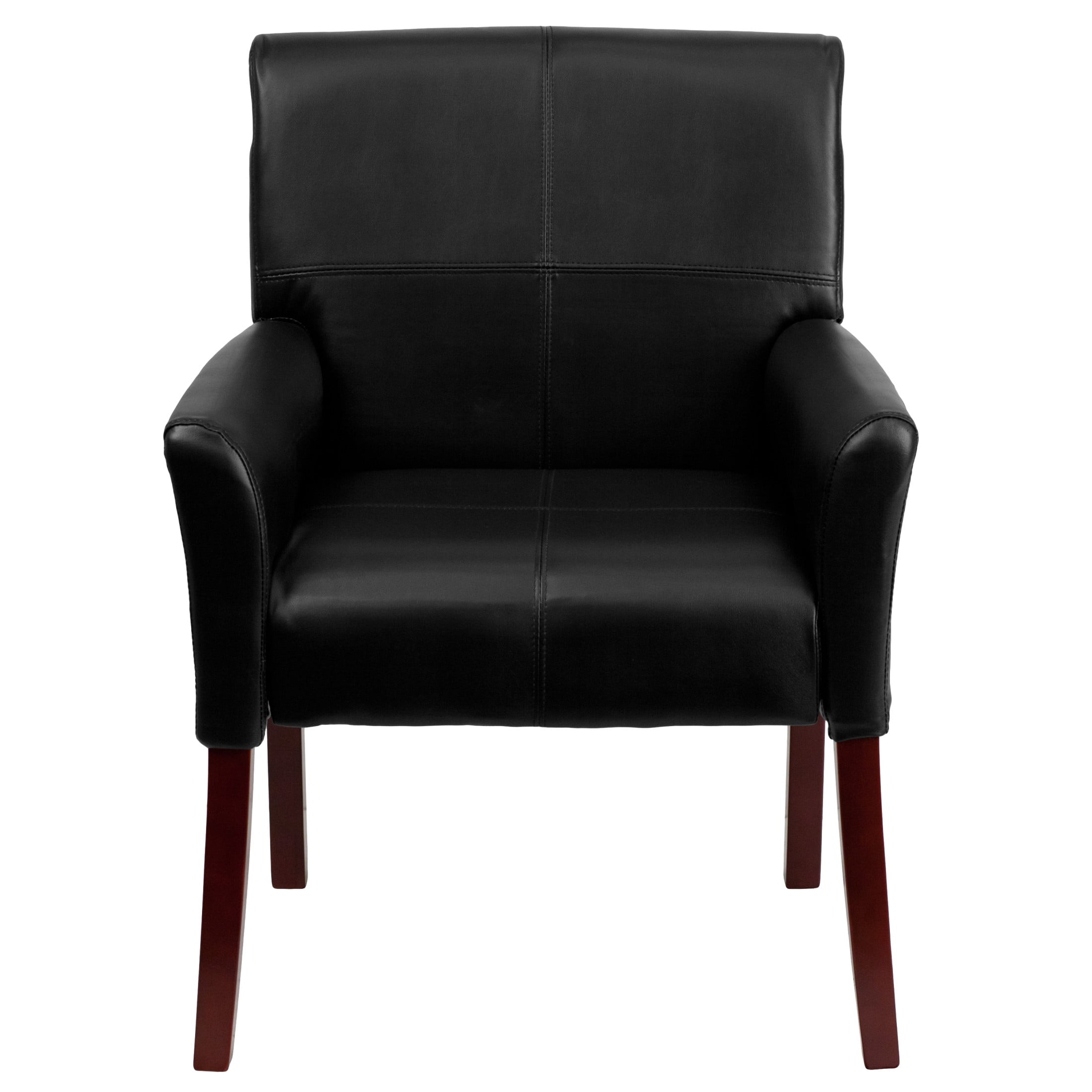 Flash Furniture Taylor LeatherSoft Upholstered Ergonomic Executive Side Reception Chair, Black Adult size reception chair for residential or commercial spaces Creates a welcoming atmosphere in homes, lobbies, offices, training rooms, or libraries Soft and durable black LeatherSoft upholstery Modern box stitching design and high mahogany finished wooden legs Ergonomic seat and back feature foam padded cushions Padded curved arms improve circulation High-quality, sturdy legs are completed with protective non-marring floor glides Overall size: 26.5″W x 23″D x 35.25″H; Seat size: 18.25″W x 19″D x 19.75″H; Back size: 23″W x 17.25″H EFFICIENT SIZE: Measures 26.5″W x 23″D x 35.25″H with a 18.25″W x 19″D x 19.75″H seat size and 23″W x 17.25″H back size to fit neatly in any home or lobby