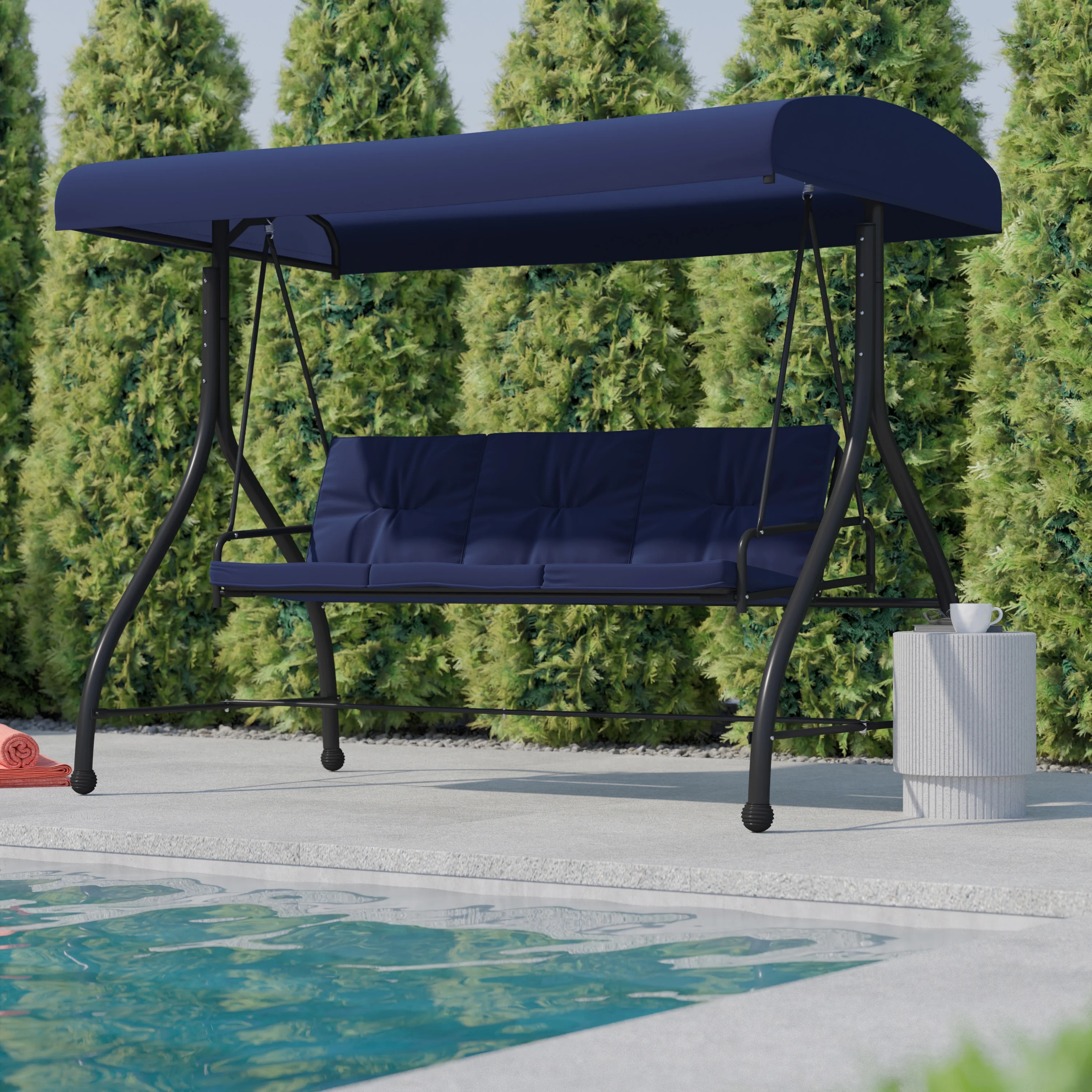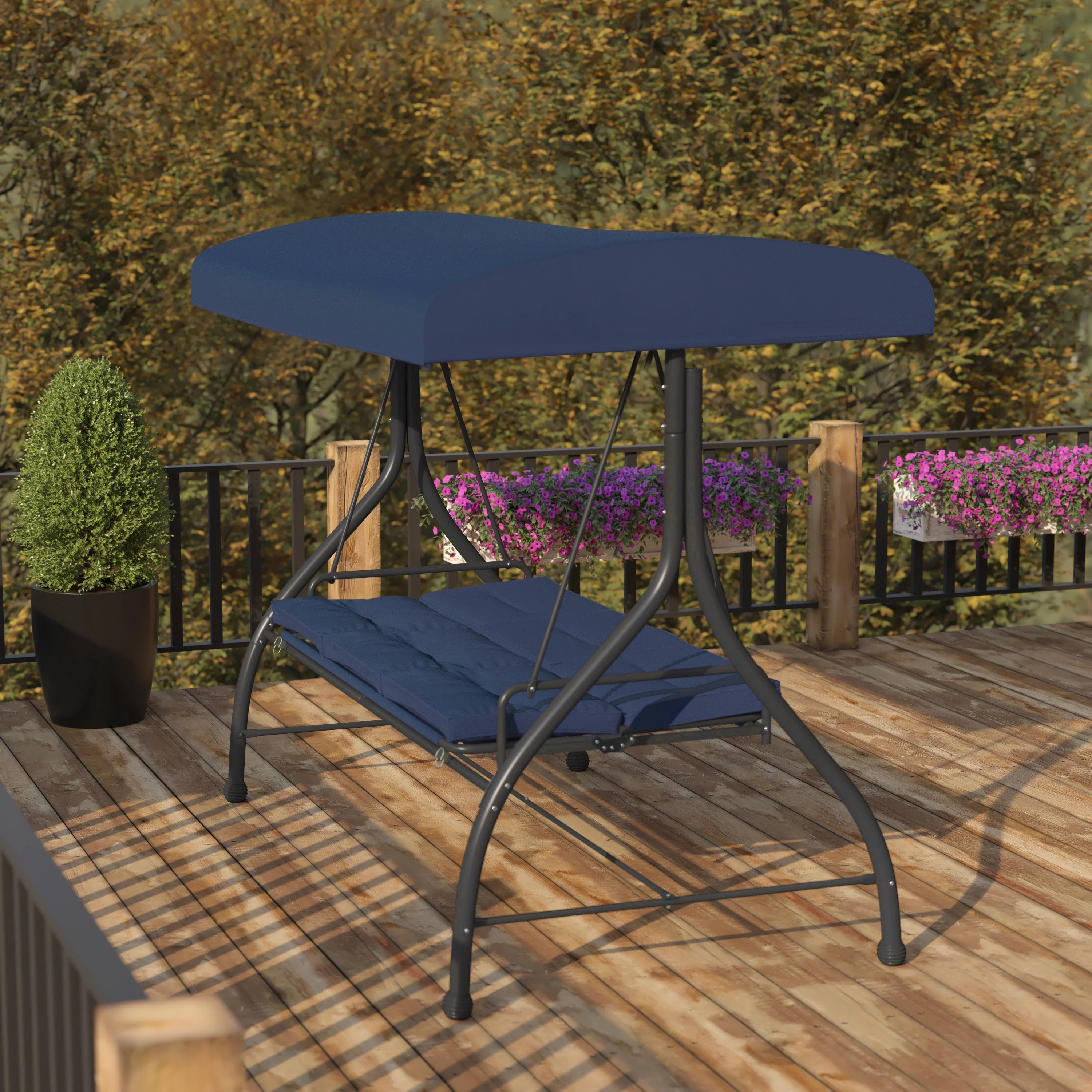 Flash Furniture Tellis 3-Seat Outdoor Steel Converting Patio Swing Canopy Hammock with Cushions / Outdoor Swing Bed (Navy)