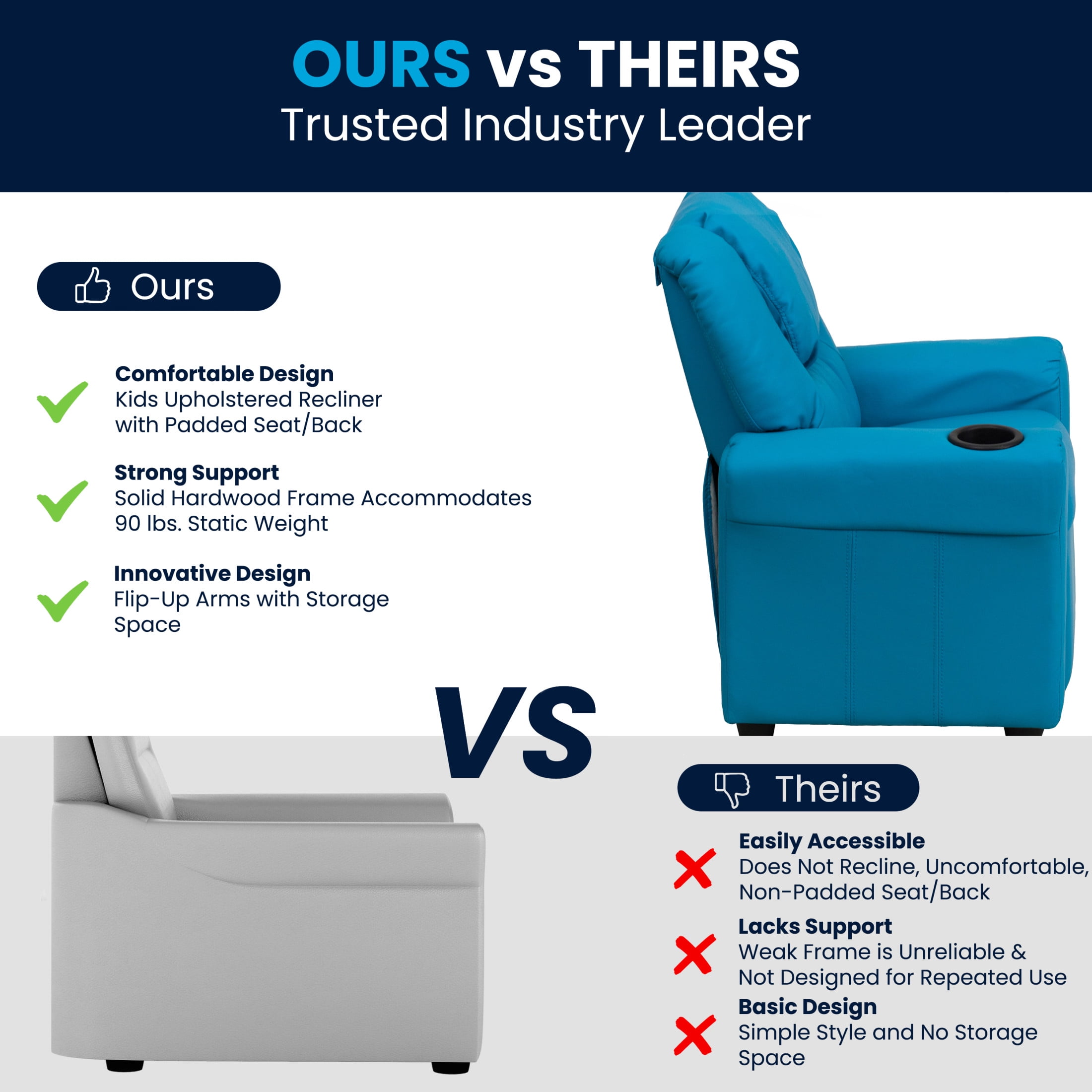 Flash Furniture Vana Contemporary Turquoise Vinyl Kids Recliner with Cup Holder and Headrest Kids Recliner – Lounge and Playroom Chair Turquoise Vinyl Upholstery Plush Back and Seat padded with CAL 117 fire retardant foam Cup Holder Armrest to hold drinks, snacks or pet treats Safety Feature: will not recline unless child is in seated position and pulls ottoman 1″ out and then reclines Wall Clearance: 6″ Solid Hardwood Frame Construction holds up to 90 lbs weight capacity Raised Black Plastic Feet for easy floor cleaning Spot Clean with Water Based Cleaner Kids reclining seating ideal for living rooms, playrooms, daycares and pediatric offices EFFICIENT SIZE: Recliner measures 24″W x 21.5-36.5″D x 27″H with a 13.5″W x 11″D x 15.5″H seat size, and 18.5″W x 15″H back size for the perfect fit that adds a touch of contemporary style to your home