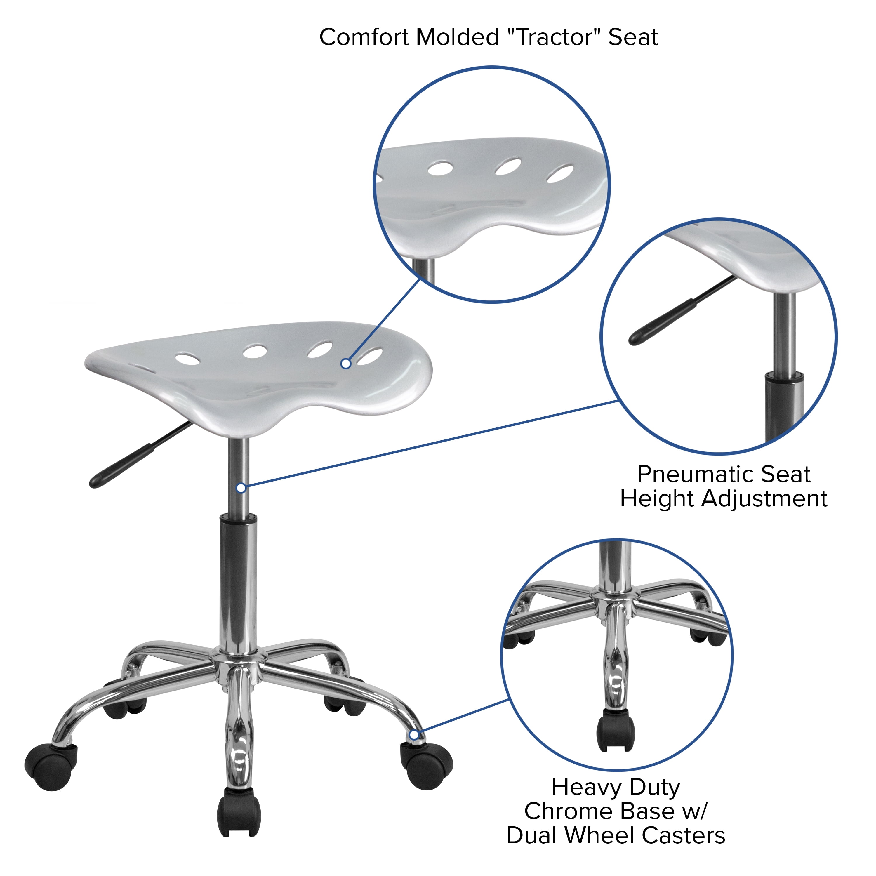 Tractor Style Stool Silver Finish Comfort Molded “Tractor” Seat High Density Plastic Construction 360 Degree Swivel Seat Pneumatic Seat Height Adjustment 5.5″ Height Range Adjustment Heavy Duty Chrome Base Dual Wheel Casters Designed for Residential Use Only