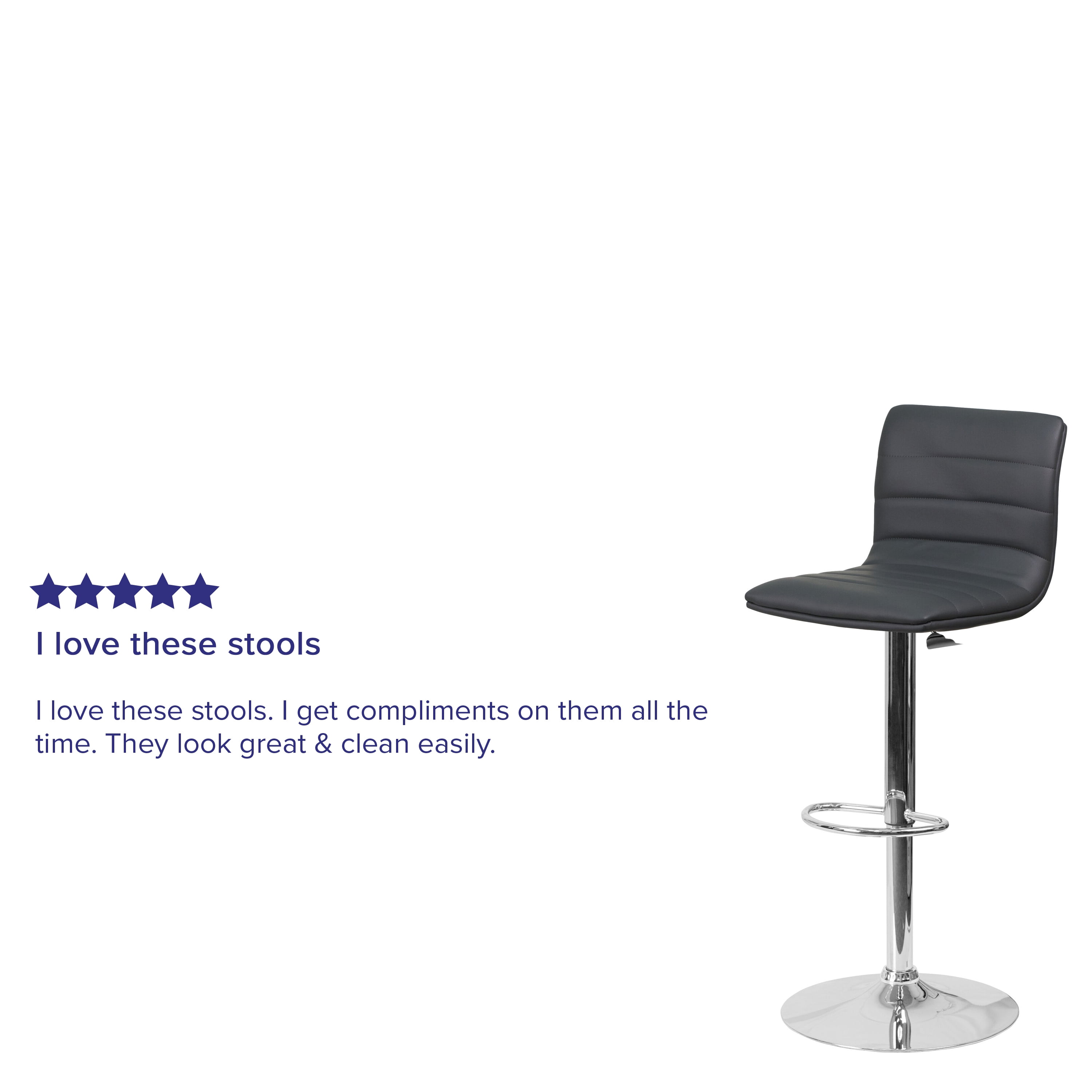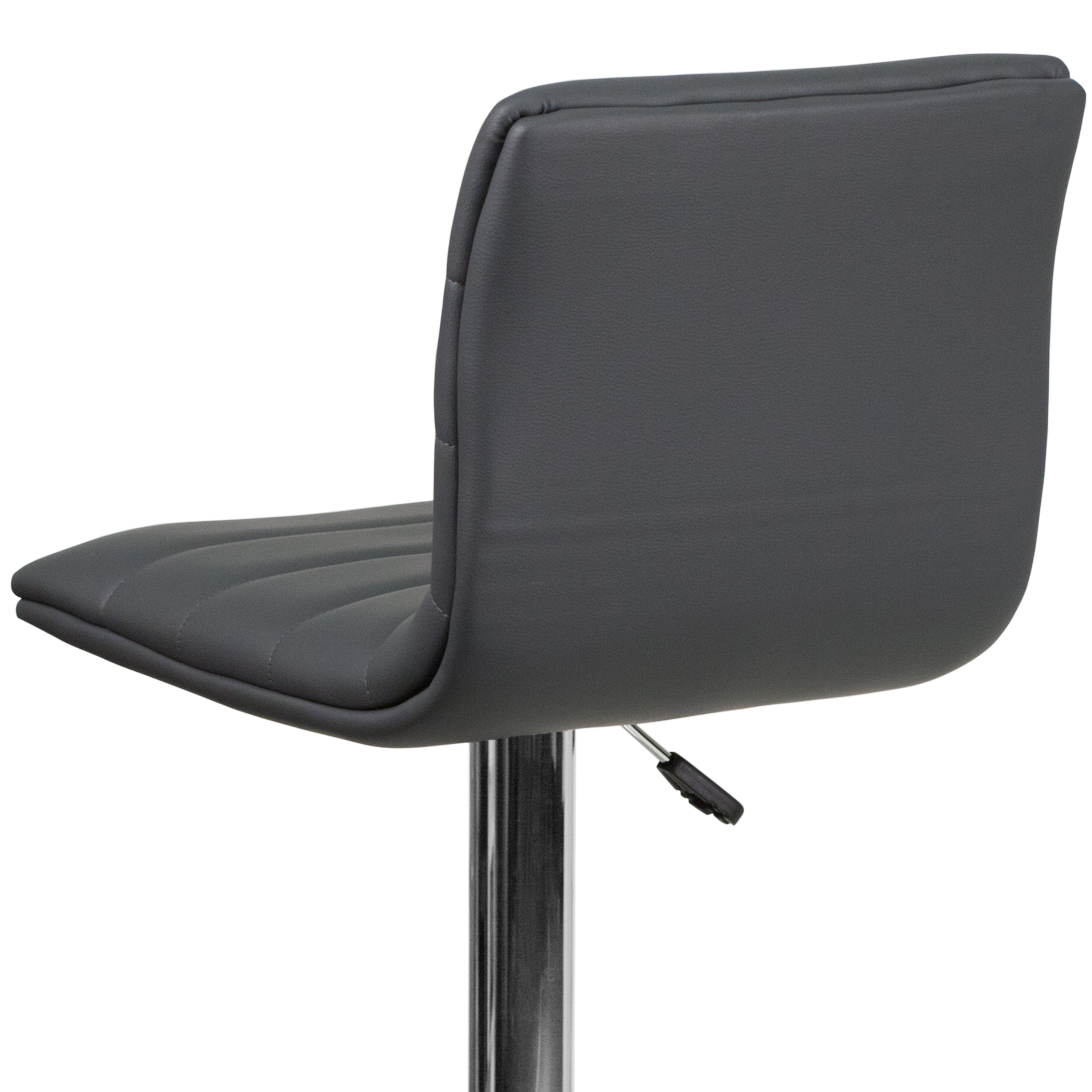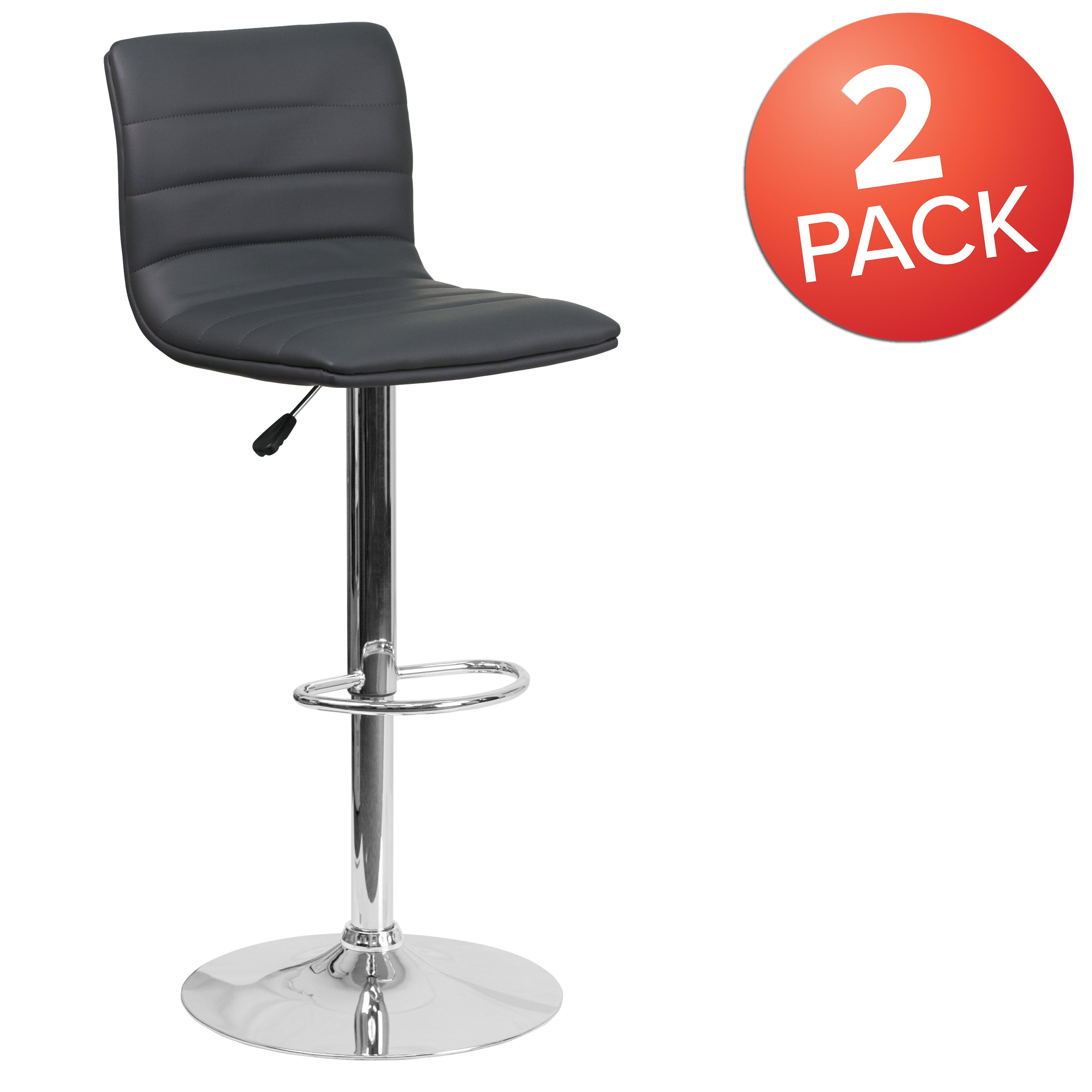 Flash Furniture Vincent 2 Pack Modern Gray Vinyl Adjustable Bar Stool with Back, Counter Height Swivel Stool with Chrome Pedestal Base Set of 2 Contemporary Adjustable Height Stools with Pedestal Base Mid-Back Design supports the lower to mid back region Gray Vinyl Upholstery with Horizontal Embellished Stitching Padded Back and Seat with CAL 117 Fire Retardant Foam 360 Degree Swivel Seat allows entry from any direction Height Adjustable Seat with Gas Lift adjusts from bar to counter height Armless Design brings you closer to dining and activity surfaces to help prevent slouching Footrest Relieves Pressure From the Legs to provide a better sitting experience Classic Chrome Pedestal Base Diameter: 17.625″ Swivel barstool ideal for kitchen island, pub height dining tables or your home bar PRODUCT MEASUREMENTS: Overall Size: 16″W x 19″D x 35-44″H; Seat Size: 16″W x 14.5″D x 24-33″H; Back Size: 16″W x 12″H