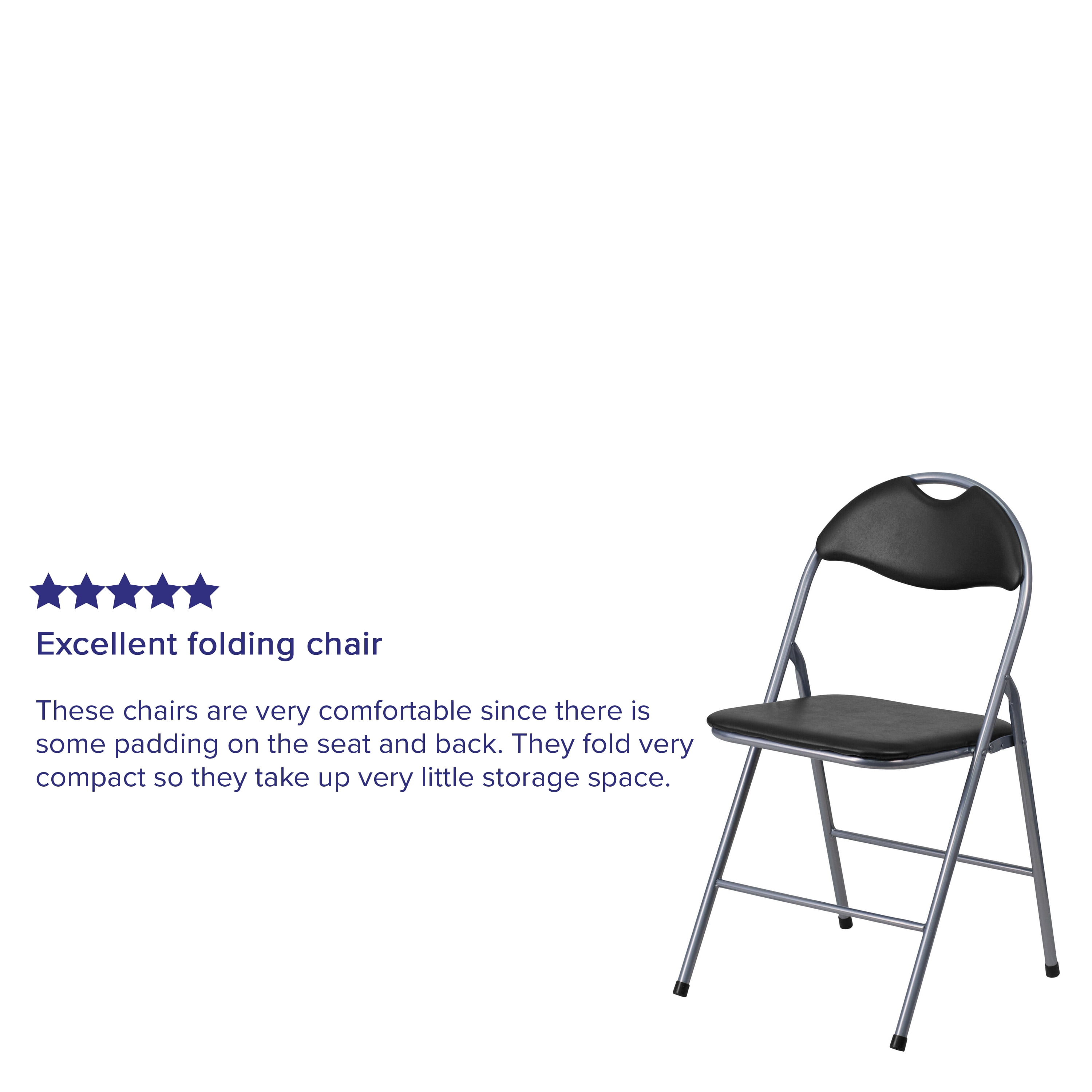 Set of 2: Padded Metal Folding Chair 300 lb. Weight Capacity Black Vinyl Upholstery 1″ Thick Padded Seat with CAL 117 Foam Silver Powder Coated Frame Finish with Non-Marring Floor Glides Carrying Handle Cutout for easy movement Designed for Commercial or Residential Use Folded Size: 17″W x 1.75″D x 35.75″H Top Review: I purchased these chairs for a business studio and am very pleased with the quality for the price. They are light but not flimsy and are nicely padded on the seat and back.