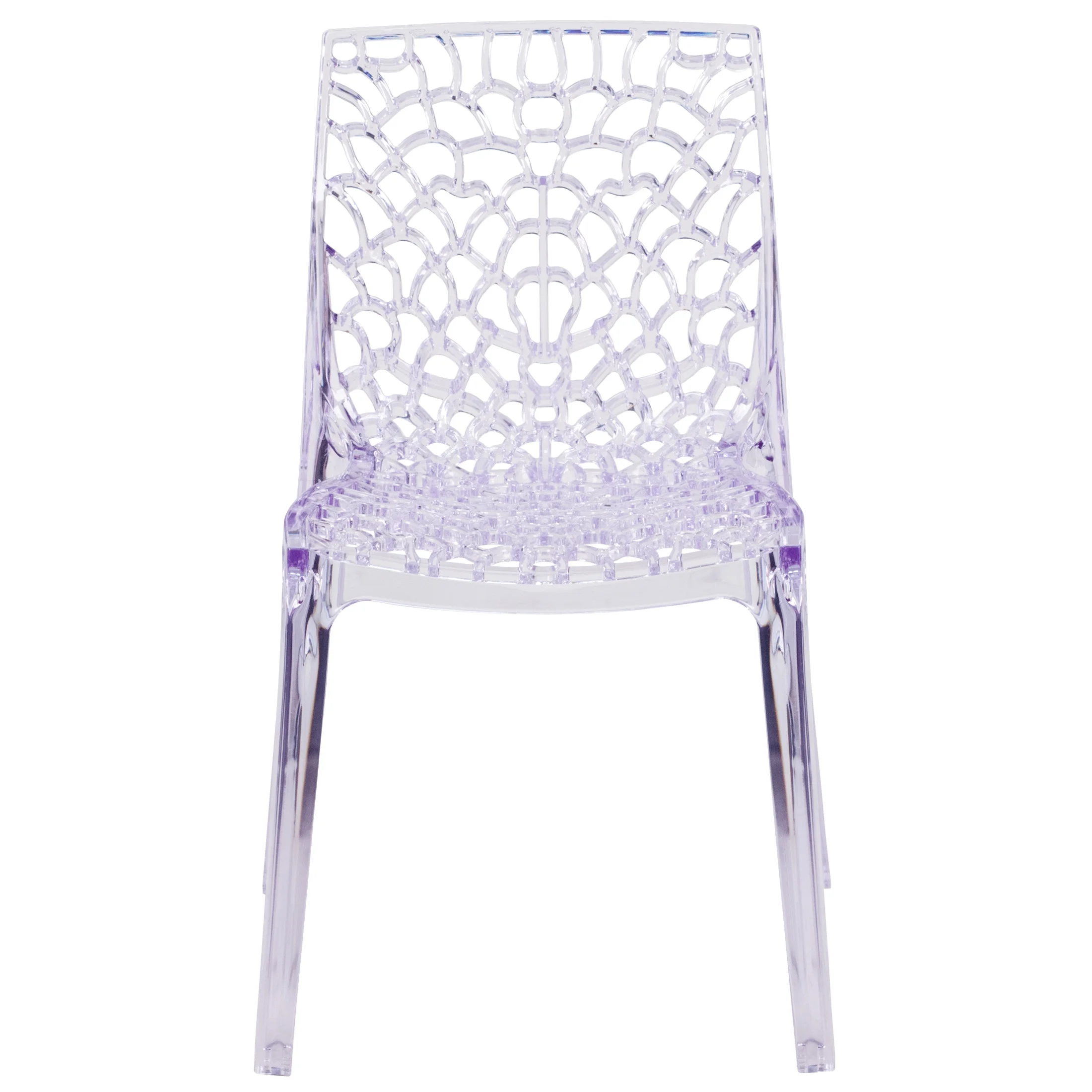Create a beautiful and artistic statement with this transparent accent chair. You will fall in love with this chair with its intricate cut-out design. The transparency of the chair allows it to take up less space visually as with a solid chair. This chair was crafted with an ingenious combination of lightness and strength. Due to its stacking capabilities, elegant design and use in indoor and outdoor locale this chair can be used in diverse environments.
