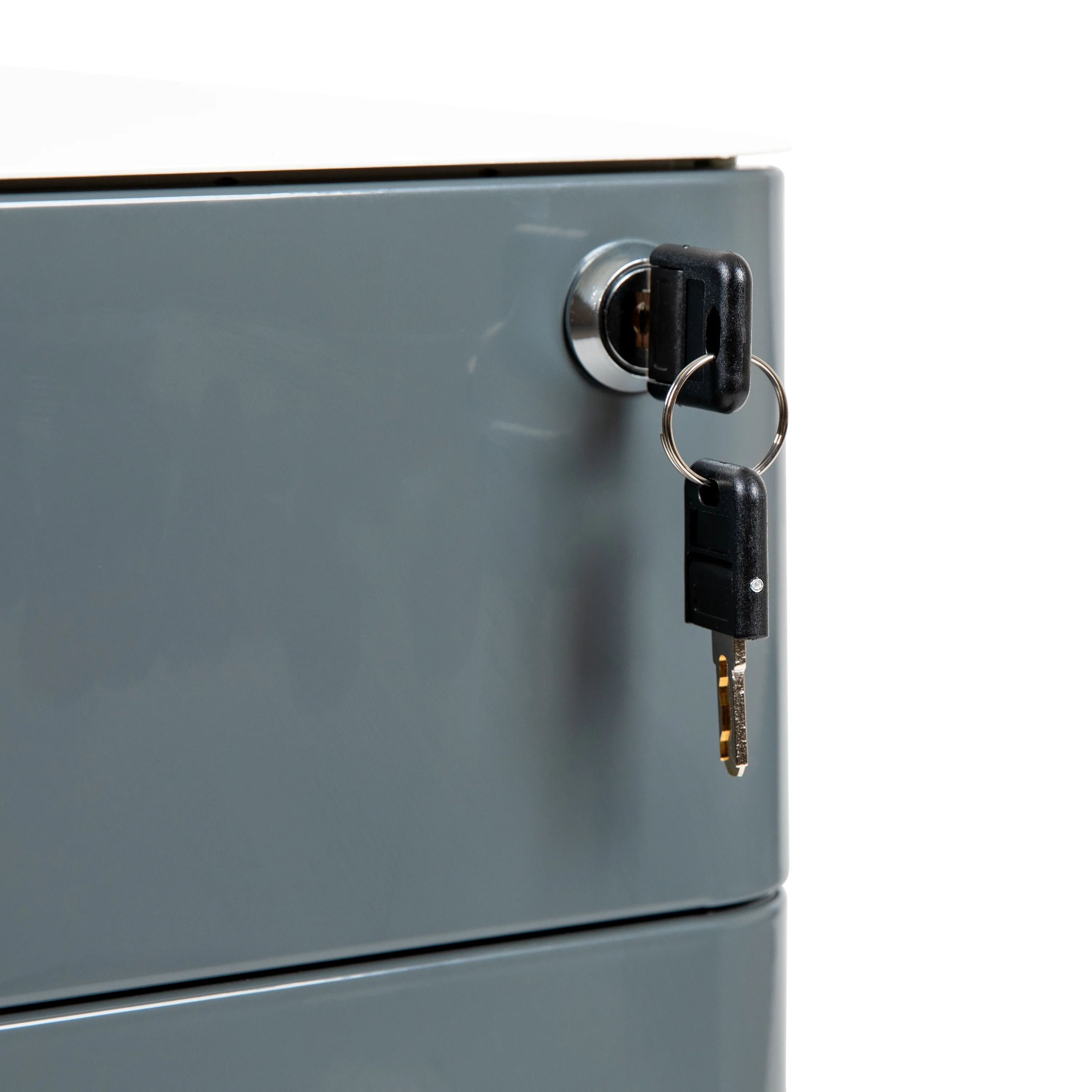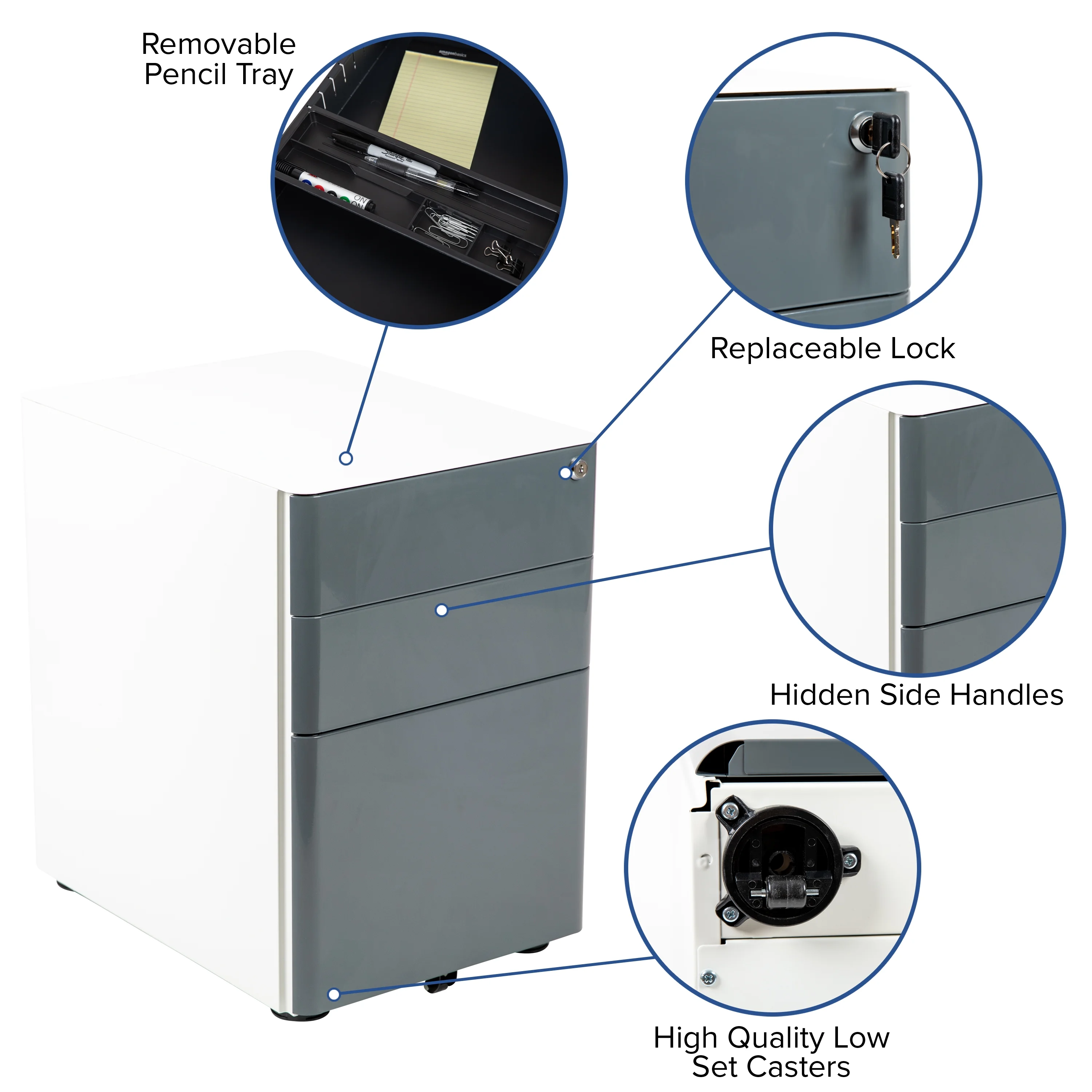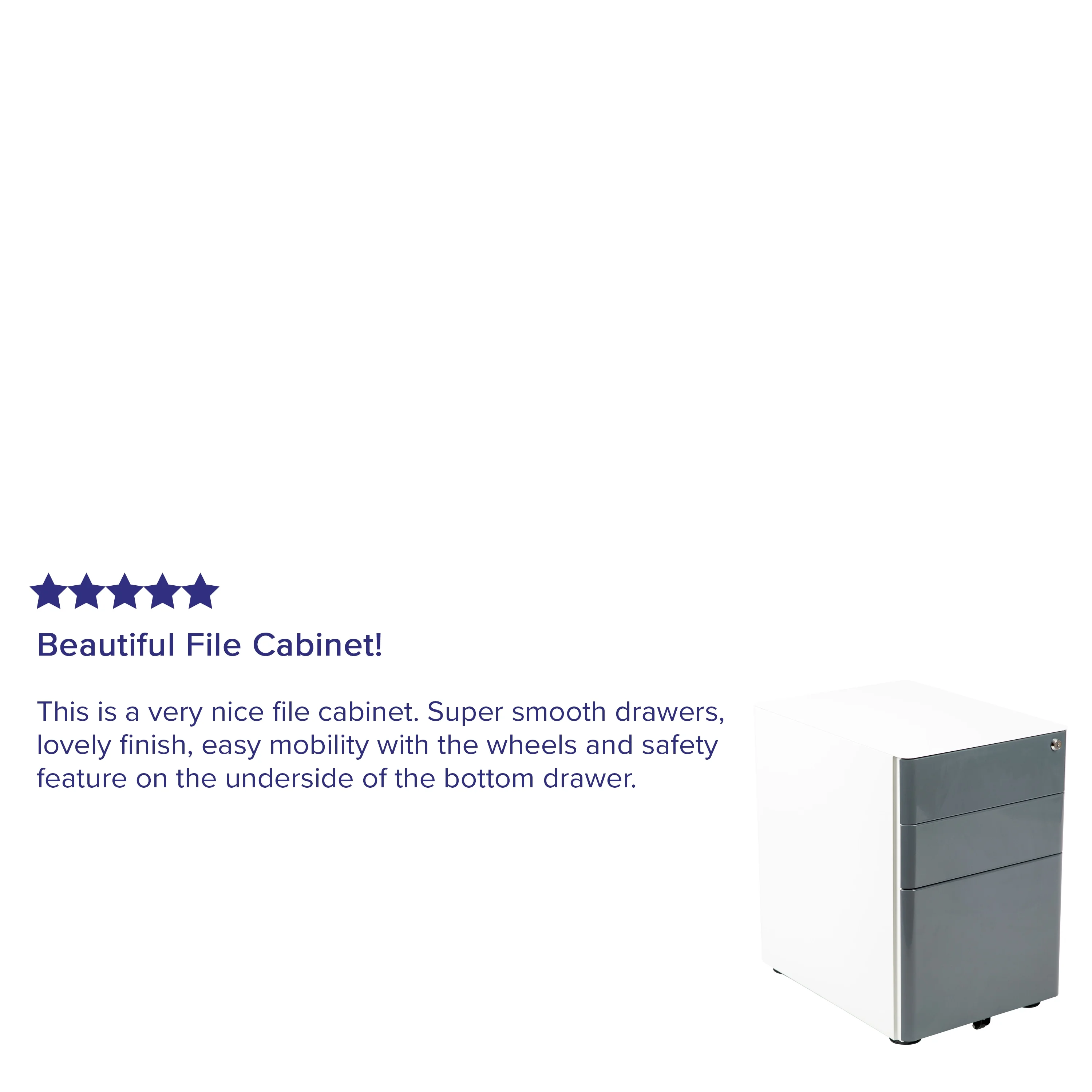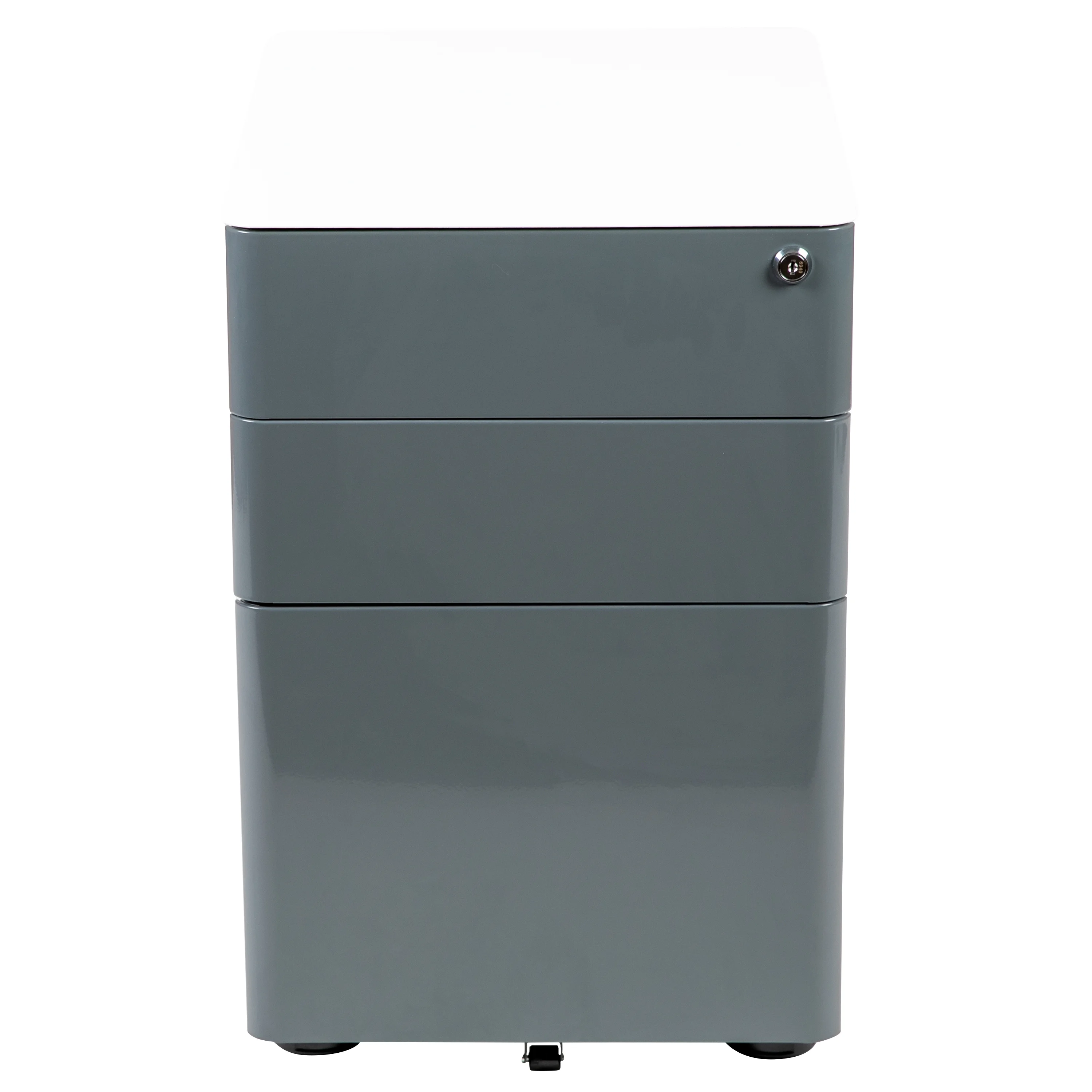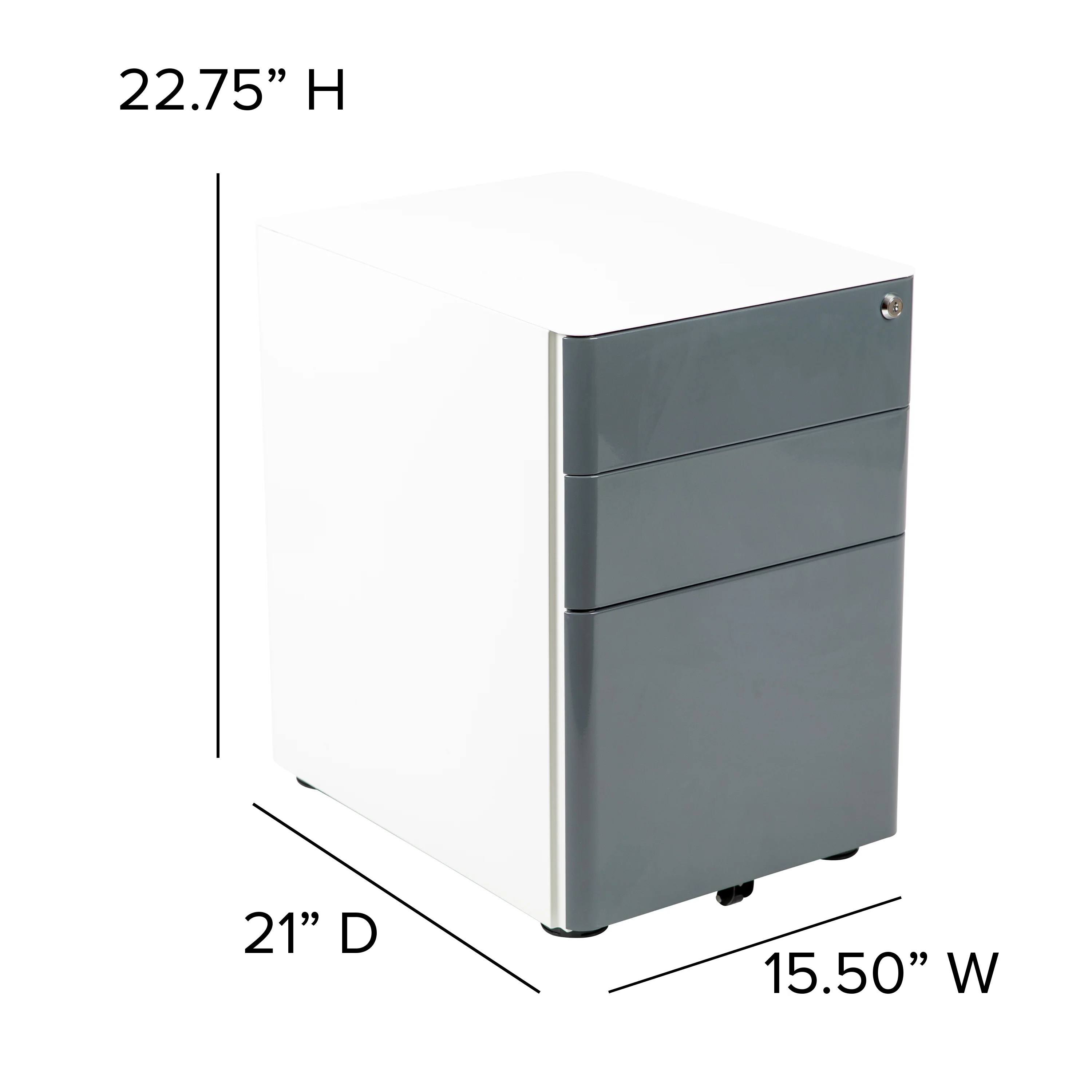 Flash Furniture Warner Modern 3-Drawer Mobile Locking Filing Cabinet with Anti-Tilt Mechanism & Letter/Legal Drawer, White with Charcoal Faceplate Modern 3-Drawer Filing Cabinet with White Frame and Charcoal Faceplate Smooth surface drawers with side handles Includes two keys, key lock is replaceable Pencil tray holds writing utensils and small office supplies File drawer with filing conversion bar – file letter, legal, A4, F4 Interlocking Tip Prevention Drawers opens one drawer at a time; conversion bar for vertical filing Full Extension Sliders provide effortless opening and closing Utility Drawers: 13″W x 18.75″D x 4.5″H; File Drawer: 13″W x 18.75″D x 11.5″H Designed to fit under most tables and desks Ships fully assembled PRODUCT MEASUREMENTS: Overall Size: 15.5″W x 21″D x 22.75″H; Top and Middle Drawer Size: 13″W x 18.75″D x 4.5″H; Bottom Drawer Size: 13″W x 18.75″D x 11.5″H
