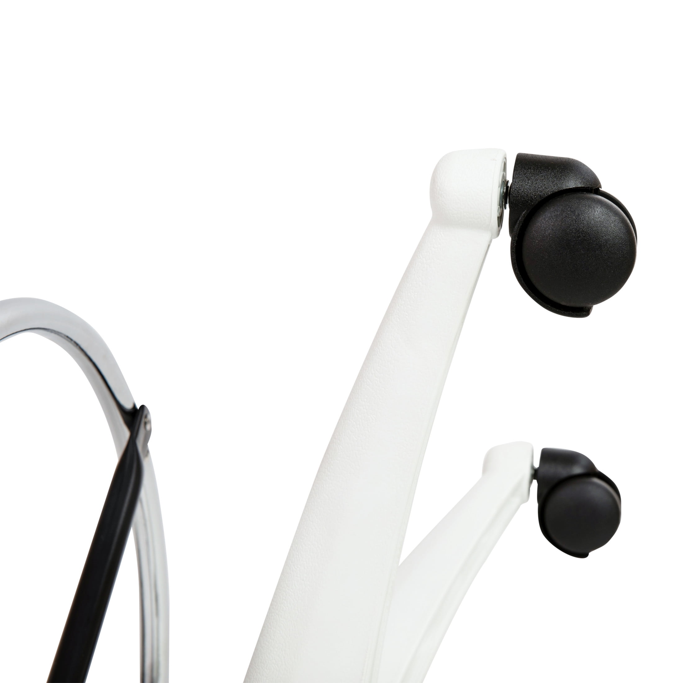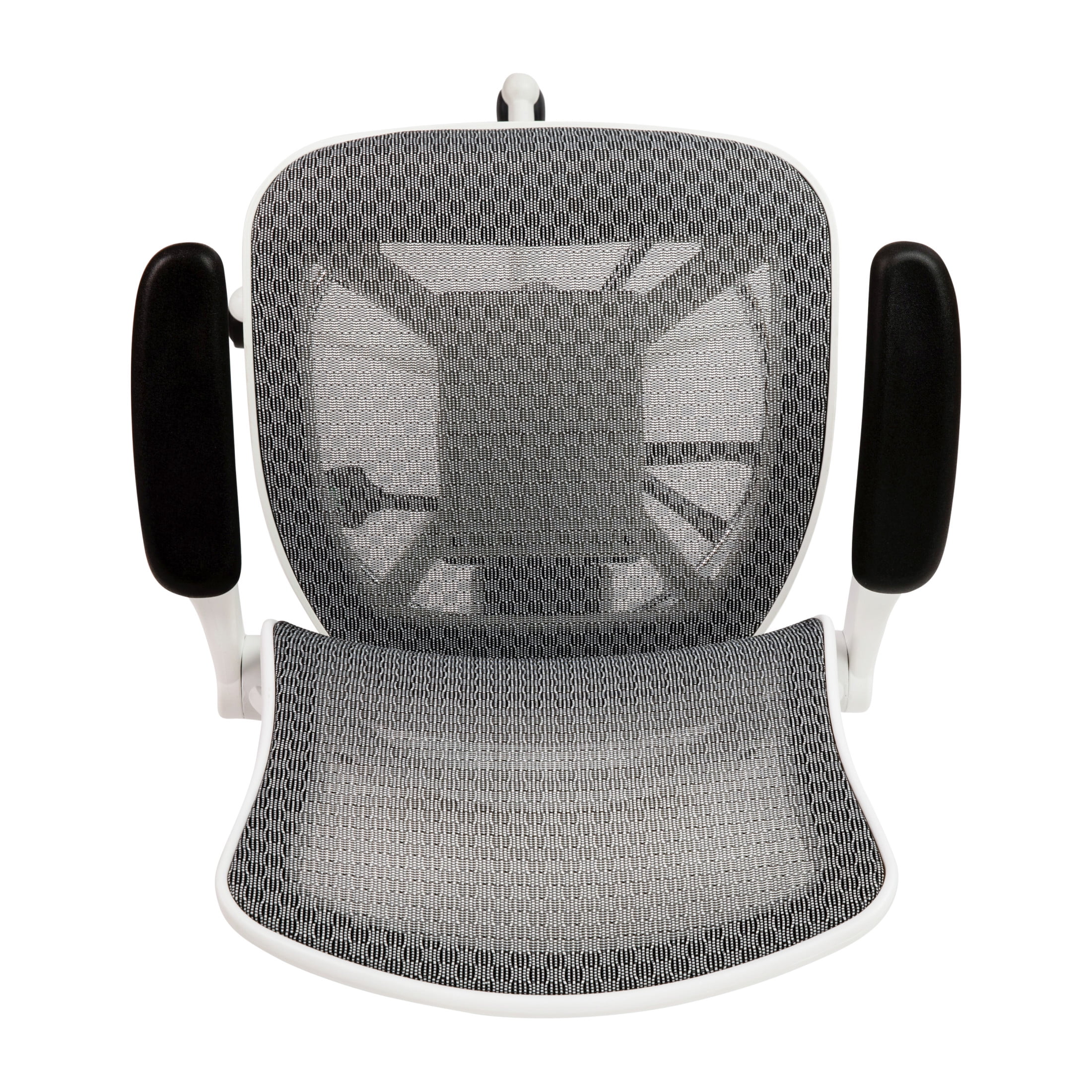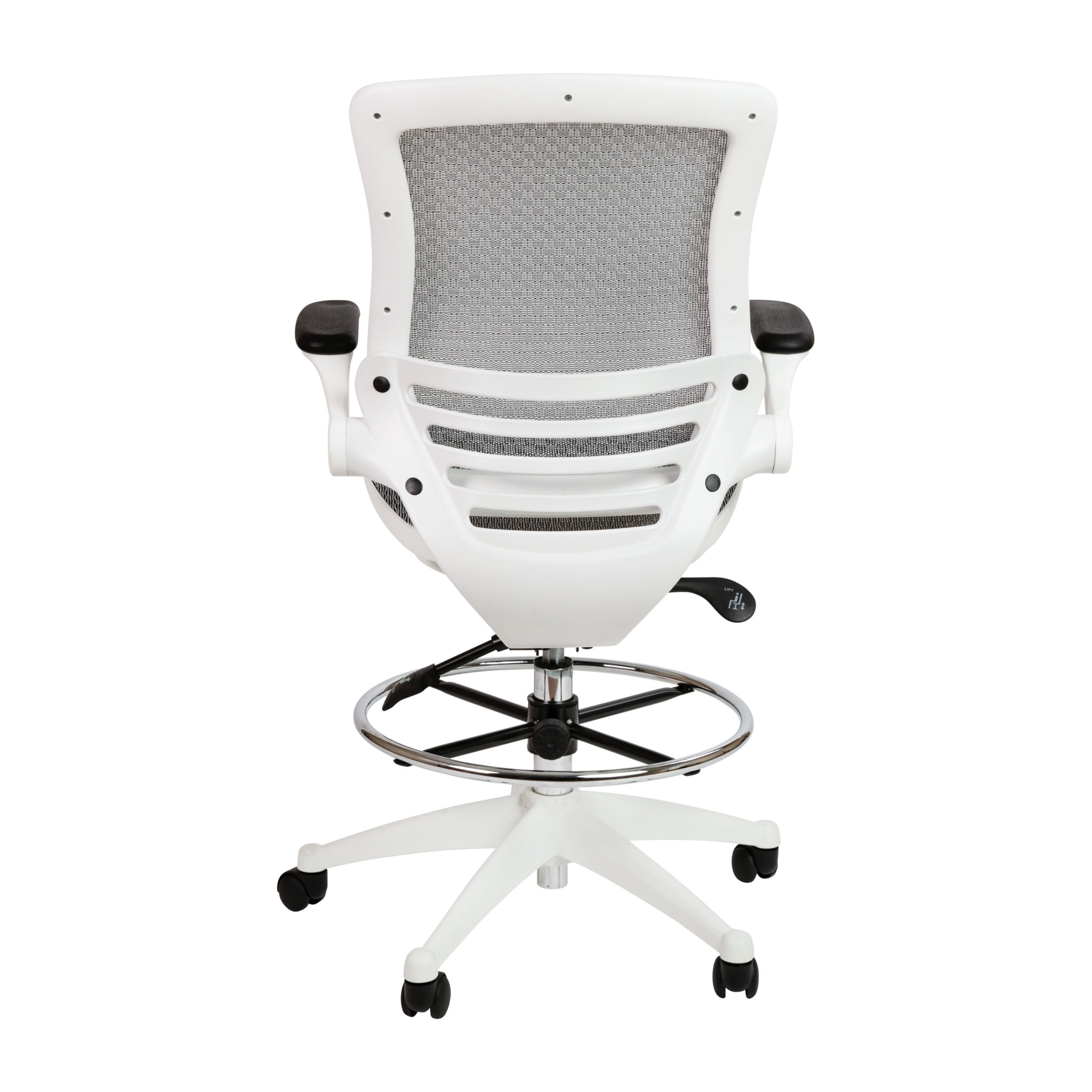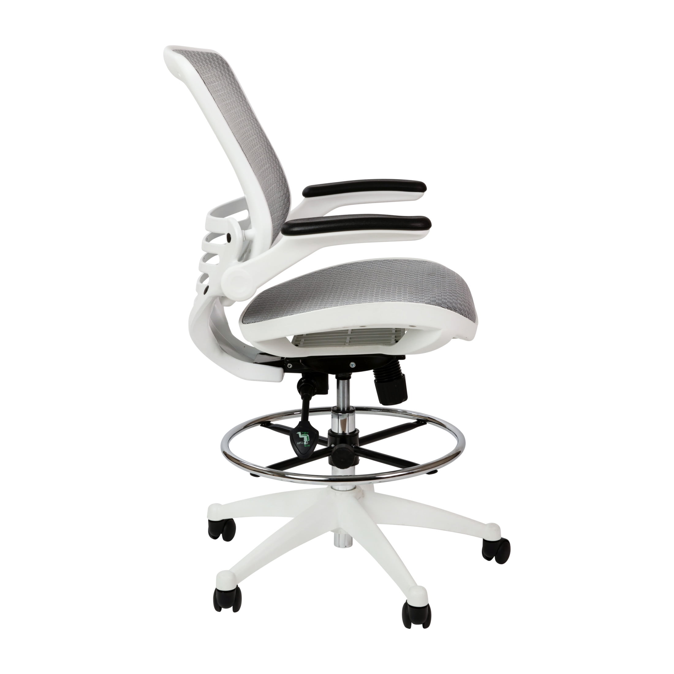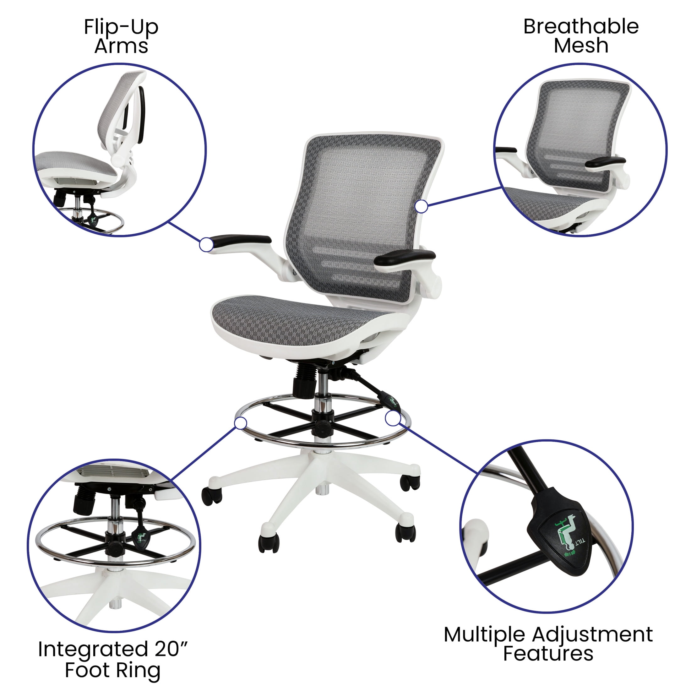 Flash Furniture Waylon Mid-Back Transparent Gray Mesh Drafting Chair with White Frame and Flip-Up Arms Modern Adjustable Drafting Chair for professional and home offices Transparent Gray Mesh Back and Seat allows air flow for comfort Mid-Back Design with Built-In Lumbar Support promotes good posture 2-to-1 Locking Synchro Tilt Adjustment tilts the back and seat in unison for a comfortable seating position Tilt Tension Adjustment Knob adjusts the chair’s backward tilt resistance Waterfall Swivel Seat reduces pressure on your legs Pneumatic Seat Height Adjustment provides a custom seating experience Padded Flip-Up Arms relieve pressure from the neck and shoulders, flip up out of the way when needed 5-Star White Nylon Base with Dual-Wheel Casters and 19.5″ Chrome Foot Ring Swivel drafting stool with multiple adjustment ideal for long workdays in your home office or place of business EASY TO ASSEMBLE: Measures 25″W x 23″D x 42.5-50″H and can be assembled quickly with the included tools and step-by-step instructions, and it wipes clean with a damp cloth for easy cleaning