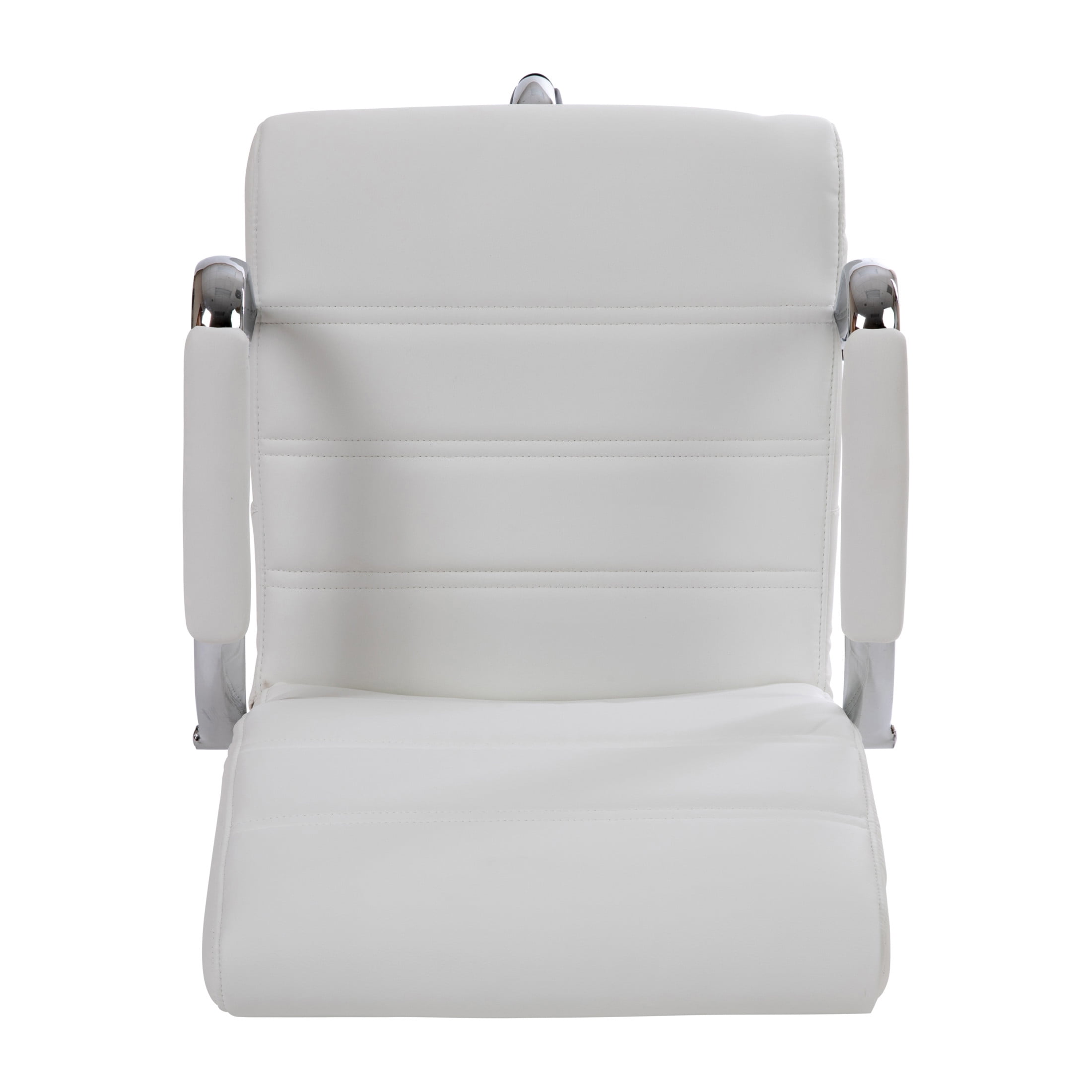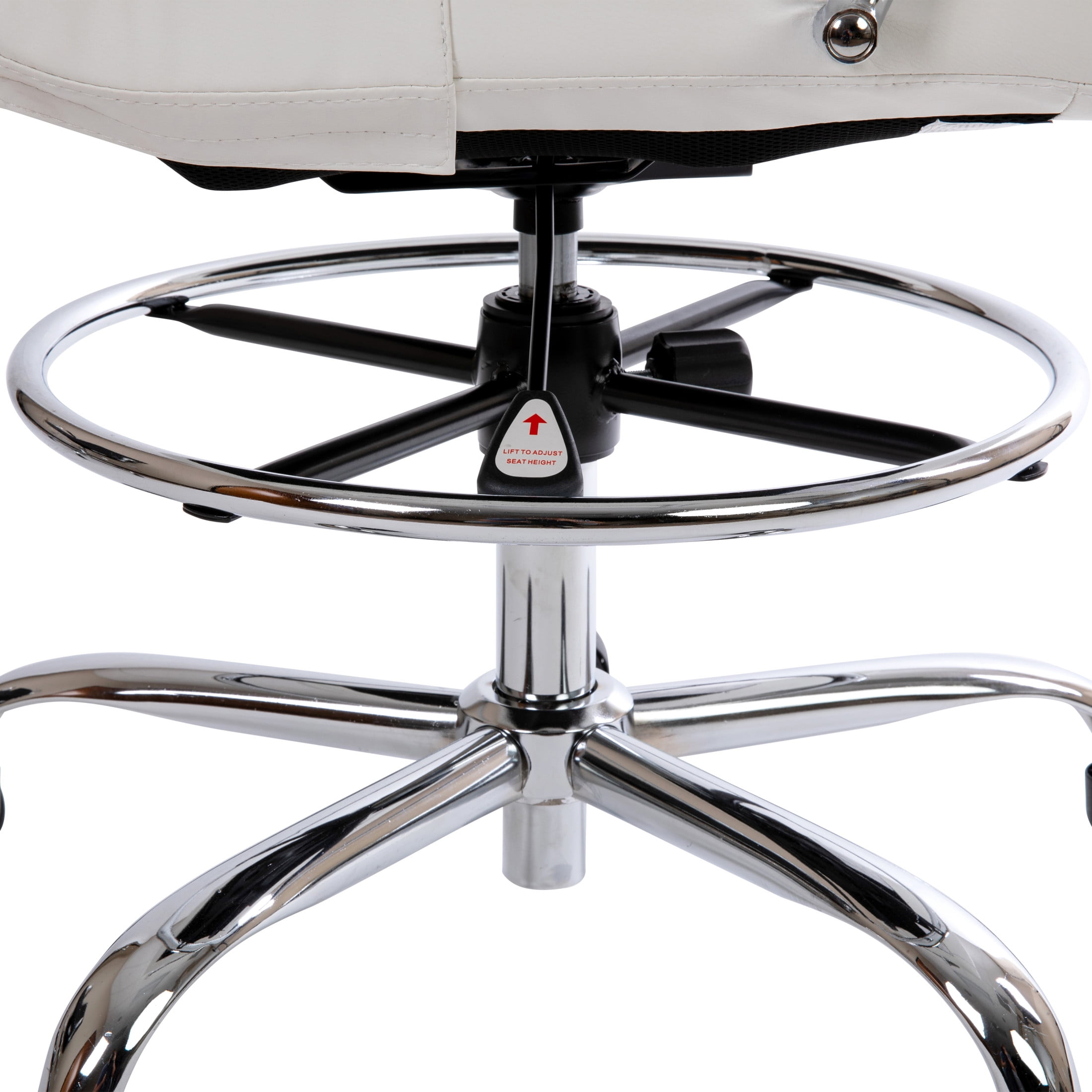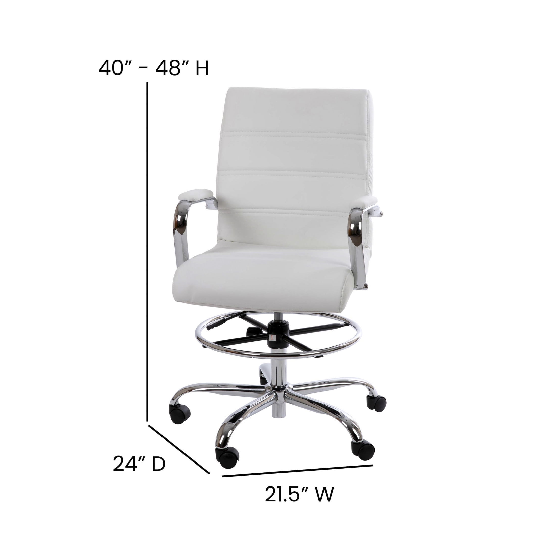 Flash Furniture Whitney Mid-Back Swivel LeatherSoft Drafting Chair with Foot Ring, White Great for offices, nail salons, retail stores, and at-home work desks Soft and durable mid-back LeatherSoft back and sleek metal base Attractive ribbed stitching boosts your desk area with modern style Ergonomic mid-back design with a thickly padded waterfall front seat Padded armrests and adjustable supportive foot ring provide all-day comfort Pneumatic height adjustable swivel seat Easy to assemble with included tools and step-by-step instructions Overall size: 21.5″W x 24″D x 40-48″H; Seat size: 19″W x 19″D x 22-30″H; Back size: 19″W x 20″H EASY TO ASSEMBLE: Measures 21.5″W x 24″D x 40-48″H and can be assembled quickly with the included tools and instructions; wipes clean with a damp cloth as needed