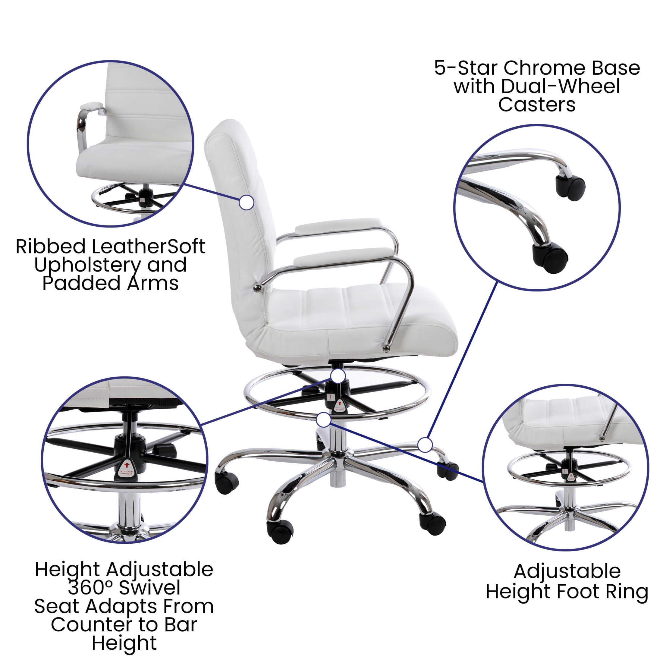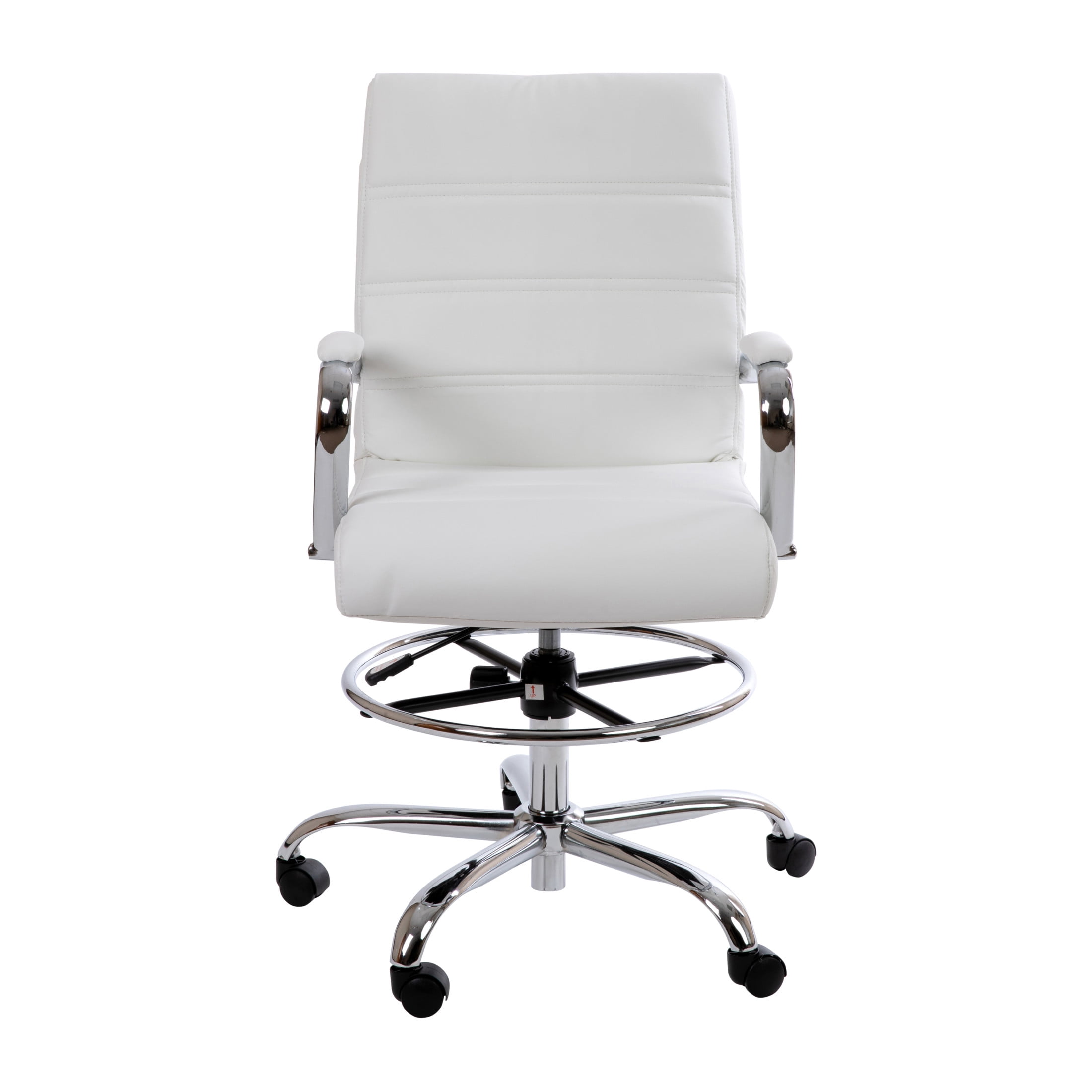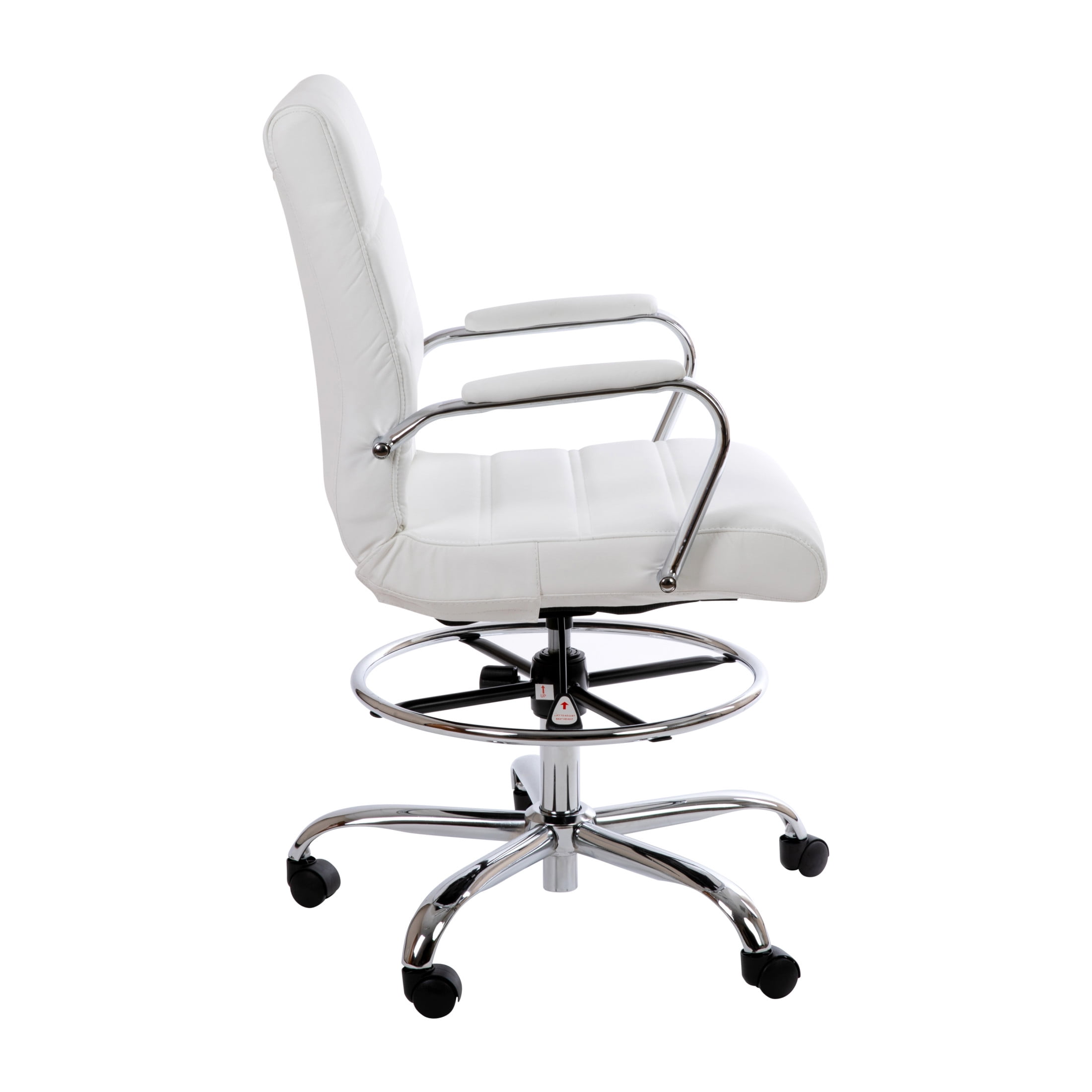 Amplify any office or workspace with the comfort and modern style of the Flash Furniture Whitney LeatherSoft Drafting Chair. This mid-back LeatherSoft swivel office chair adds stylish, comfortable seating to any work area to help busy workers or students achieve maximum comfort day after day while performing their work duties. Not only does this swivel desk chair work great for offices, it also thrives in nail salons, car shops, retail stores, at-home work desks, college dorm rooms, or student study spaces. It boasts a soft and durable mid-back white LeatherSoft back and seat paired with a sleek metal base and armrests all highlighted by an attractive ribbed stitching to effortlessly boost your desk or work area with modern style. The ergonomic mid-back design with a thickly padded waterfall front seat, padded armrests, and adjustable supportive foot ring allows each employee to take on long work days without discomfort. Additionally, the highly customizable chair features a pneumatic height adjustable 360-degreee swivel seat for easy maneuverability to create a comfortable, custom seating experience.