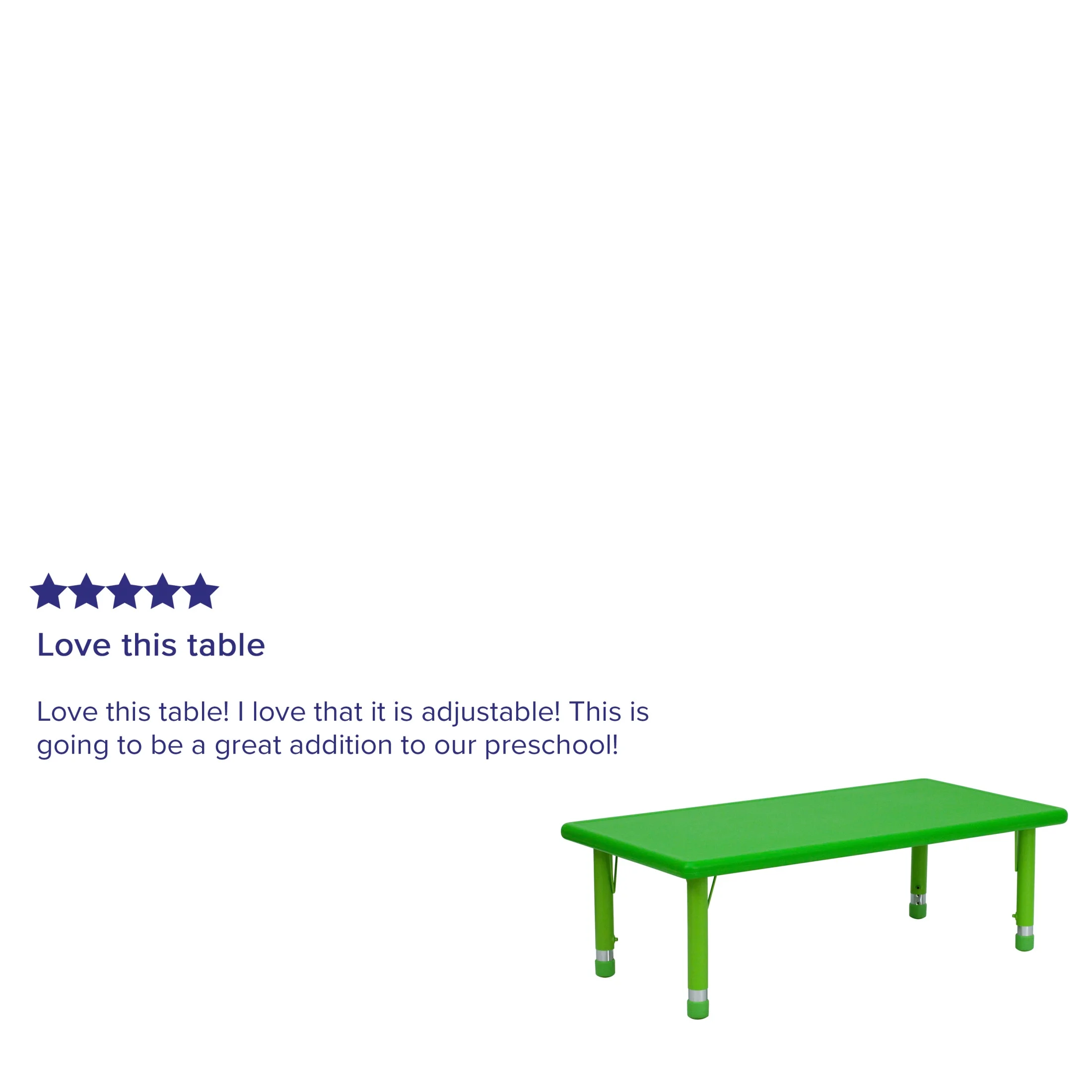 Flash Furniture Wren Rectangular Adjustable Kids Classroom Activity Table, 24″W x 48″L, Green Recommended for kids and toddlers up to the age of 7 Comfortably seats up to 6 children with plenty of room between each child Great for learning, playing, arts and crafts, meal time, homework, and much more Adjustable legs give you the flexibility to raise or lower table height 1.5″ thick textured top with plastic safety rounded corners Pairs with 6 stackable school chairs with a 6.5″ to 14″ seat height Protective plastic floor glides for easy mobility around the classroom Easy to clean – wipe down with a water-based cleaner as needed 220-lb. static load capacity Overall size: 24″W x 48″D x 14.5-23.75″H HOME OR SCHOOL USE: Measures 24″W x 48″D x 14.5-23.75″H and is applicable in the home and school environments, making it perfect for classrooms, playrooms, dining rooms, kids bedrooms, and daycares