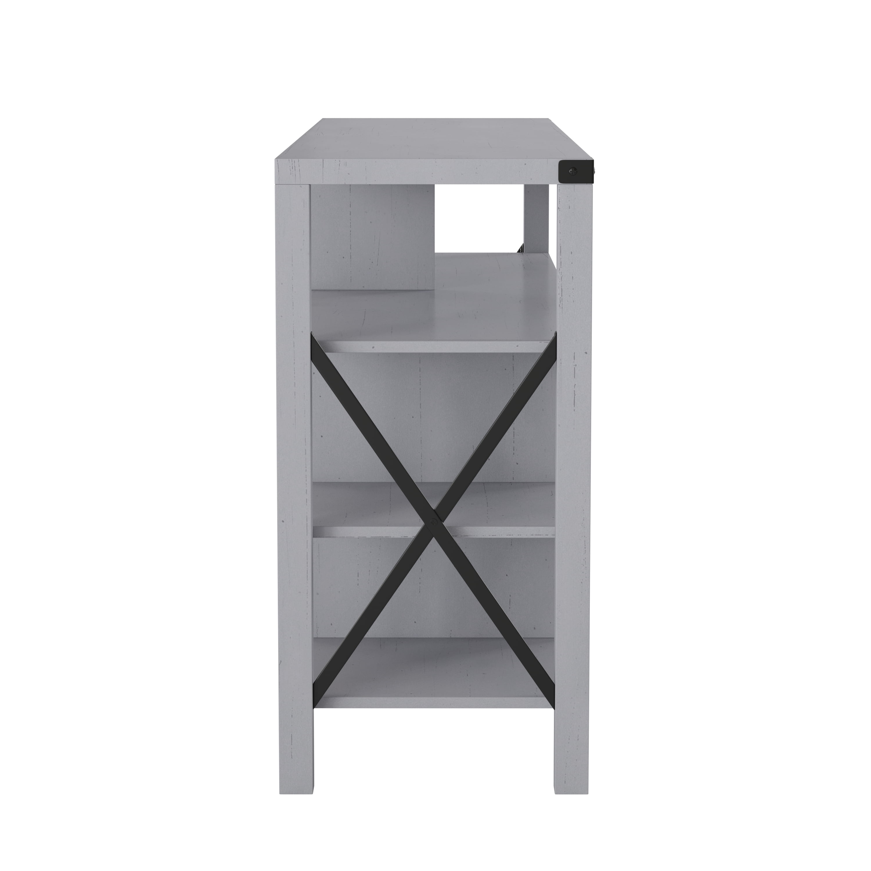 Flash Furniture Wyatt Farmhouse Television Stand for TVs up to 60″,Coastal Gray Modern Farmhouse 60 Inch TV stand with Storage Sleek Coastal Gray Wood Grain Finish Metal Cross Brace Sides Open Display Shelving with Adjustable Shelf Inside Cabinet Hold up to 25 LBS. Static Weight Each Wire Management Holes Keep Wires Neat and Tidy Console Constructed From Premium Engineered Wood and Holds up to 100 LBS. Static Weight Accommodates up to 60 Inch TV’s Flared Steel Legs with Fixed Floor Glides to Protect Flooring Surfaces Assembles in 60 Minutes or Less with Included Tools Wipes Clean with a Damp Cloth PRODUCT MEASUREMENTS: Overall Size: 60″W x 15.5″D x 31.75″H; Upper Shelf Size: 56.75″W x 15.25″D; Middle Shelf Size (2): 14.5″W x 14.5″D; Adjustable Shelf Size: 26.5″W x 14″D x 6″ – 10.5″H