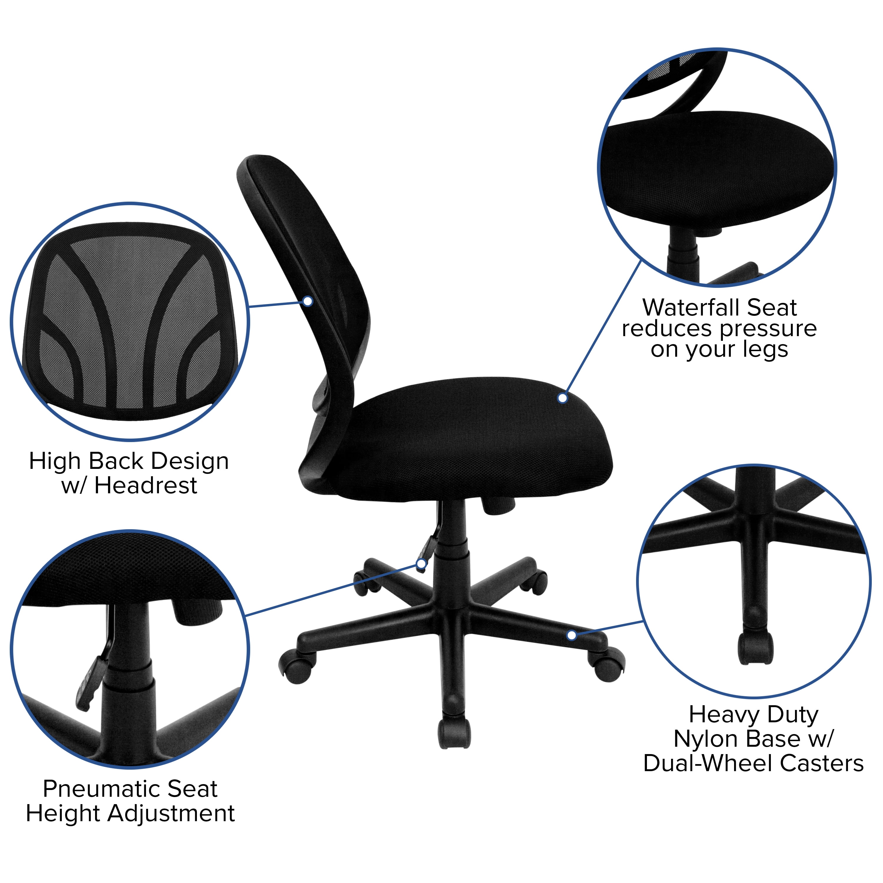 Contemporary Task Office Chair Mid-Back Design Flexible Mesh Back Built-In Lumbar Support Tilt Lock Mechanism rocks/tilts the chair and locks in an upright position, Tilt Tension Adjustment Knob adjusts the chair’s backward tilt resistance Padded Black Mesh Upholstered Seat with CAL 117 Fire Retardant Foam Waterfall Swivel Seat reduces pressure on your legs Swivel Seat Heavy Duty Nylon Base Dual Wheel Casters
