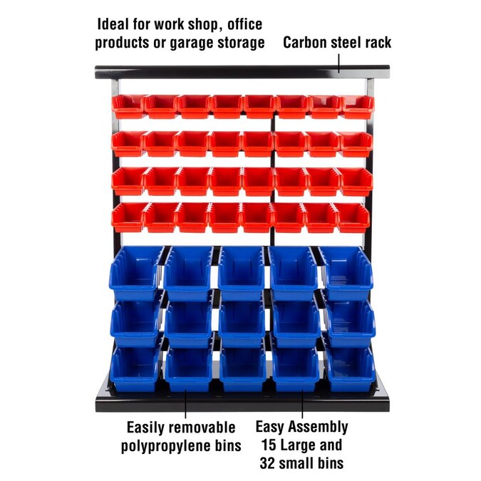 The 47 Bin Tool Organizer by Stalwart is an excellent organizational solution for your garage, home, or office. Constructed from strong and durable polypropylene plastic and carbon steel, this small parts organizer and organization bins are made to last. With 15 large and 32 small garage storage bins, you can easily store and organize anything from parts, hardware, tools, and office supplies, to crafting supplies, toys, or home goods. Whether you set this hardware organizer on top of a workbench or mounted on a wall, it’s the perfect option to keep your gear or accessories neatly sorted and tidy.