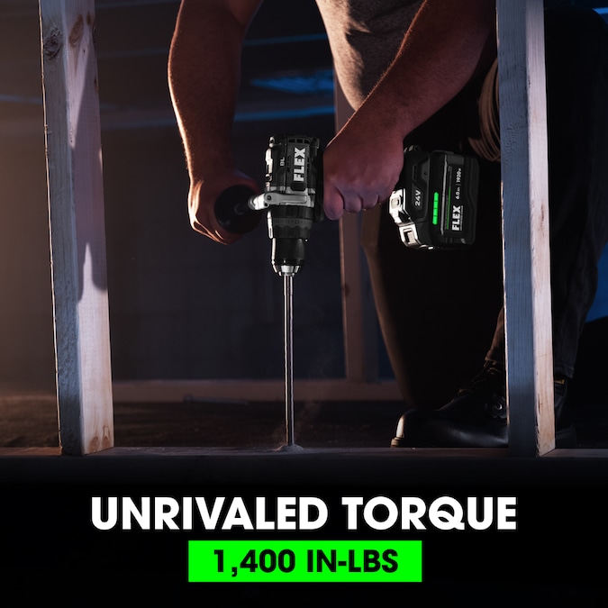 The FLEX 24V ½” 2-Speed Hammer Drill with Turbo Mode dominates drilling applications with industry-leading torque (1,400 in-lbs). Durable tool construction further ensures you’re equipped for the long haul. Built-in LED lighting adds visibility in dark spaces. Anti-kickback protection detects tool jams letting you work confidently. This driver also delivers the FLEX Advantage of unmatched battery power, runtime, and faster charging (battery and charger sold separately). Protected by the FLEX Limited Lifetime Warranty when registered within 30 days of purchase at registermyFLEX.com through December 31, 2024.