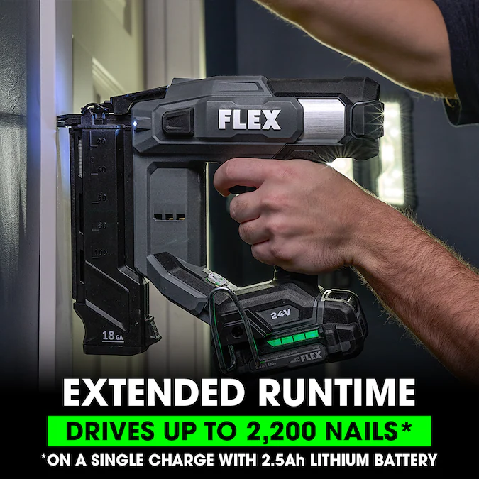 Power through finishing jobs without the hassle of hoses and compressors with the FLEX 24V Brushless 18Ga Brad Nailer. This cordless brad nailer delivers high-speed power by driving up to 3 nails per second with zero ramp up time. It drives up to 2,200 nails on a single charge with a 2.5Ah lithium-ion battery (sold separately) for extended runtime. The nail gun features an ergonomic quick depth adjustment lever to easily set the ideal nailing depth when driving fasteners, and its triple LED light delivers shadow-free illumination for better visibility in dark work areas. The cordless nail gun toggles between bump and sequential firing modes and has a nail indicator to easily see how many nails remain in the magazine. Dry-fire lockout avoids blank firing and damage to your work when the nail supply is exhausted. Tool-free jam clearance allows you to quickly clear jammed nails without tools for maximum efficiency when you’re on the job. The cordless nailer is compact and lightweight to conquer tight spaces with minimal fatigue. Its heavy-duty belt clip can be mounted on either side of the tool and features a lead-in profile. The finish nailer accepts 5/8-inch to 2-1/8-inch 18-gauge fasteners. This cordless nailer delivers the FLEX Advantage of unmatched battery power, runtime, and fast charging (batteries and chargers sold separately). It’s all protected by the FLEX Limited Lifetime Warranty when registered within 30 days of purchase at registermyFLEX.com through December 31, 2024.