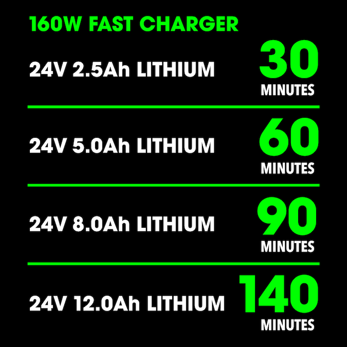 - Package Contents: 24V 2.5Ah battery, 24V 160W charger