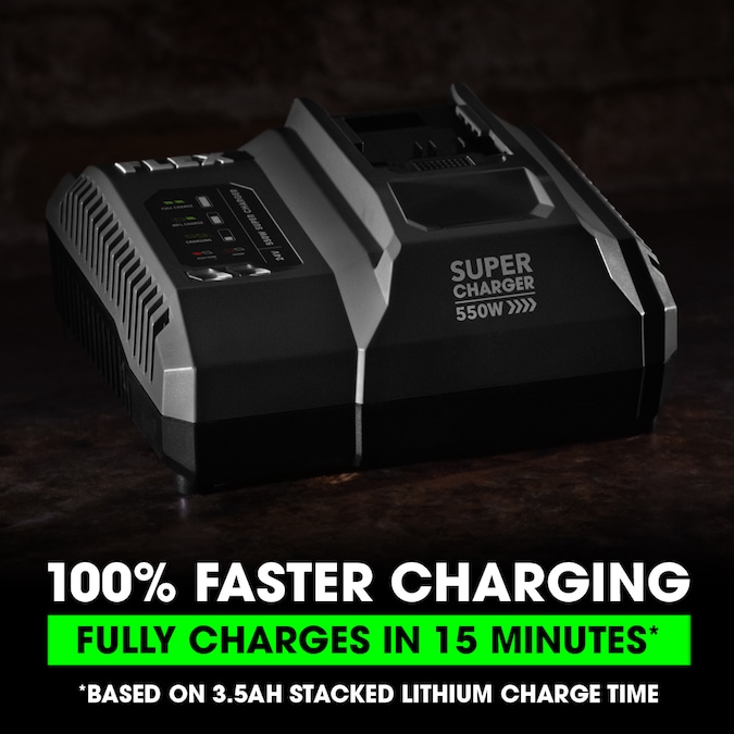 - 100% FASTER CHARGING+ – Fully charges in as little as 15 minutes, based on 3.5Ah Stacked Lithium charge time