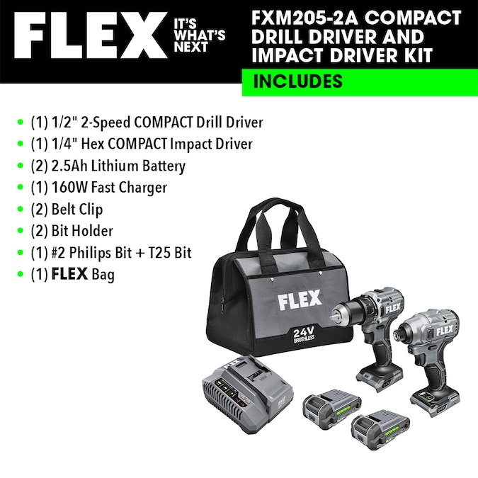 - COMPACT DRILL DRIVER AND COMPACT IMPACT DRIVER COMBO KIT – Includes a compact drill driver, compact impact driver, (2) 2.5Ah batteries, and a 160W Fast Charger