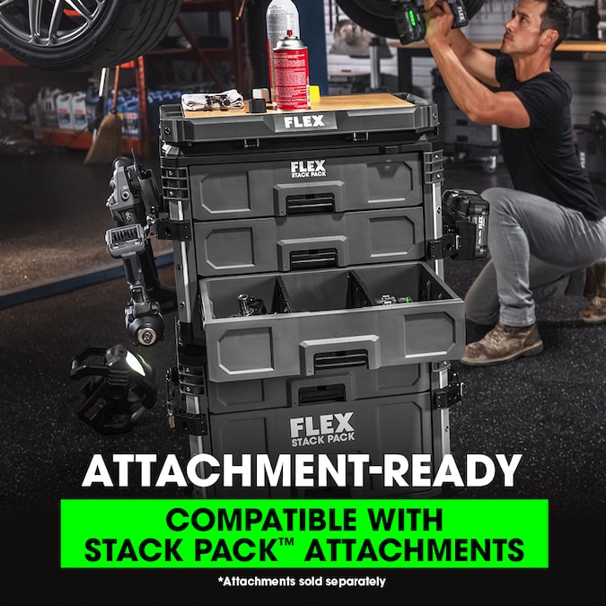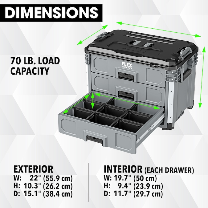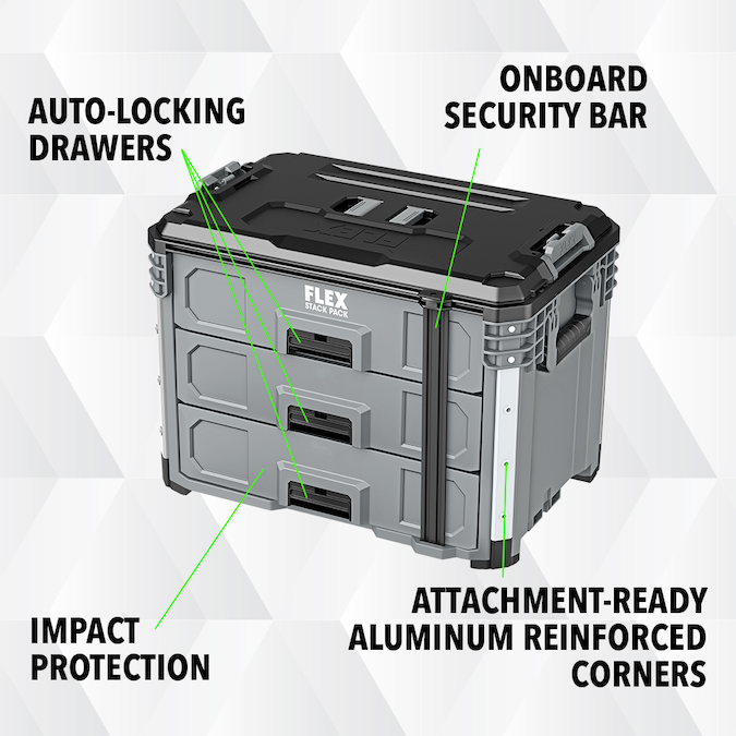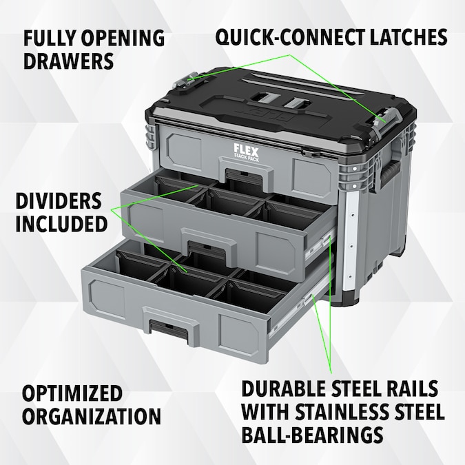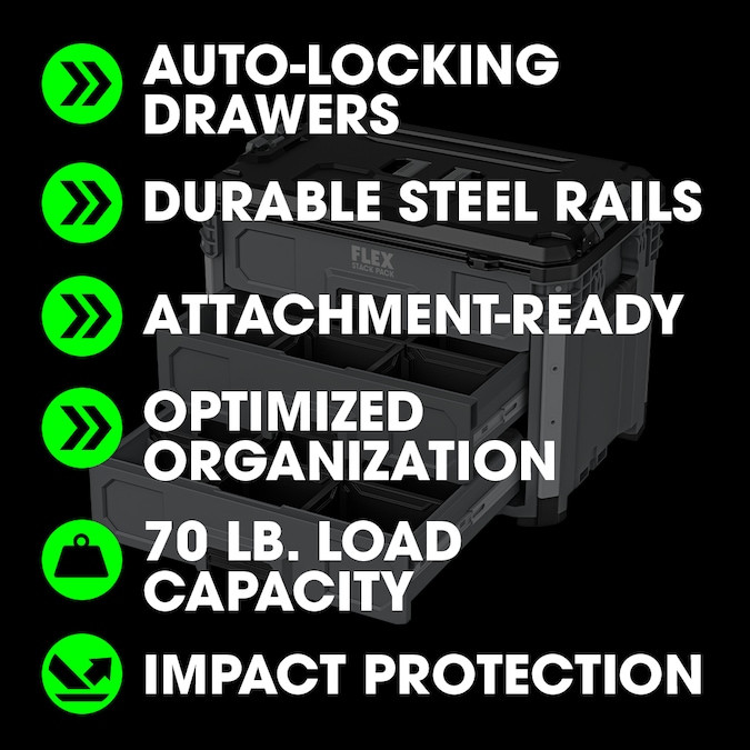 Keep your trailer, garage, or workshop organized with the FLEX STACK PACK™ 3-Drawer Tool Box. This three-drawer toolbox features auto-locking mechanisms that securely close and prevent drawers from opening during transport while durable rust-resistant rails ensure the drawers open and close smoothly over a long life. The drawers are optimized for compact tools like impact wrenches and reciprocating saws and come with removable dividers in each drawer so you can organize a variety of hardware or supplies. Quick-connect latches offer fast and effortless connectivity so you can quickly stack and unstack toolboxes for a fully customized STACK PACK™ configuration. An onboard security bar allows you to lock the drawers to prevent theft and stows between use. It’s protected by a one-year limited warranty when registered within 30 days of purchase at registermyflex.com.