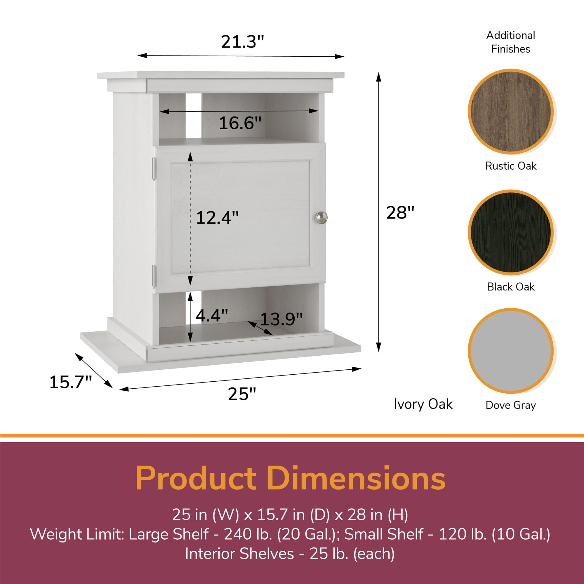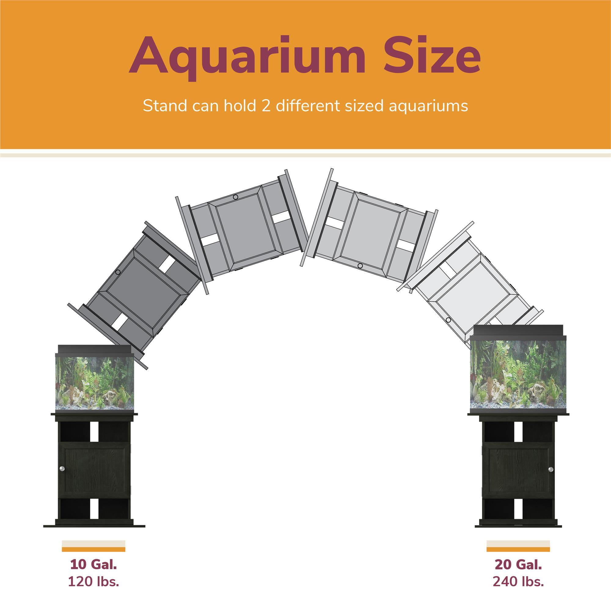 Get an Aquarium or Terrarium Tank Stand for all your plant, aquatic, reptilian, or amphibian friends with the Flipper by Ollie & Hutch Flipper(tm) 10/20 Gallon Aquarium or Terrarium Tank Stand Made of laminated MDF and particleboard, the black oak woodgrain finish gives the Stand a classic look Unique patent design can support a 10 gallon stand on one end or a 20 gallon stand on the opposite end. Tank is not included Open and concealed storage can hold all of your nets, cleaning equipment, and food The Stand ships flat to your door and 2 adults are recommended to assemble. Stand can support 10 gallon tanks up to 120 lbs. or 20 gallon tanks up to 240 lbs. Assembled dimensions: 28″H x 25″W x 15.6875″D 1-Year Limited Warranty Included