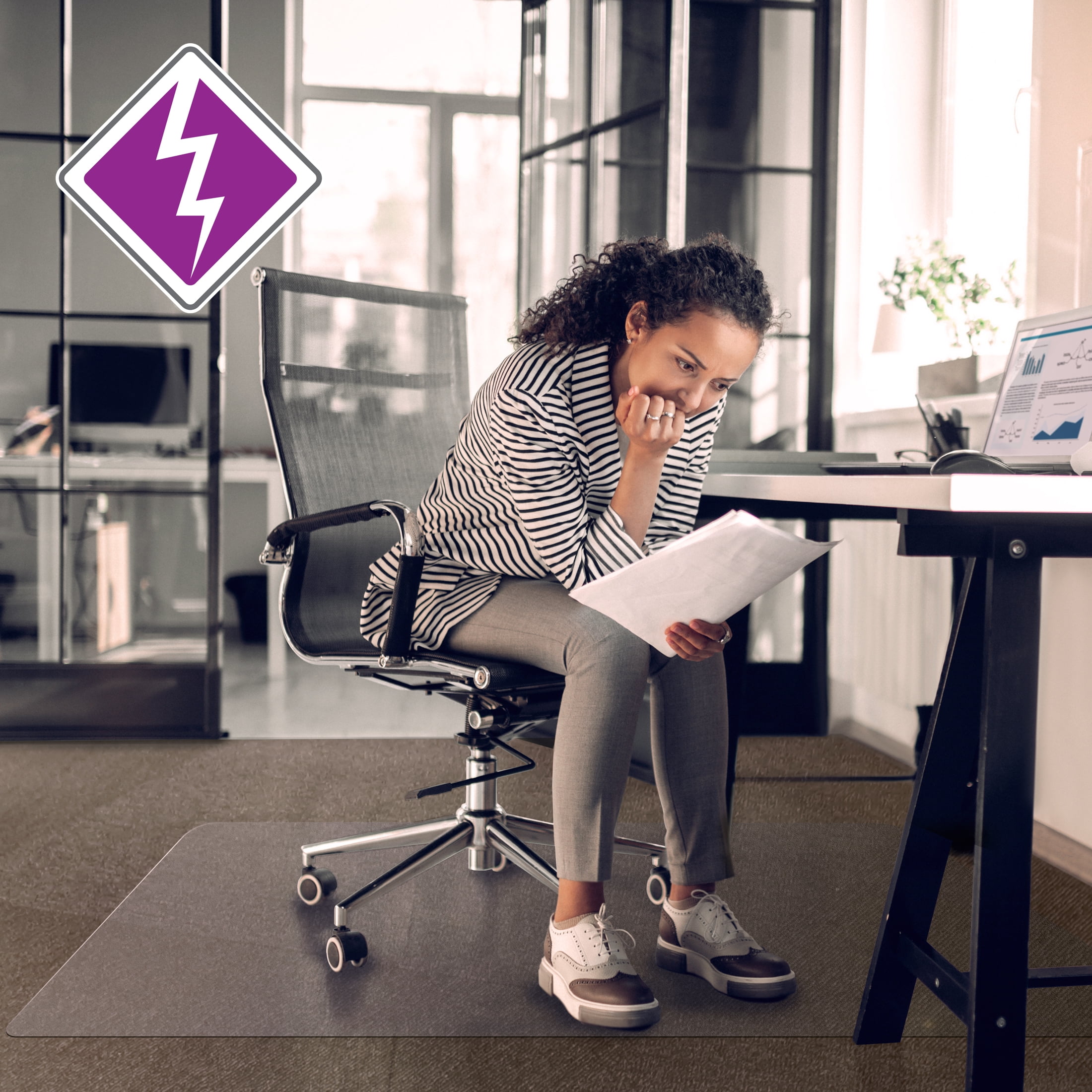 Computex anti-static chair mats provides a high quality and durable solution for floor protection and ergonomics. The active anti-static content helps to protect electrical equipment from the damaging effects of static. Protects your carpet surfaces from office chair casters, general wear, scuffs and spills. Will to crack, chip, break or shatter under normal use and correct application. Free of phthalates, tin, lead, cadmium and BPA for peace of mind when used around children or pets. Eco-friendly manufacturing with 50% of our manufacturing site’s energy coming from on-site and external renewable sources. Contains up to 25% recycled content. 100% recyclable.