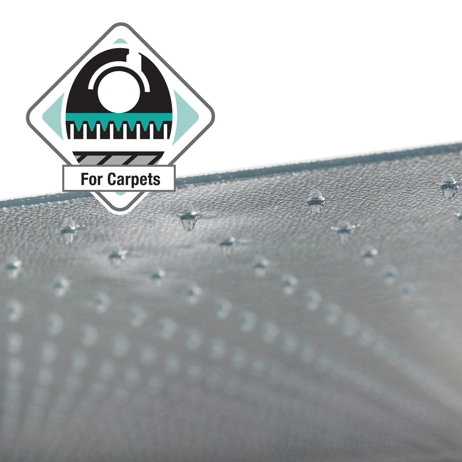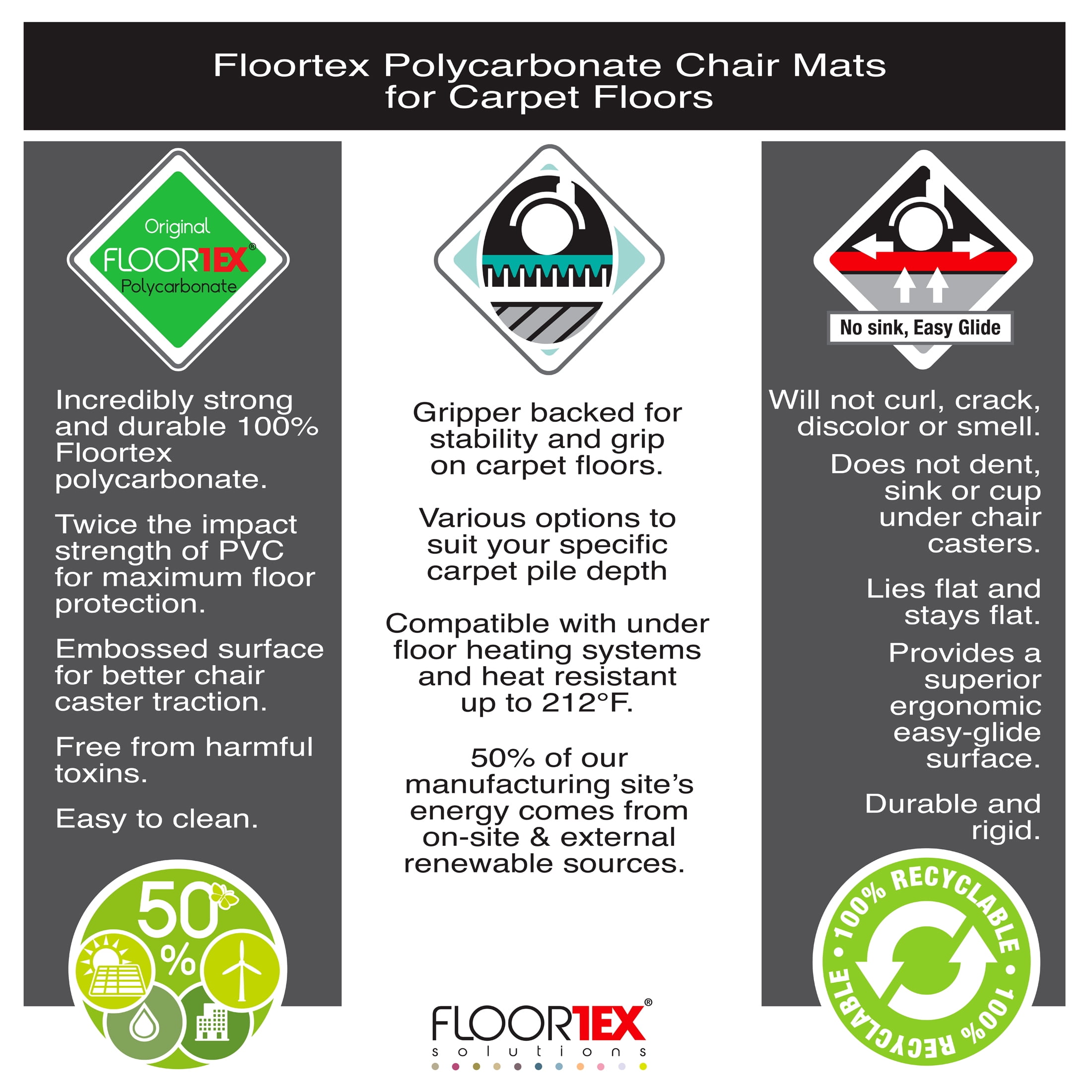 Made from original Floortex polycarbonate. Our premium plastic mats are incredibly tough and durable with twice the impact strength of vinyl to provide a perfectly flat and rigid ergonomic easy glide roll surface. Material is used in aircraft windscreens and bulletproof glass Corner workstation office chair mat protects your carpeted floors from general wear and damage caused by casters on rolling chairs Our clear Polycarbonate floor protector will not sink, crack, curl, cup, discolor or smell. The high clarity allows flooring to show through for an attractive and highly effective addition to your office or home environment Lies instantly flat from delivery for immediate and effective use. No need to wait for the mat to flatten. Compatible with under floor heating systems Eco-friendly manufacturing with 50% of our manufacturing site’s energy coming from on-site and external renewable sources. 100% recyclable. Free from Phthalates, tin, lead and cadmium. Child and pet safe. GreenGuard certified Please note, due to the manufacturing process this product has a +/- 5% size tolerance. All measurements are rounded to the nearest inch Gripper back for use on low to medium pile carpets (up to 1/2″). Not suitable for hard floor applications. Product Size – Corner Workstation 48″ x 60″