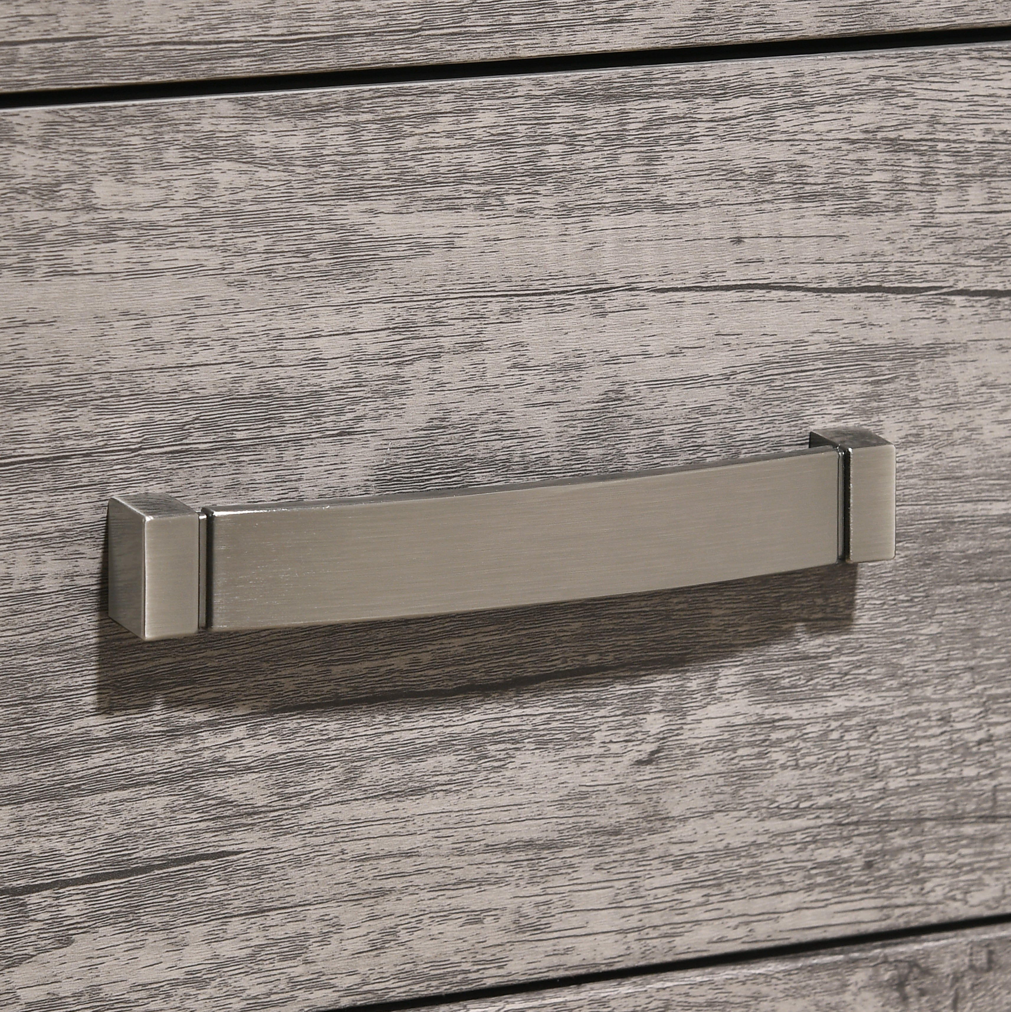 Features sleek, clean silhouette in a weather gray finish with wood grain pattern Drawer fronts feature metal pull finished in brushed nickel 6 spacious English dovetail construction drawers with sturdy metal kelin drawer glides Fully assembled Dimension: 59.06″W x 16.65″D x 37.13″H