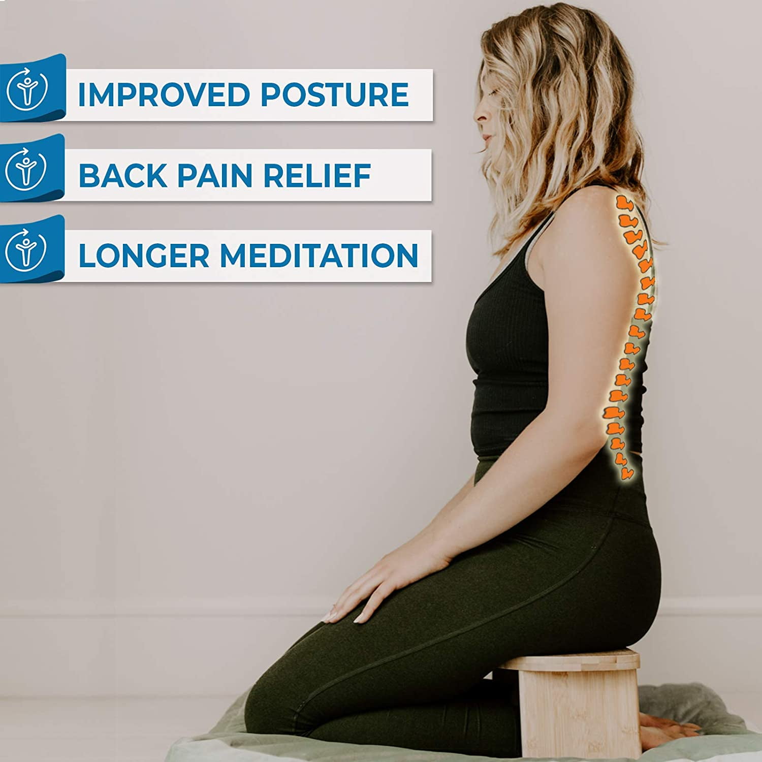 Dimensions: 18″ x 7″ x 6″ Sturdy bamboo construction Foldable / collapsible for storage Ideal for yoga, deep meditation, kneeling, extended sitting, better posture High-quality blue fabric cushion is durable and skin-friendly Backless seating provides excellent support and pressure relief on knees, ankles and legs