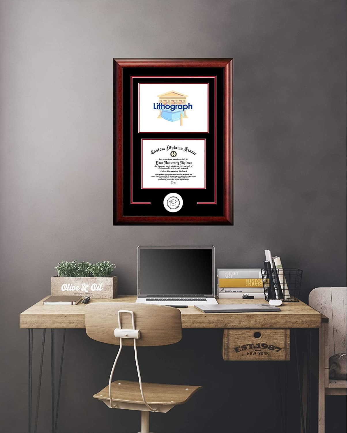 Classic satin mahogany spirit diploma frame with Campus Images lithograph. School logo in matting. School colors are used for matting. Custom made to fit any diploma size.