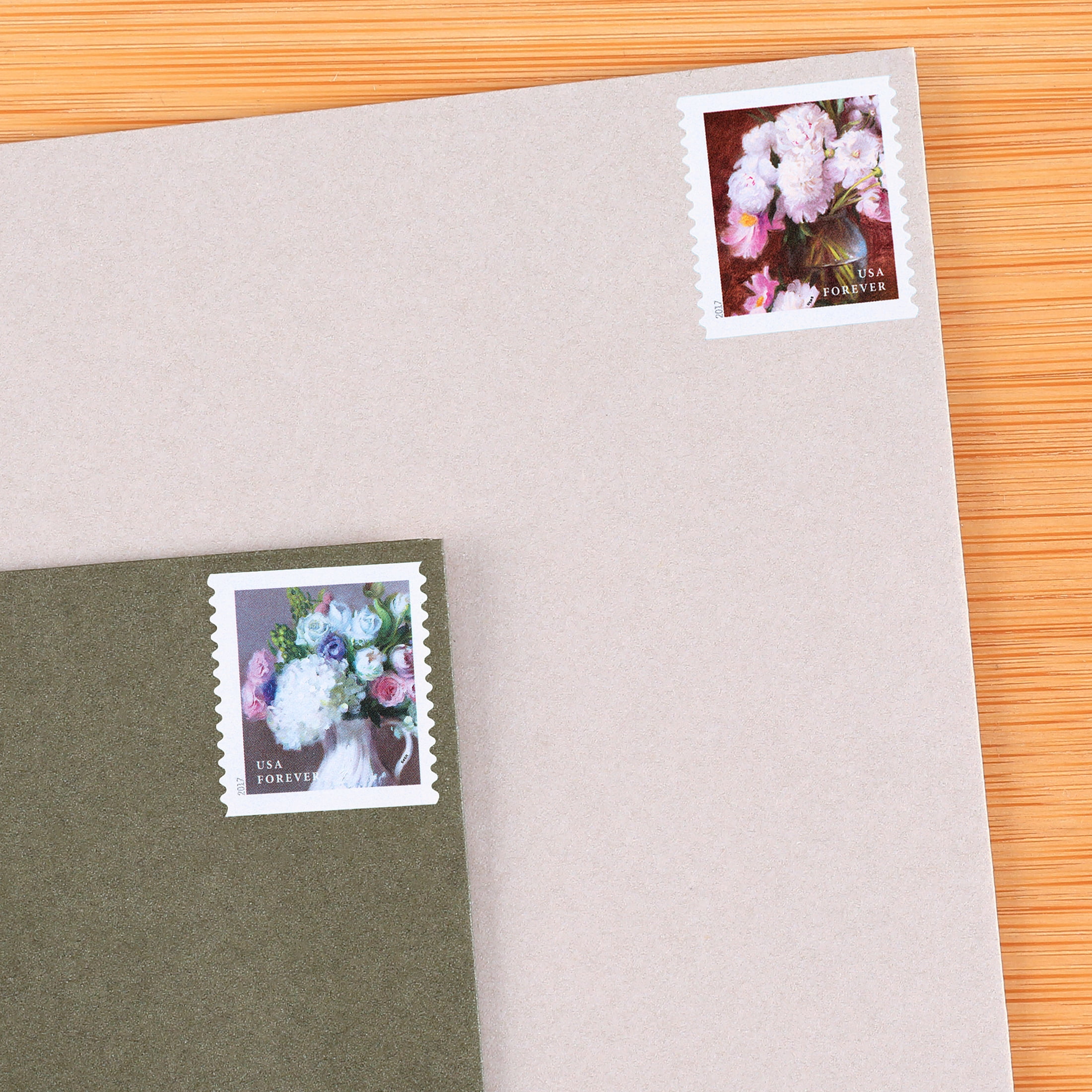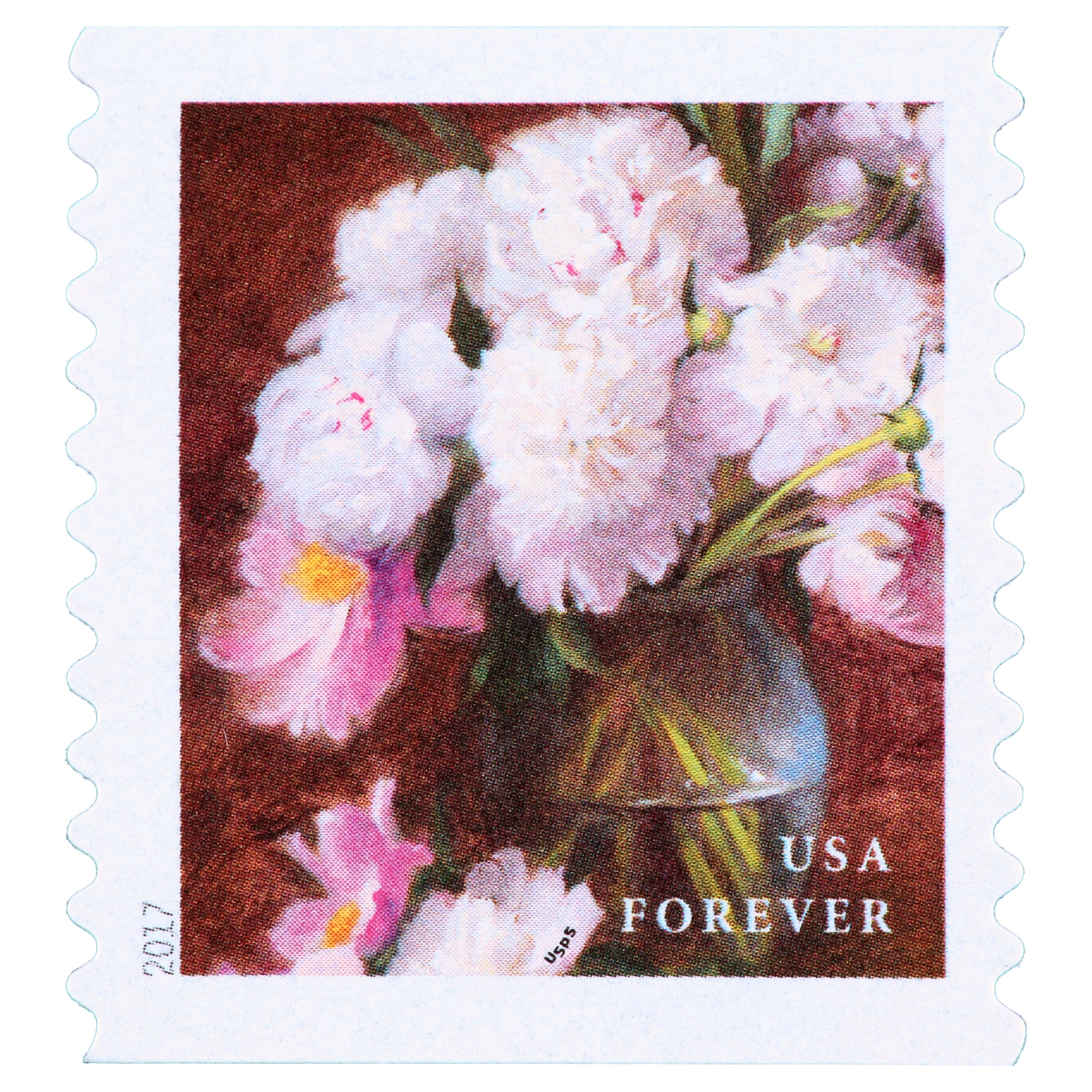 The U.S. Postal Service celebrates the beauty of flowers from American gardens. The four stamps feature still-life paintings of bountiful floral bouquets. The paintings were inspired by floral still lifes created by Dutch and Flemish artists of the 17th and 18th centuries. Each stamp features one of four different paintings of flowers gathered from the garden and artfully arranged in a container. One stamp features red camellias and yellow forsythia in a yellow pitcher, while on another there are white peonies and pink tree peonies in a clear vase. An arrangement of white hydrangeas, white and pink roses, green hypericum berries, and purple lisianthus in a white vase graces another stamp, while blue hydrangeas in a blue pot appear on another. The floral paintings of the Dutch and Flemish artists featured exuberant, massed arrangements, which gave the impression of wild abandon and impromptu creativity. However, the arrangements were in reality carefully thought out and many times purely imaginary and frequently botanically impossible. Though they looked as if they had just been plucked from the garden, the bouquets might include flowers that did not bloom during the same season or sometimes even grow in the same country. Art director Derry Noyes designed the stamps with existing art by Elizabeth Brandon. Flowers from the Garden is being issued as a First-Class Mail Forever booklet of 20 stamps. These Forever stamps will always be equal in value to the current First-Class Mail one-ounce price.