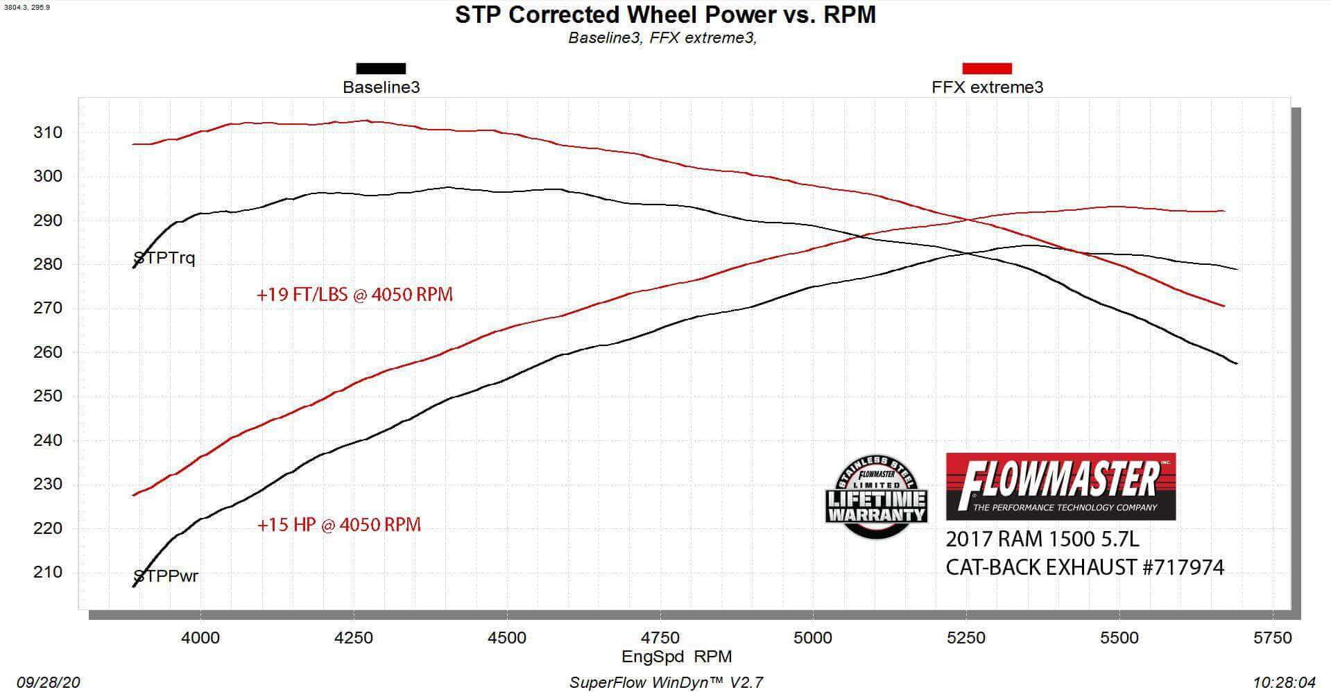 Compatible with 2009-2024* (2019-2024 Classic models only) Ram 1500 models with the 5.7L and 2009-2013 Ram 1500 with the 4.7L engine.; Flowmaster introduces our new FlowFX Extreme stainless steel cat-back exhaust system for the 2009-2024* (2019-2024 Classic models only) RAM 1500 with the 5.7L engine, as well as 2009-2013 with the 4.7L engine. This system uses a FlowFX series muffler for a deep powerful sound and increased performance. 3.0-inch mandrel bent 409 stainless steel tubing is used for maximum exhaust flow and durability. The system has a turndown style dump exit right after the muffler to eliminate the over-axle tailpipe. This elimination of the tailpipe helps to improve ground clearance and departure angle when you are driving in more extreme off-road situations. All of the necessary hardware is included and factory mounting locations are used for an easy installation. Backed by Flowmaster’s Lifetime Limited Warranty.;