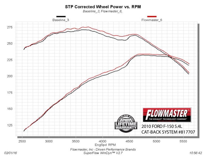 Compatible with 2009-2014 Ford F-150 trucks with 4.6L, 5.0L and 5.4L engines.; The new Flowmaster Outlaw Extreme Cat-back exhaust system is for 2009-2014 Ford F-150 trucks with the 4.6L, 5.0L, and 5.4L engines. Do you like attention and want to be heard? These kits deliver the ultimate in aggressive sound by using a 3.00 in. race-proven Outlaw muffler and a 3.00 in. mandrel-bent dump-style turndown for a very deep aggressive sound both inside and outside the truck. The system fits both 2 and 4 wheel drive trucks, and all wheelbases. Constructed with durable 409S stainless steel and uses the factory hanger locations, so installation is a breeze. The system is covered by our Lifetime Limited Warranty and includes all of the necessary hardware for a quick and easy installation you can do at home.;
