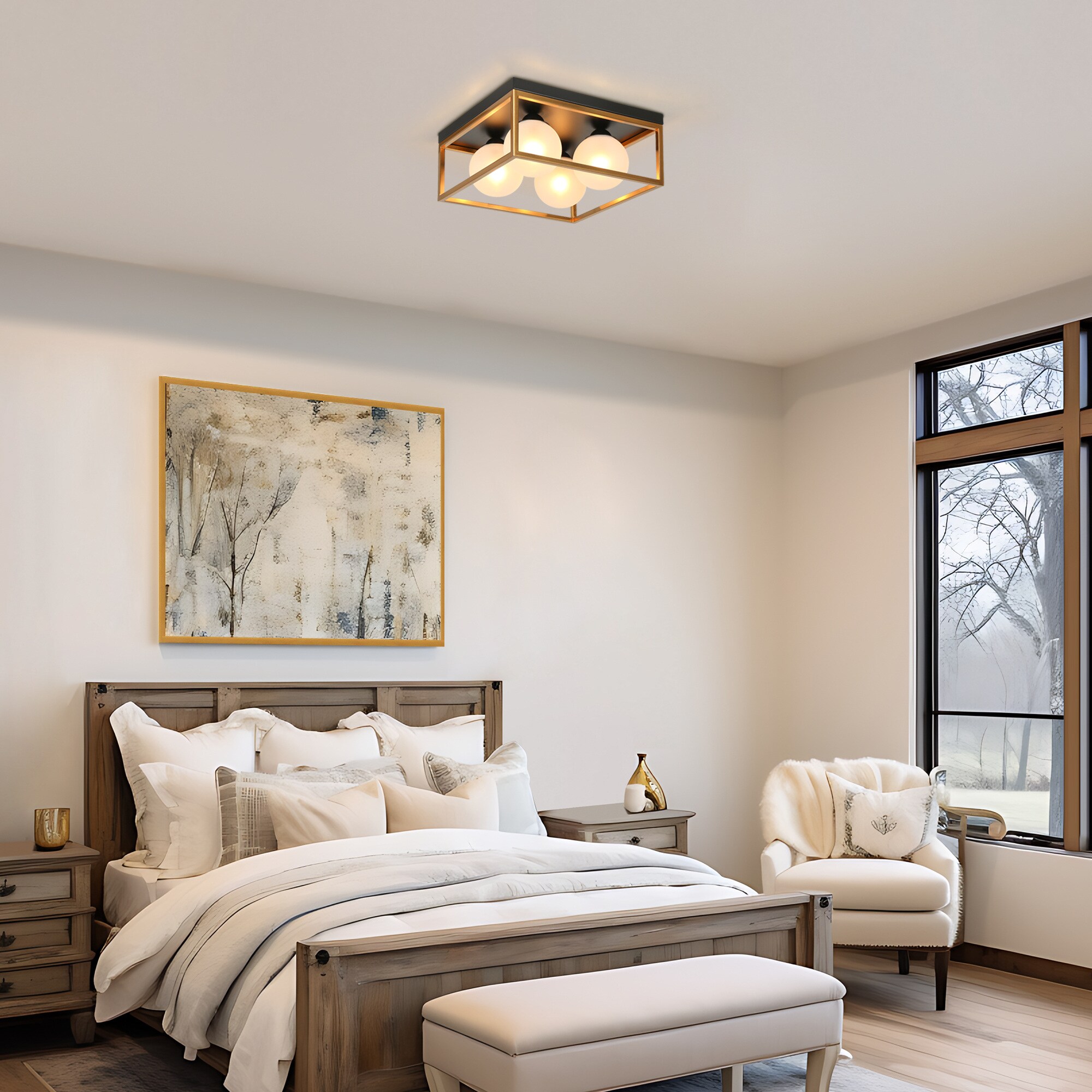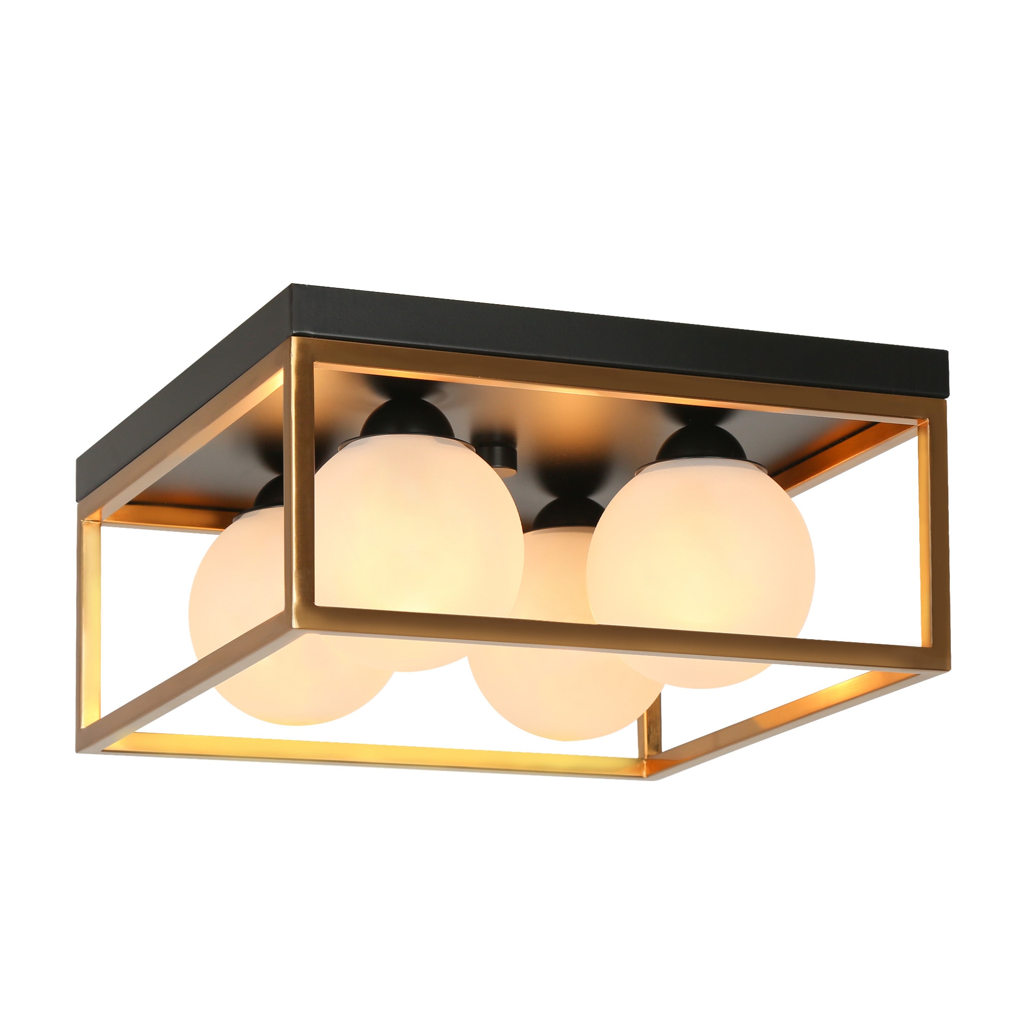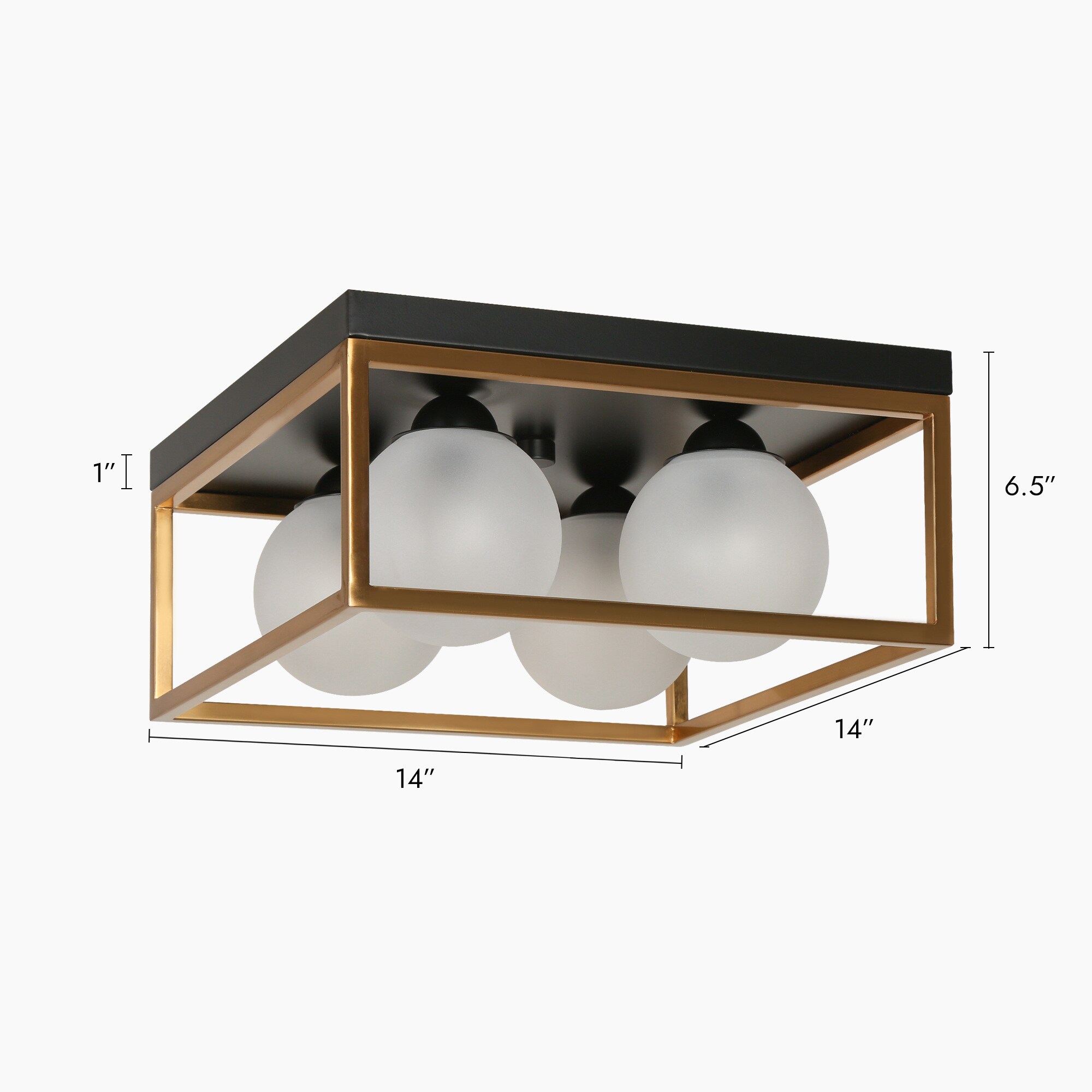 Introducing the perfect addition to your home decor, the 4-light flush mount light. This stunning fixture features a modern farmhouse design, making it a versatile choice for contemporary, modern farmhouse, mid-century modern, transitional, and traditional style home decor. The matte black and plating brass finish gives it a sleek and stylish appearance that is sure to impress. The light fixture comes with a square metal frame, adding a touch of elegance and sophistication to any room. The four frosted globe glass shades add a soft and warm glow, providing ample lighting for any space. Additionally, the light fixture is dimmable when used with compatible dimmer switches, which are not included. This black gold ceiling light is perfect for adding a touch of elegance to any foyer, hallway, or entryway. The modern farmhouse flush mount light is easy to install and provides a subtle yet sophisticated look to your home. Its minimalistic design allows it to complement any color scheme or decor style.
