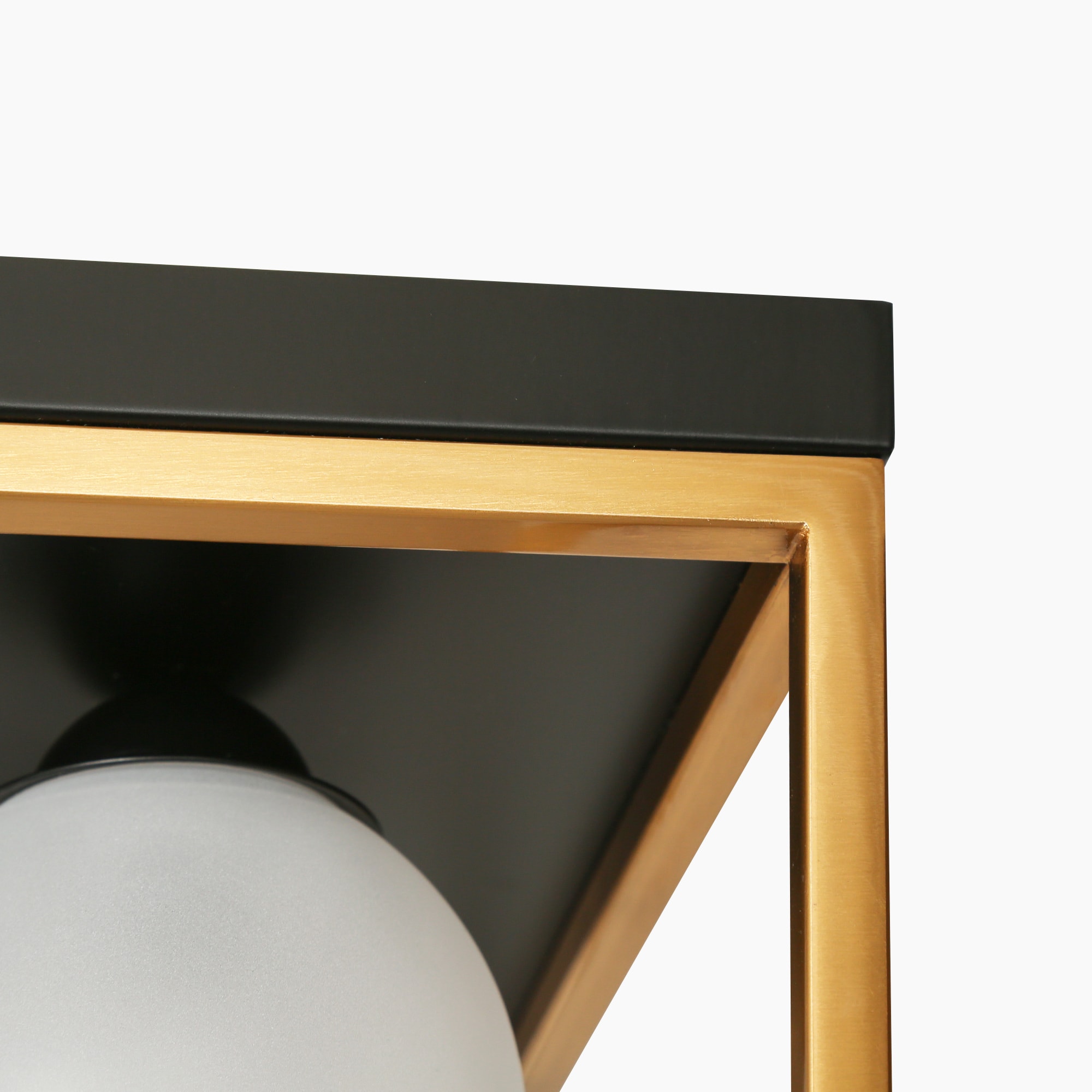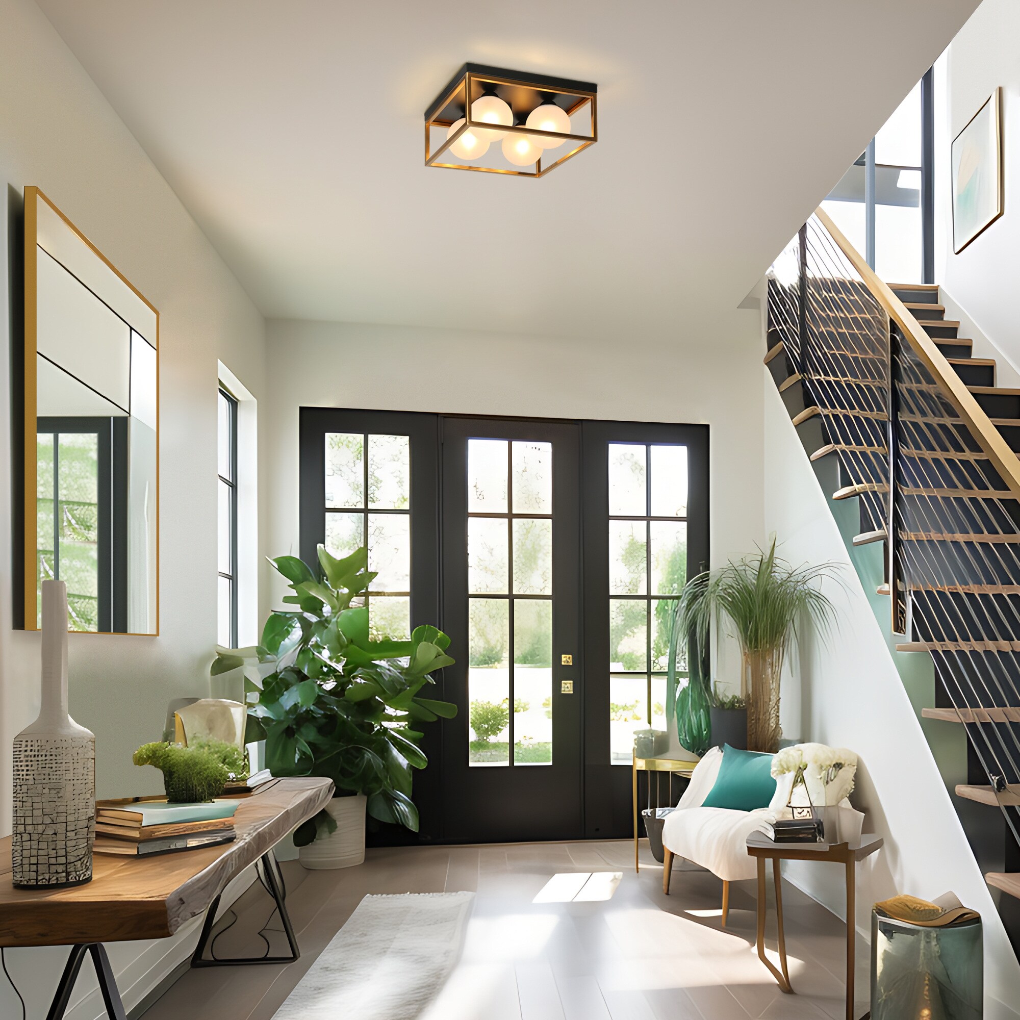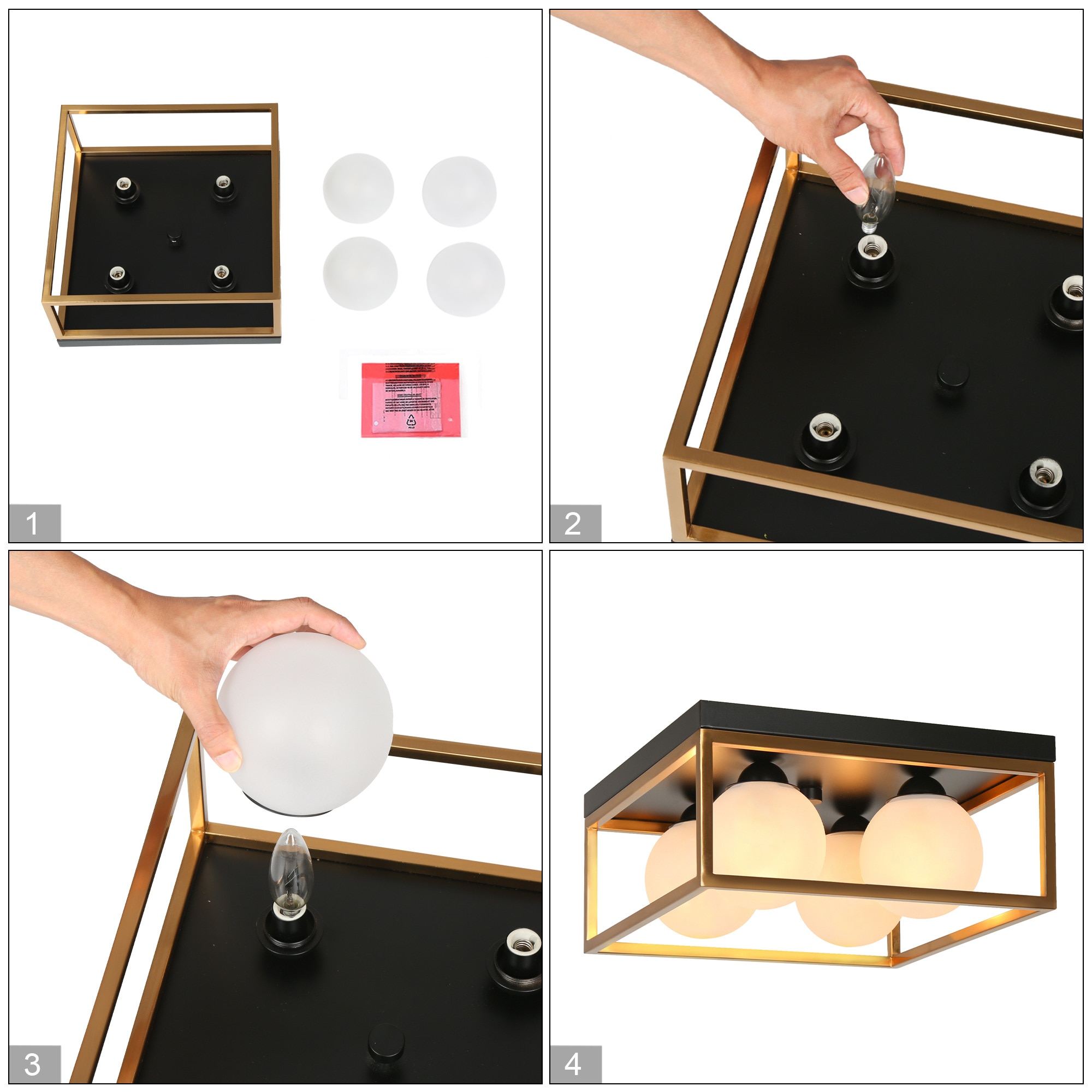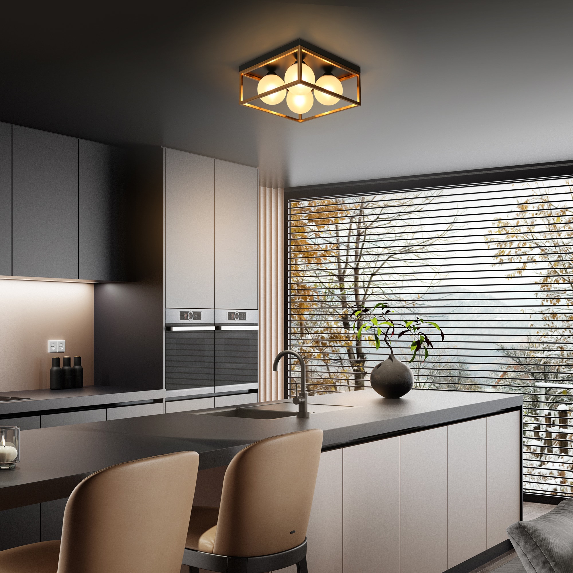 Introducing the perfect addition to your home decor, the 4-light flush mount light. This stunning fixture features a modern farmhouse design, making it a versatile choice for contemporary, modern farmhouse, mid-century modern, transitional, and traditional style home decor. The matte black and plating brass finish gives it a sleek and stylish appearance that is sure to impress. The light fixture comes with a square metal frame, adding a touch of elegance and sophistication to any room. The four frosted globe glass shades add a soft and warm glow, providing ample lighting for any space. Additionally, the light fixture is dimmable when used with compatible dimmer switches, which are not included. This black gold ceiling light is perfect for adding a touch of elegance to any foyer, hallway, or entryway. The modern farmhouse flush mount light is easy to install and provides a subtle yet sophisticated look to your home. Its minimalistic design allows it to complement any color scheme or decor style.