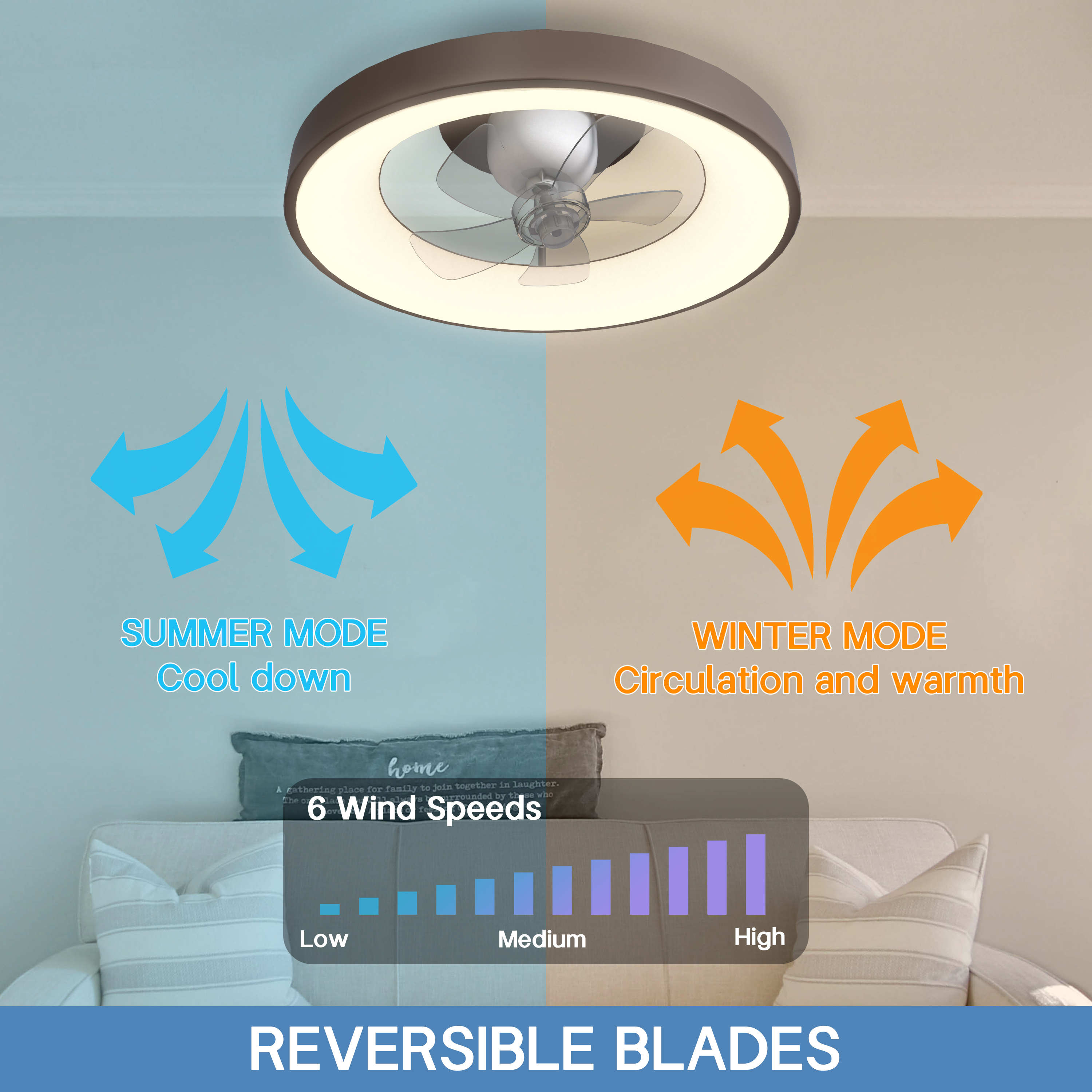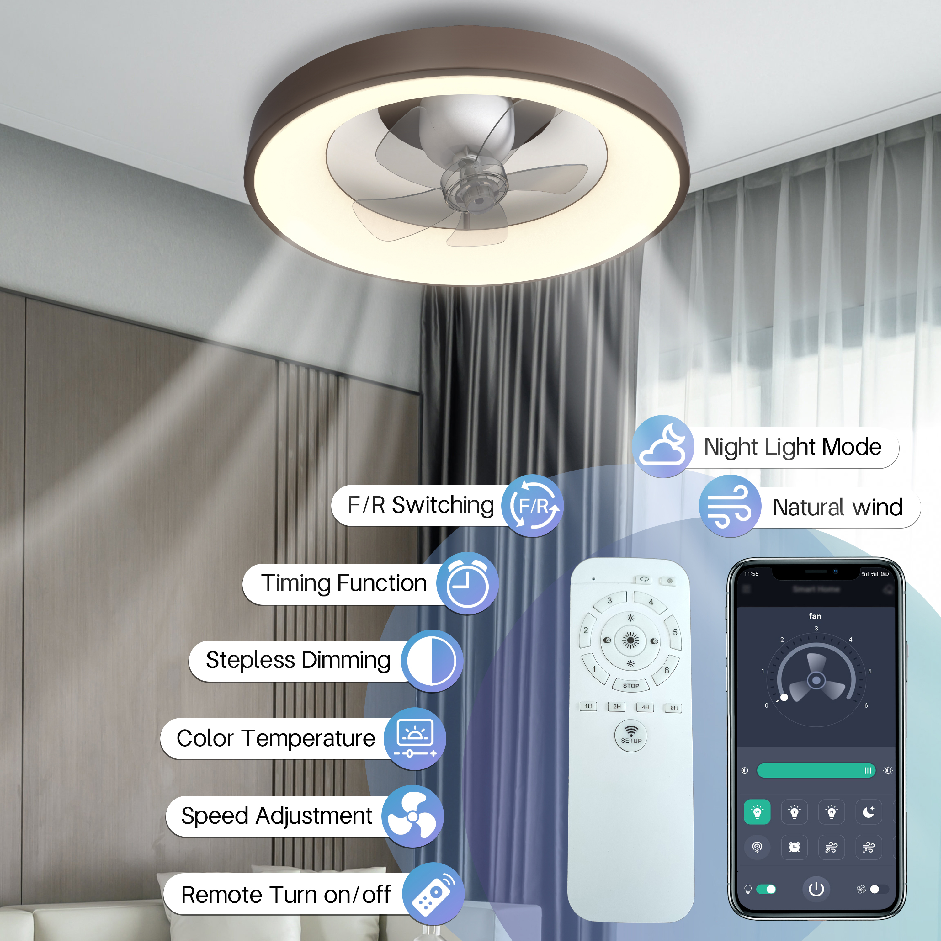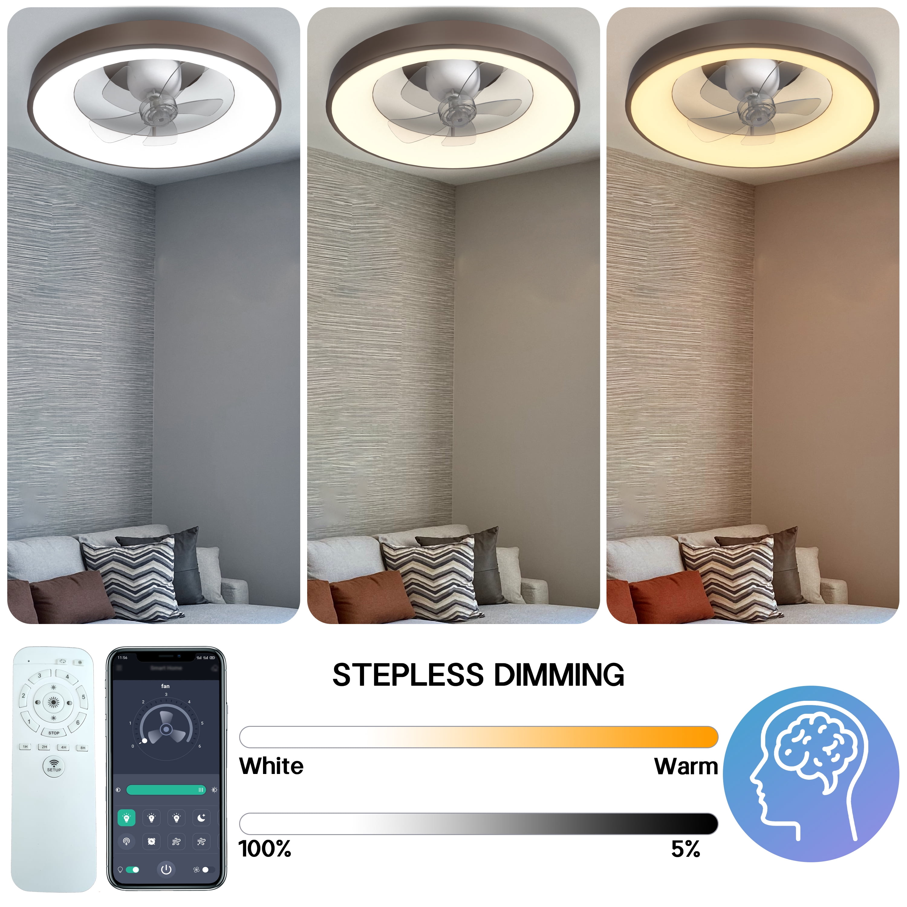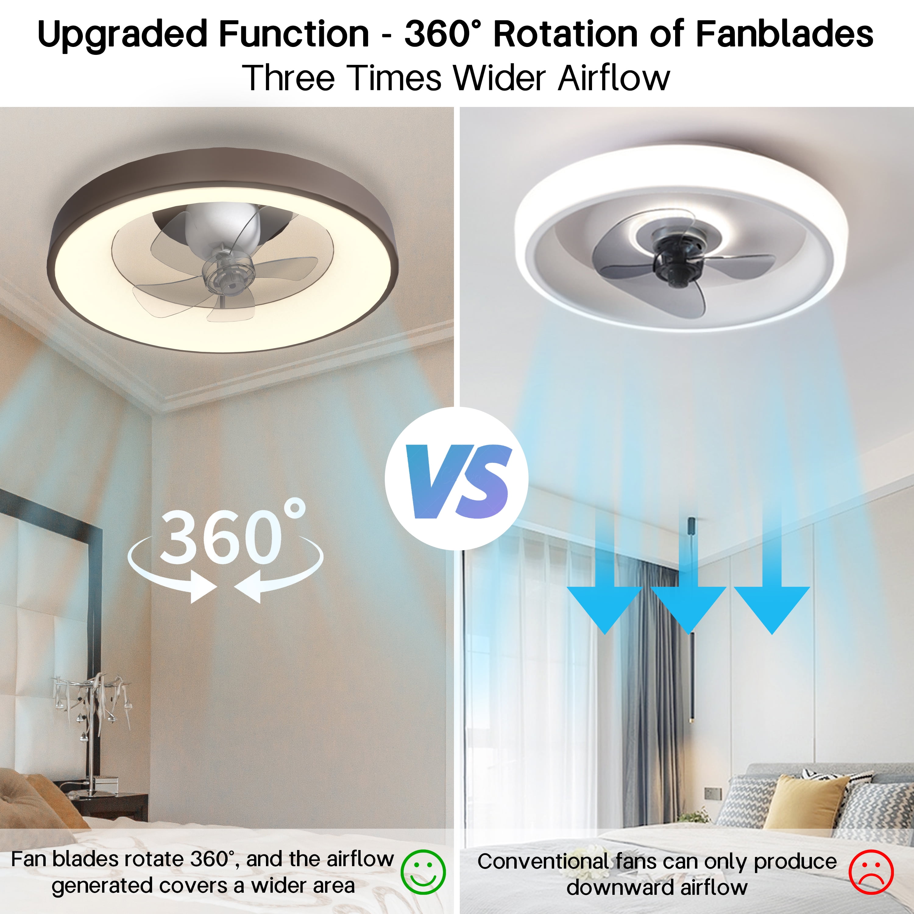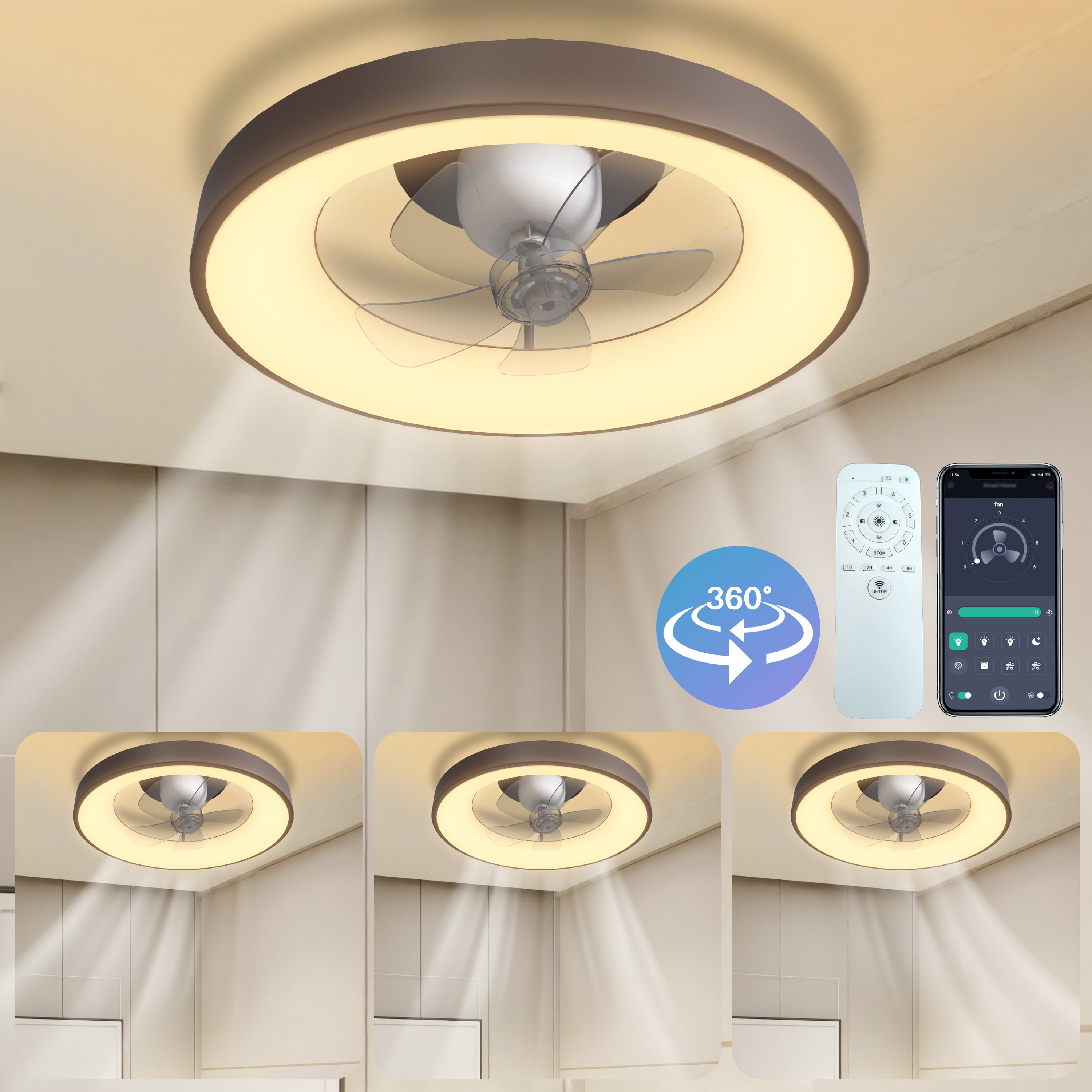 [Upgraded Oscillating Ceiling Fan]- Unlike other lighted ceiling fans, you need to sit under the fan to feel the breeze. This oscillating ceiling fan with remote can rotate 360 degrees, and the airflow coverage is tripled, which can quickly cool the hot air in the room. At the same time, you can freely set fixed or oscillating, and adjust the wind direction at will, providing more options. [Dimmable LED Ceiling Fan with Light]- The flush mount ceiling fans with lights supports 3 colors (warm, cool, neutral) and lamp brightness can be adjusted from 10% to 100% using the stepless dimming technology. So you can easily adjust the brightness for each color temperature. (Note: When using the remote control to control the ceiling fan with light, the wall switch needs to be kept on) [Reversible Blades& No Noise Motor]- Available for all seasons. The ceiling fan’s DC motor and 5 blades run smoothly, provides strong airflow, no noise, low power consumption, keeping you warm in winter and cool in summer. [Multi-Speed & Timing Function]- This ceiling fan lights with remote has 6 wind speeds and timing (1/2/4/8h) settings make it easy to maintain the ideal comfort level, no noise, and does not wake people in sleep. [Easy to Install & Clean]- The invisible fan blades of this bedroom ceiling fan with lights can guide the air to all corners of the room for better air circulation, don’t worry about any risk of being hit by the rotating blades; it comes with a remote control controller, all functions are controlled by the remote control. No assembly required and easy to clean. [Safety Design]- Traditional fans with exposed blades have potential safety hazards. Modern round concealed bladeless ceiling fan are safer and better suited for loft beds and low ceilings. Don’t worry about any risk of being hit by the rotating blade, protect your family, kids safe. This low profile ceiling fan can be used in bedroom, living room, dining room, kitchen, kids room, office and more. [Remote Control & APP Control]- This low profile ceiling fans with lights and remote can be controlled by both remote control and APP, and the fanlight has a memory function, which will retain the brightness of the last use when the lamp is turned on. If you have any questions about the product, please contact us through the order details and you will receive a reply within 12 hours.