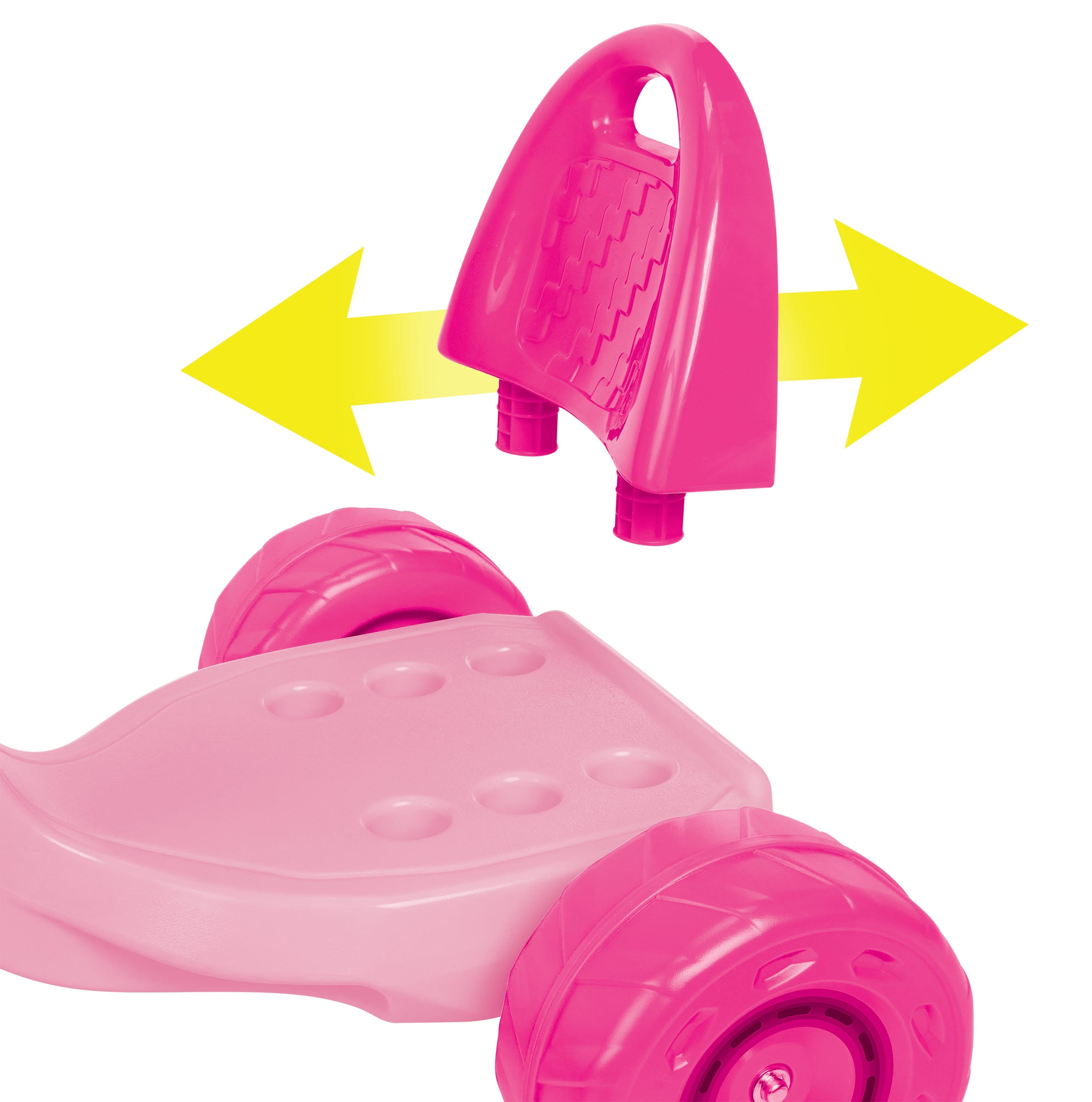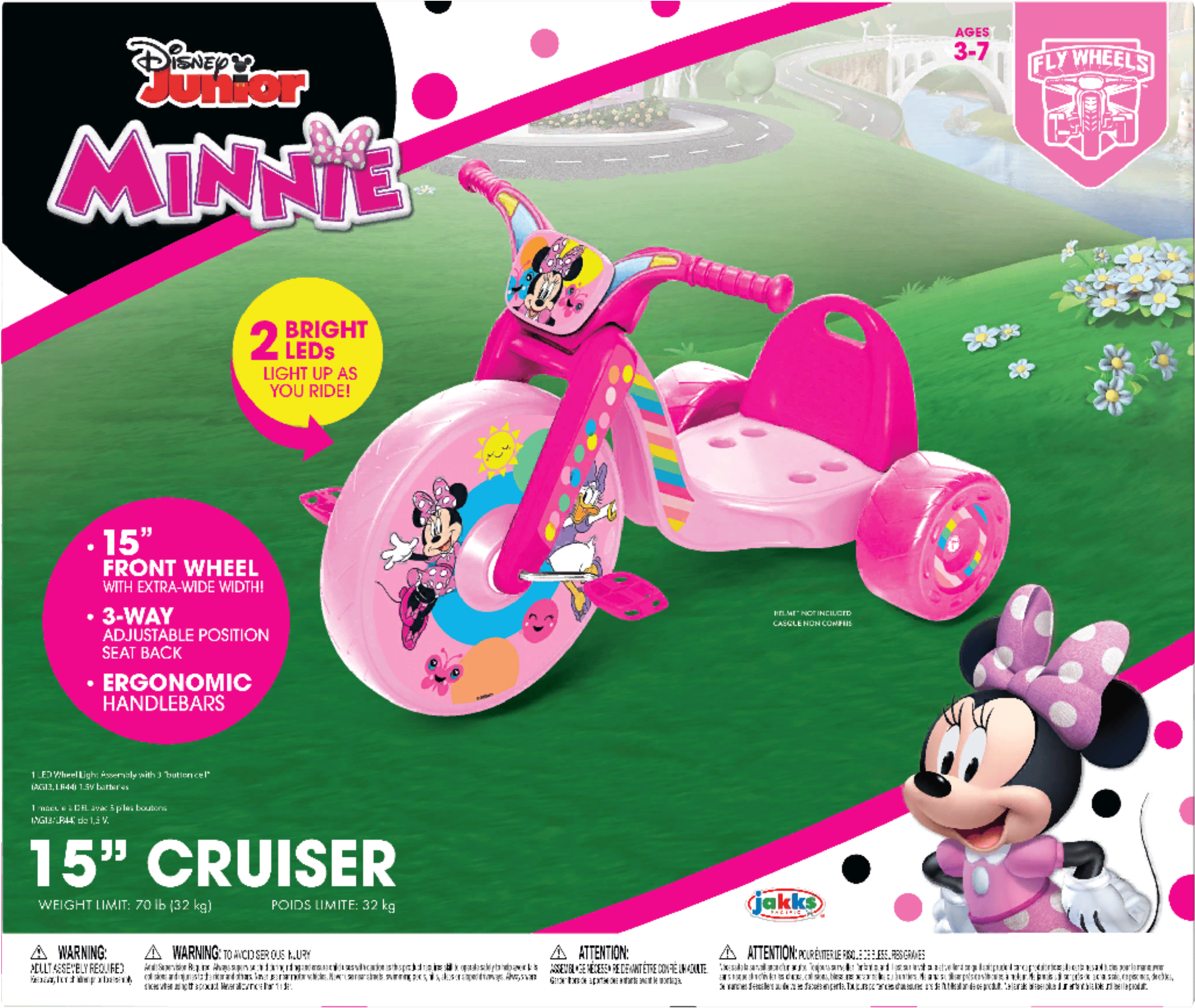 Get ready to roll with Minnie Mouse fly wheels! Zip around the neighborhood with your favorite character graphics. Let the LED lights on the front wheel whirl as your drive. Fly wheels encourage your child to get outside and exercise with endless rip-roaring potential. The low-riding design creates easy off and on access with a low center of gravity for security and comfort. Designed with an oversized 15 inch front wheel, your little one will be riding in style. The 15 inch fly wheel includes 3 adjustable seat positions which fit your child’s growth needs. Always have your child wear a helmet. (Helmet not included). Adult assembly and supervision required. Stickers to be applied during assembly. Ride-on dimensions: 20 in x 22.5 in x 32.83 in. Weight limit 70 lbs. Warning: adult assembly required. This exciting pedal powered ride-on is for Child 3 to 7 years. Happy riding!