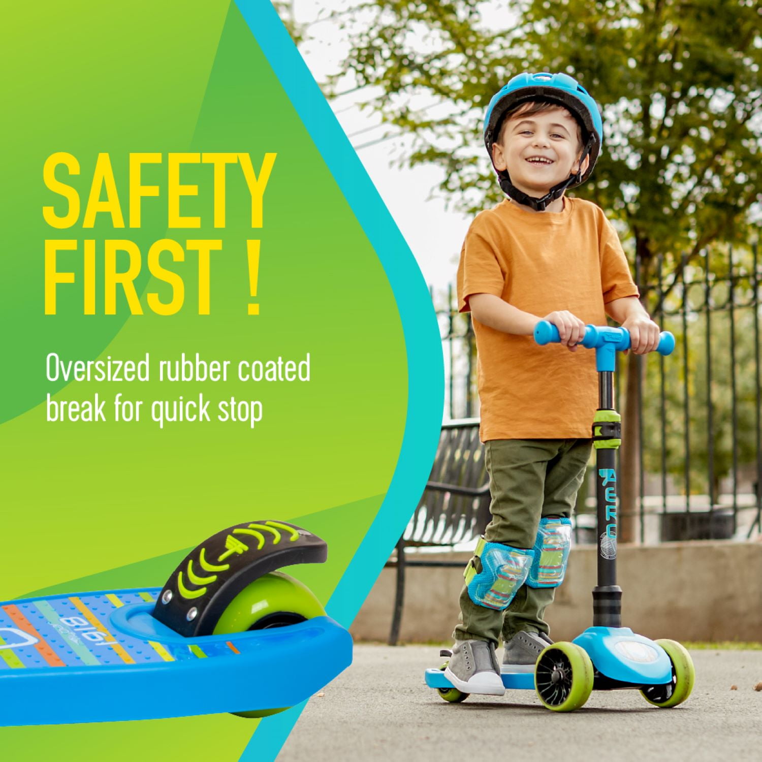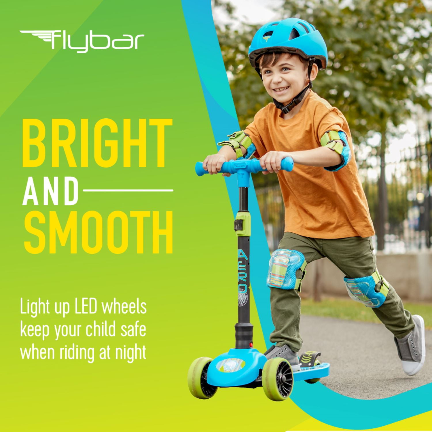 Flybar, Aero 3 Wheel LED Kick Scooter for Boys and Girls, Ages 3+, Adjustable Handles, Blue Kids Scooter: Glide around in comfort and colourful style with the Flybar Aero 3-wheel kick scooter, a lean to steer glider that’s a great way for training balance and motor skills for kids ages 3 and up and a weight limit of 120 lbs Stable 3-Wheel Design: Our 3-wheel design gives the kick scooter added stability and safety, providing a balanced ride. The Aero 3-Wheel Scooter also features a wide anti-slip deck and 3-wheel design that makes riding fun and easy for kids of any skill level. Simply hop on and start gliding! Adjustable: Featuring a T-style 3-level adjustable height column with clasping lock, allowing the scooter to grow with the child, the column is also foldable and features comfortable handlebars for little hands Wide LED Flashing PU Wheels: offer great stability, reduce vibration, and make for a smooth ride both inside and outside the house, while its flashing LED lights enhance visibility at night. Wide LED Flashing PU Wheels: offer great stability, reduce vibration, and make for a smooth ride both inside and outside the house, while its flashing LED lights enhance visibility at night. Wide LED Flashing PU Wheels: offer great stability, reduce vibration, and make for a smooth ride both inside and outside the house, while its flashing LED lights enhance visibility at night. Wide LED Flashing PU Wheels: offer great stability, reduce vibration, and make for a smooth ride both inside and outside the house, while its flashing LED lights enhance visibility at night