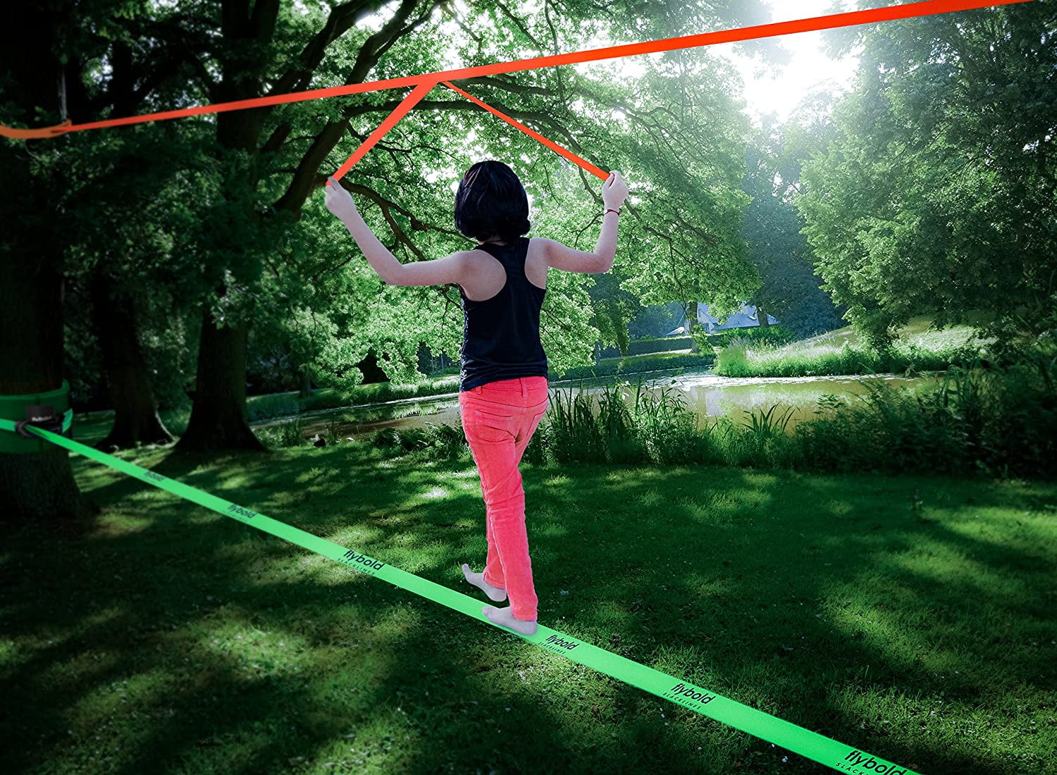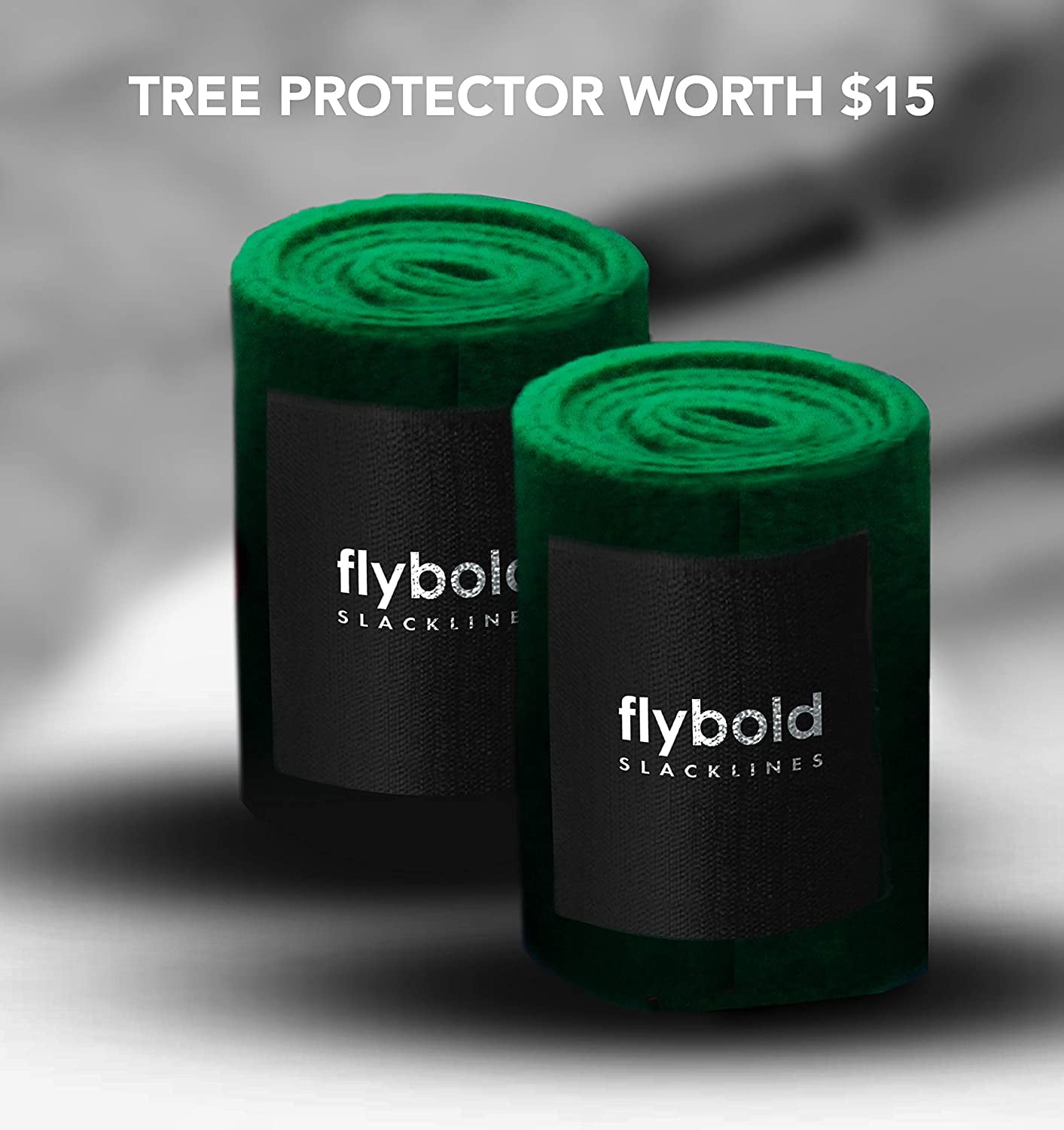 OUR SLACKLINE INCLUDES MORE THAN OTHER SLACKLINES Incredible value! 1 mainline 2 Training line 3 Two ratchets 4 Arm trainer 5 Ratchet protector worth $10 6 Tree protectors worth $15 7 Carry bag 8 Instruction manual 9 Gift box packing. Phew! LONGER WALKING LINE. TRAINING LINE AND ARM TRAINER 57 ft line, instead of standard 50 ft. Training line for beginners to develop balance before walking without support arm trainer to develop correct arm position and better balance. Our Flybold Slackline is also called slack lines for backyard for adults, slackline for kids, slackline block, single slack line kit, kids slackline, slack lines for children, balance line, slackline kit with tree protectors, kids slack line kits, slackline beginner kit, kids tight rope, slack line pro, tight rope line for kids, tightrope kit, balance rope, slackline set, kids slackline kit, slackline training, slackline kids, slackline kit for kids, slacklines for kids, training slackline SAFE. SOLID. SUPERIOR Main slackline with 5T BREAK LOAD (safely carries 300 lbs) TWIN GEAR ratchets for better pulling strength and safety extra wide TREE PROTECTORS (5 feet) to protect trees and line from abrasion ratchet protector to PROTECT YOUR FEET while on the slack line.