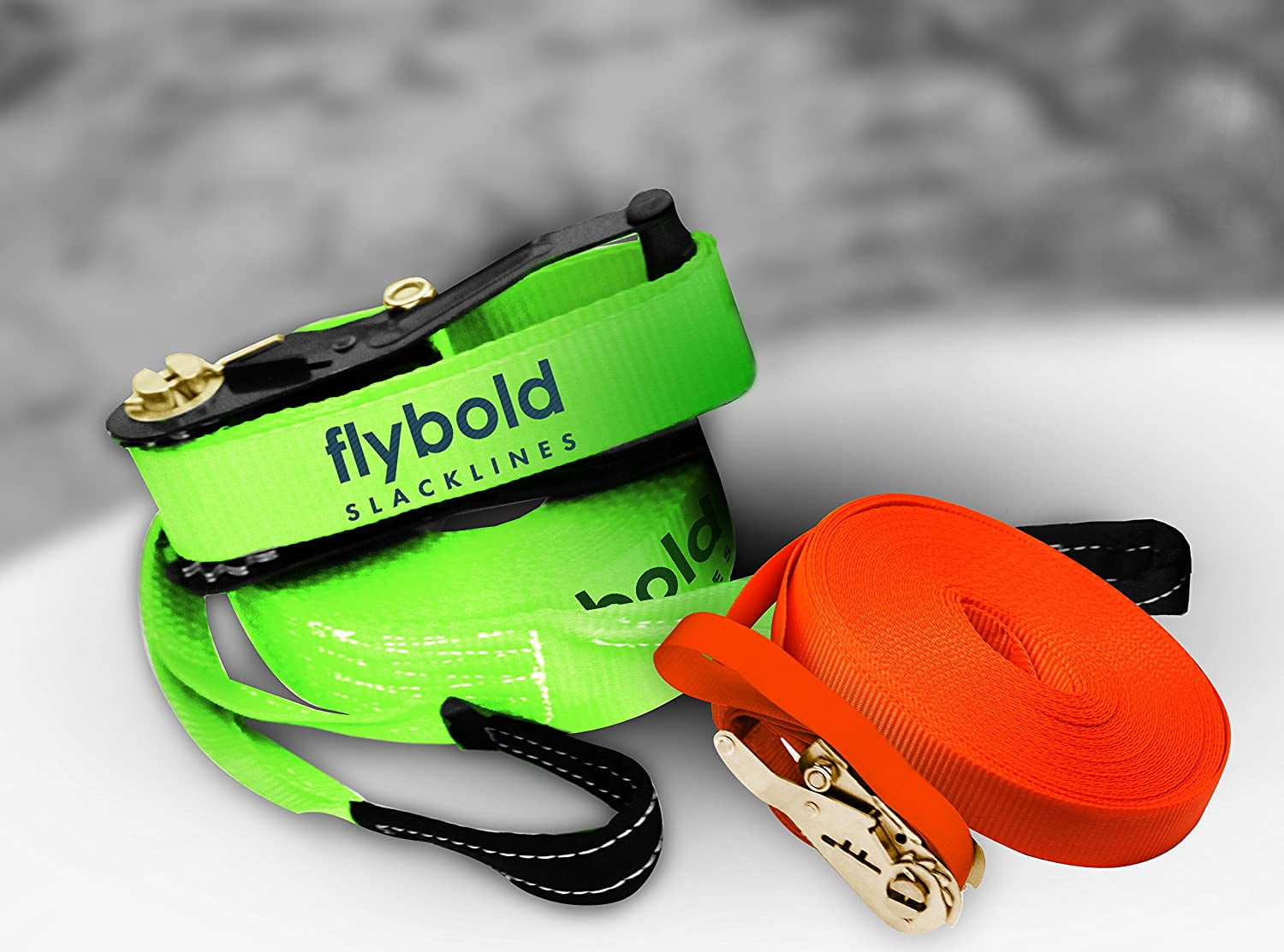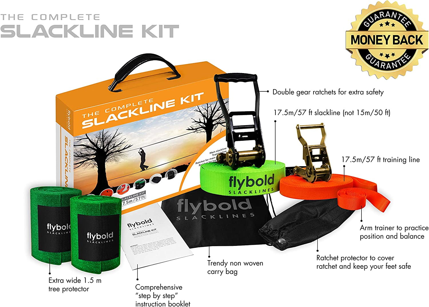 OUR FLYBOLD SLACKLINE INCLUDES MORE THAN OTHER SLACKLINES Incredible value! 1 mainline 2 Training line 3 Two ratchets 4 Arm trainer 5 Ratchet protector worth $10 6 Tree protectors worth $15 7 Carry bag 8Instruction manual 9 Gift box packing. Phew!