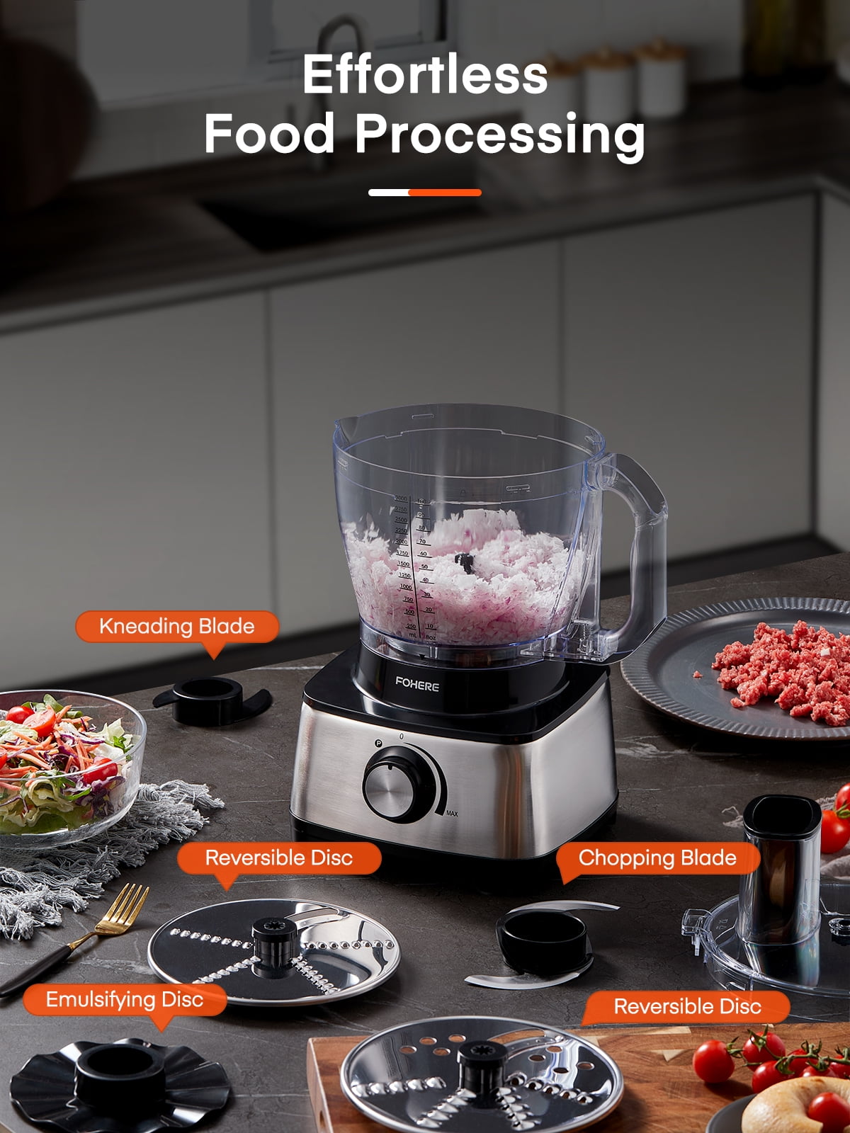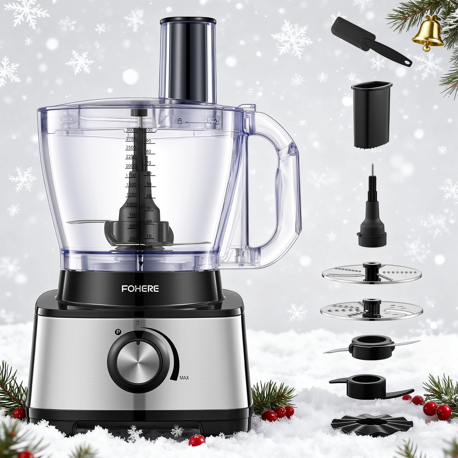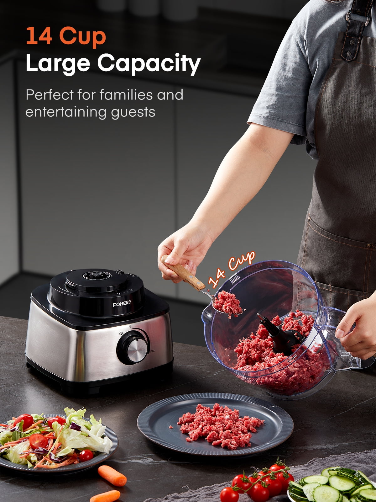 【14cup Large Capacity & 5 Blades】14 cup Super large capacity, with 2 stainless steel reversible blades, 1 cutting blade, 1 emulsifying blade and dough blade. Different blades are used to make different foods to prevent mixed flavors. The highly transparent glass bowl allows you to directly see the food grinding process inside the machine. Food processor can process a large amount of food at a time, which is very suitable for family use 【Unique Stepless Speed Regulation Design】To protect the motor and extend the use time, FOHERE food chopped adopts stepless speed regulation design, which makes it easy to cut and crush food. This product is easy to disassemble and assemble, easy to use, and except for the motor, the rest of the parts can be put into the dishwasher for full cleaning. The compact design saves space on your countertop 【Powerful 800w Food Processor】Equipped with an 800w high-power upgraded motor, it can easily solve kitchen food problems and completely chop or blend food into puree in a short time. It has 2 speed options and an inching function. Select the inching function to chop vegetables, cheese, dough, etc. In addition, this function can also be used to crush ice and automatically clean. 【6 Functional Options】FOHERE food processor comes with 6 functions and is a must in every family’s kitchen. It can be chopped, sliced, shredded, kneaded, emulsified, and juiced. We are equipped with 2 S-shaped blades, one for kneading and the other for shredding. Make sure every accessory is fully used and enjoy a variety of cuisines with only FOHERE food processor 【Safe to Use】Food chopped is equipped with an ergonomic handle for comfortable grip. The machine has a double safety setting, and the machine will only start working when both safety locks are locked. The non-slip rubber feet at the bottom help keep the machine in place, avoid causing the machine to shake and become unstable, and effectively reduce working noise