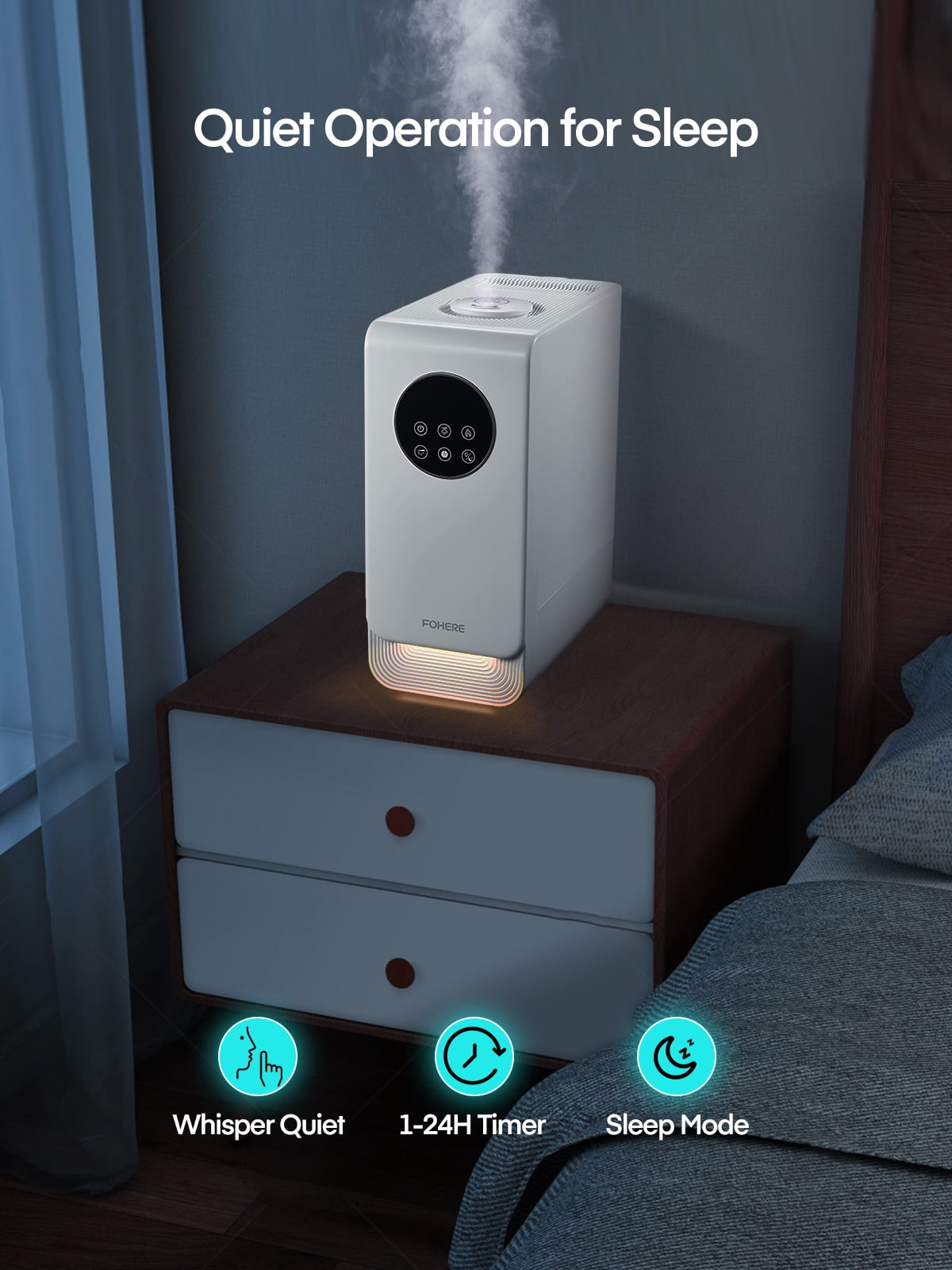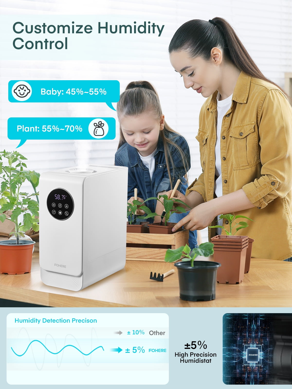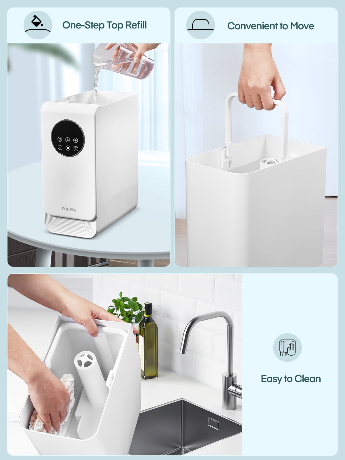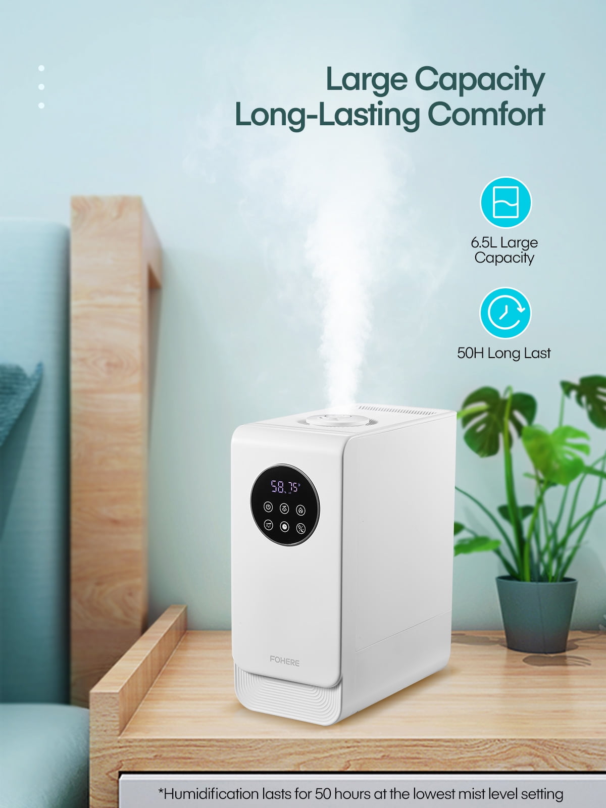 More Effective Humidification: The air humidifier delivers rapid humidification for instant relief from dryness. This highly efficient humidifier for the home emits a mist up to 40 inches high and disperses moisture widely throughout large rooms using 360-degree rotating nozzles. Select from three mist levels to suit varying room humidity needs. Warm and Cool Mist for Year-Round Comfort: Warm mist safely helps relieve sinus issues, congestion, and coughs during winter, while cool mist keeps your room moisturized in other seasons. The FOHERE warm and cool mist humidifier promotes a healthier and more comfortable lifestyle. 6.5L Large Capacity for Long-Lasting Comfort: Consistently enjoy moisture for up to 50 hours with the 6.5-liter large capacity tank. Less frequent refills needed. Perfect for bedrooms, nurseries, living rooms, and offices. Adjustable Humidity Control, Ideal for Home Settings: This air humidifier offers a humidity adjustment feature ranging from 30%-80%, providing comprehensive care for your baby and plants. The built-in sensor ensures constant humidity mode maintains a healthy moisture level within 5% tolerance. Sleep Mode, 24-Hour Timer, and Essential Oil Diffuser: When in sleep mode, the LED display will turn off while the device continues to operate. This quiet humidifier also features a 24-hour timer for a soothing and restful sleep. Add 2-3 drops of your preferred essential oil to the tray for a uniquely fragrant atmosphere at home. Top-Fill Design for Easy Refilling and Cleaning: No more inverting the water tank to refill. Our large top-fill tank design ensures hassle-free refilling and cleaning. The built-in handle makes it convenient to carry water.