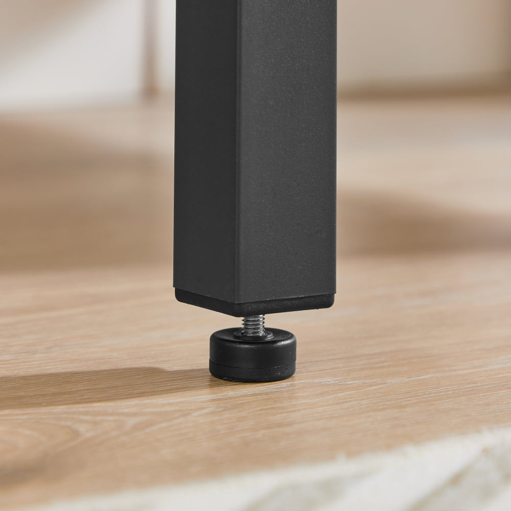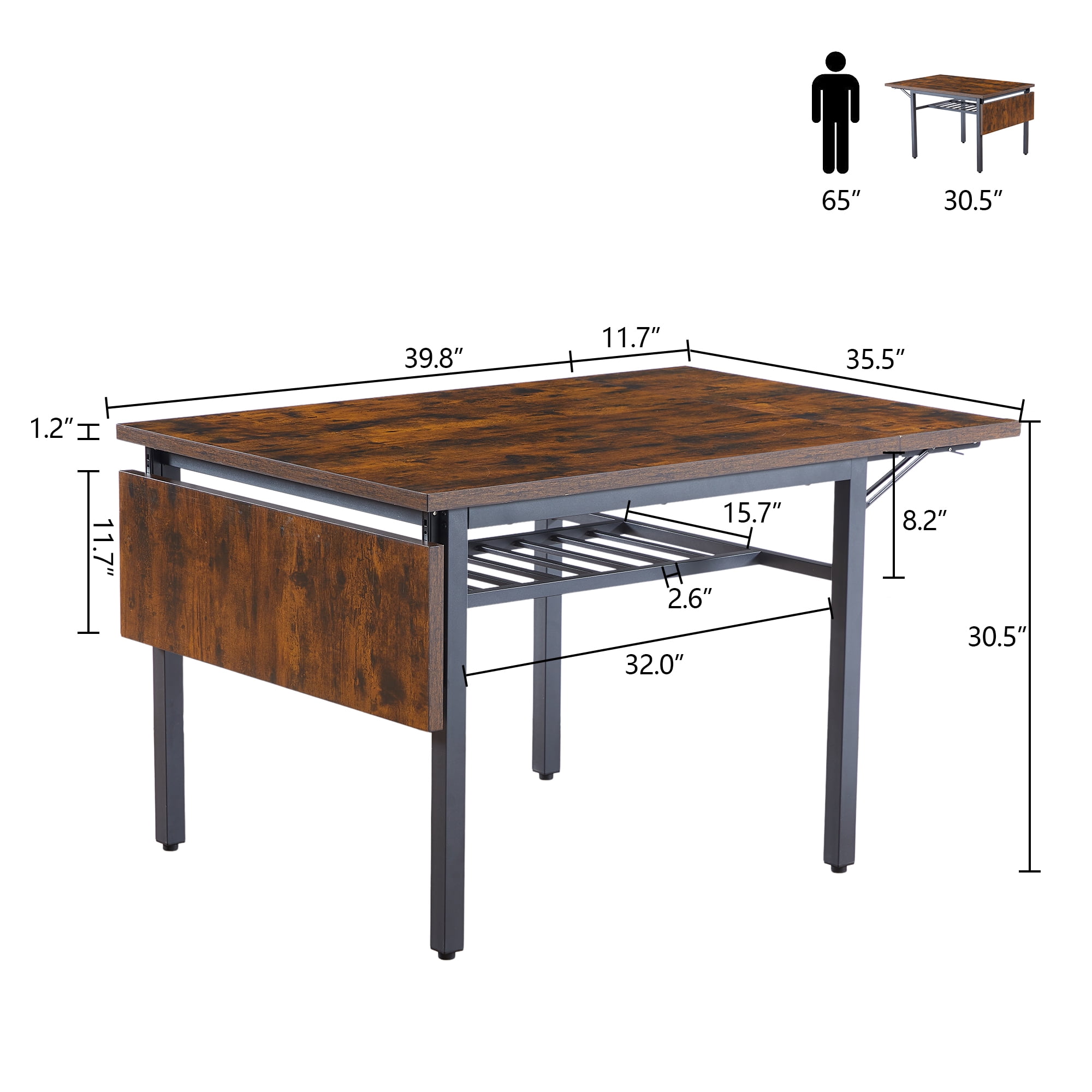 The 1.2-inch thick table top and thickened iron frame ensure the sturdiness of this table, and the adjustable feet can protect your floor from scratches and keep the table stable. With a 63.2” L x 35.” W extendable table surface for dessert, soup, salad, and your special dish when you invite your favorite friends over, all you need to do is to prop up the drop leaves. After Entertaining, Fold It Up… To a 39.8” L x 35.5” W small table that takes up less space. The durable particleboard and steel legs make a solid drop leaf dining table that’s enhanced by folding brackets; the adjustable feet eliminate unwanted wobbles. Grab a bite in your built-in kitchen for busy mornings, share an intimate meal with your better half, or watch the sun go down with a drink on your balcony.