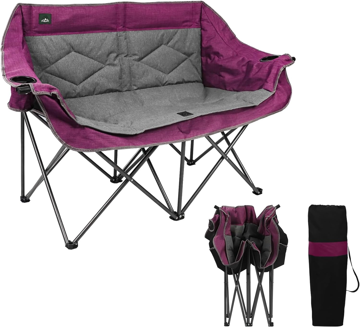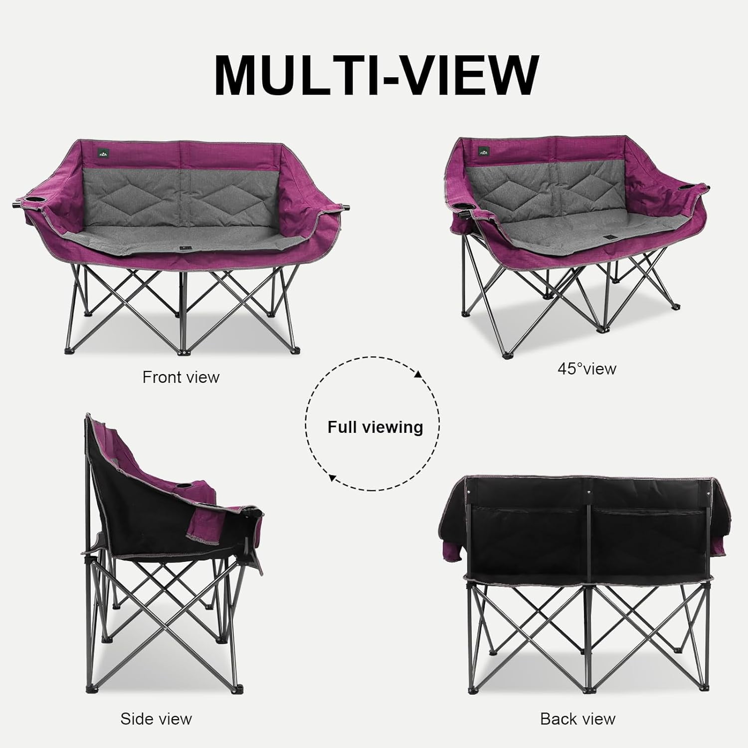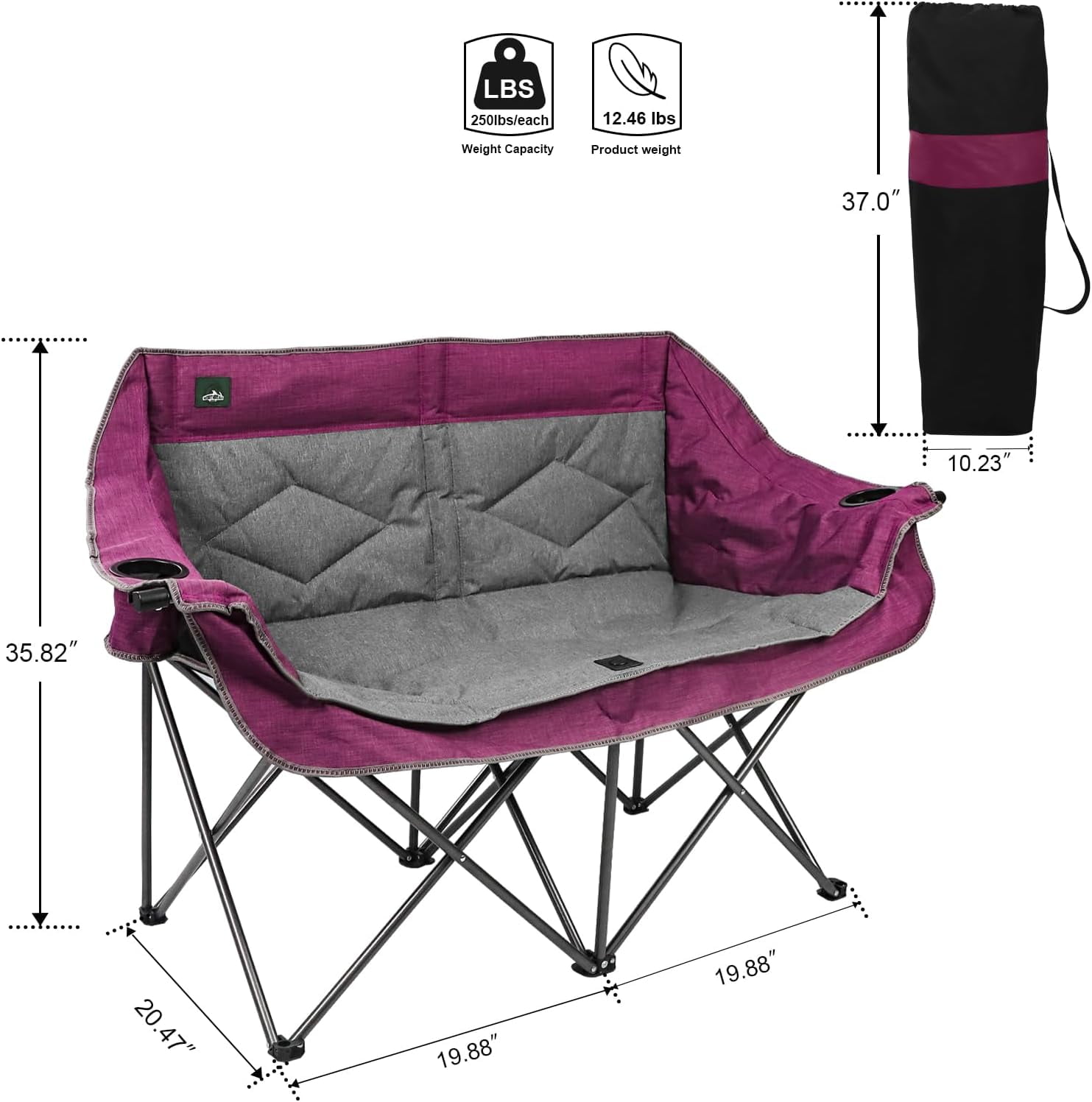 ???????????????????????????????????? ????????????????: Oversized loveseat camping folding chair open size is 35.82 x 20.47 x 39.76 inches,and it’s 37×10.23×10.23 inches when folded. Weight 12.46lbs,Weight Capacity 300 LBS (136 KG ) Per Seat ???????????????????????????????? ???????????????????????????? ???????????? ????????????: This double camping chair provides ample seating space for two people, can support up to 600lbs,helps you to make conversation and cuddle with your partner, friends and family members easier.. ???????????????? ???????????????????? ????????????????????????????: Loveseat camping chair is unique design of 2 wine glass holders and 2 cup holders allows you and your partner to enjoy a romantic time, camp couch is easily & securely clips wine, champagne, and any other stemmed glass. ???????????? ???????????????? ???????????????????????????? ????????????????????????????: The chair is equipped with two mesh storage pockets on the backrest, providing storage space for small items like phones, keys, or snacks, keeping them easily accessible. ???????????????????????????? ???????????? ???????????????????????????????? ????????????????????????: Made with high-quality materials, this double camping chair is built to withstand the rigors of outdoor use. Additionally, it conveniently folds into a compact size and comes with a carrying bag for easy transportation and storage.