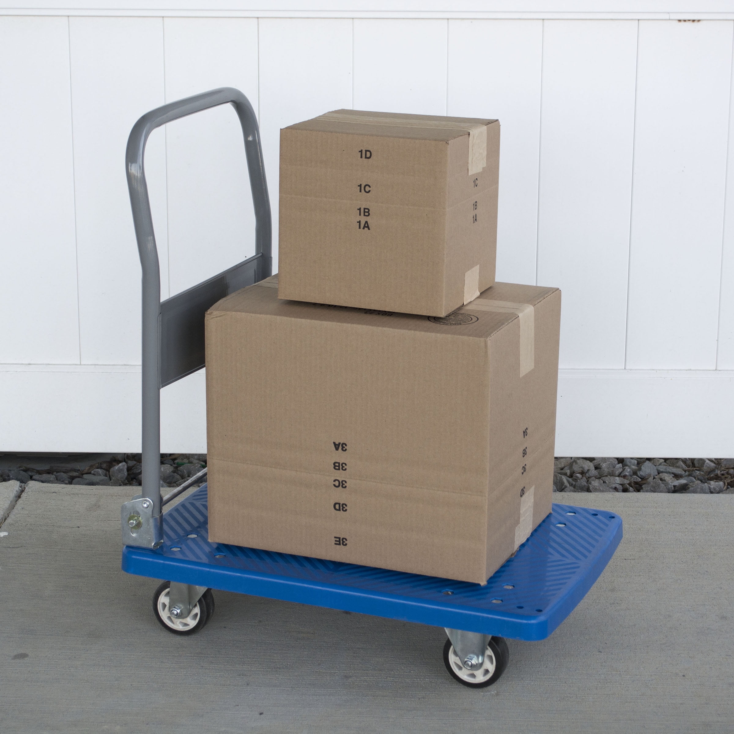 Folding Platform Truck 440 lbs Capacity Description: Keep the Pro-Series Folding Platform Truck close at hand to make moving bulky loads easy and safe. With a 440 lbs load capacity, the Folding Platform Dolly will move paper and equipment at the office, boxes and supplies in the warehouse, and purchases from the warehouse club. The Folding Cart handle easily folds flat against the platform, creating a slim profile, just 10 inches high, for easy storage. The 28 x 19 inch platform surface is constructed of durable PVC, and has a 33 inch high steel hand rail. Four heavy-duty 4-inch caster wheels make steering easy and stable. Platform stands 6 inches from the ground. Overall size: 28 L x 19 W x 33 T inches when hand rail is raised. Durable 1.25 inch PVC platform measures 19 x 28 inch platform hold up to 440 lbs. Features: Color: Blue. Material: Plastic. Assembly required: No. Product Dimension: 28″L x 19″W x 33″H, Weight: 22 lbs. Great for use at the warehouse, office, or around the house. Easily and safely move supplies and bulky items. Steel hand rail folds down for easy storage, just 10 inches high when folded flat. Heavy-duty, non-locking, 4-inch caster wheels make steering smooth and easy. Warranty: 90 Day Limited. Country of origin: China. Brand Name: Pro-Series Model No: 1211-FPT440