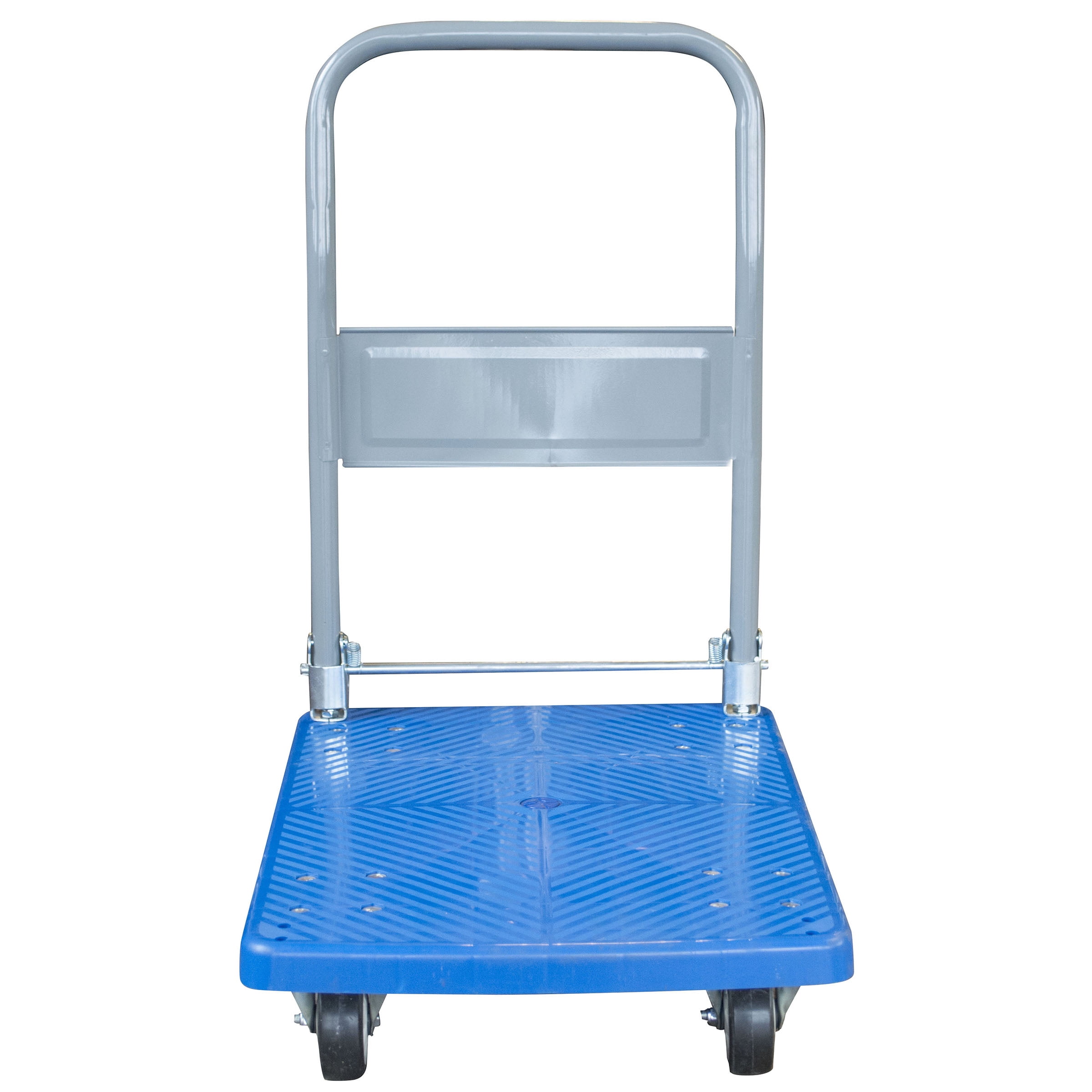 Easily and safely move supplies and bulky items Steel hand rail folds down for easy storage, just 10 in. H when folded flat Durable 1.25 in. PVC platform measures 19 in. x 28 in. Platform holds up to 440 lbs. Heavy-duty, non-locking, 4 in. caster wheels make steering smooth and easy Platform stands 6 in. from the ground