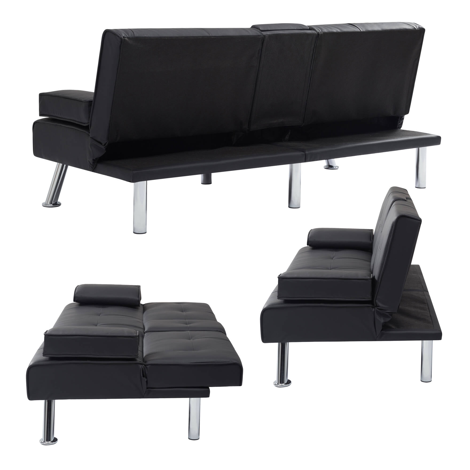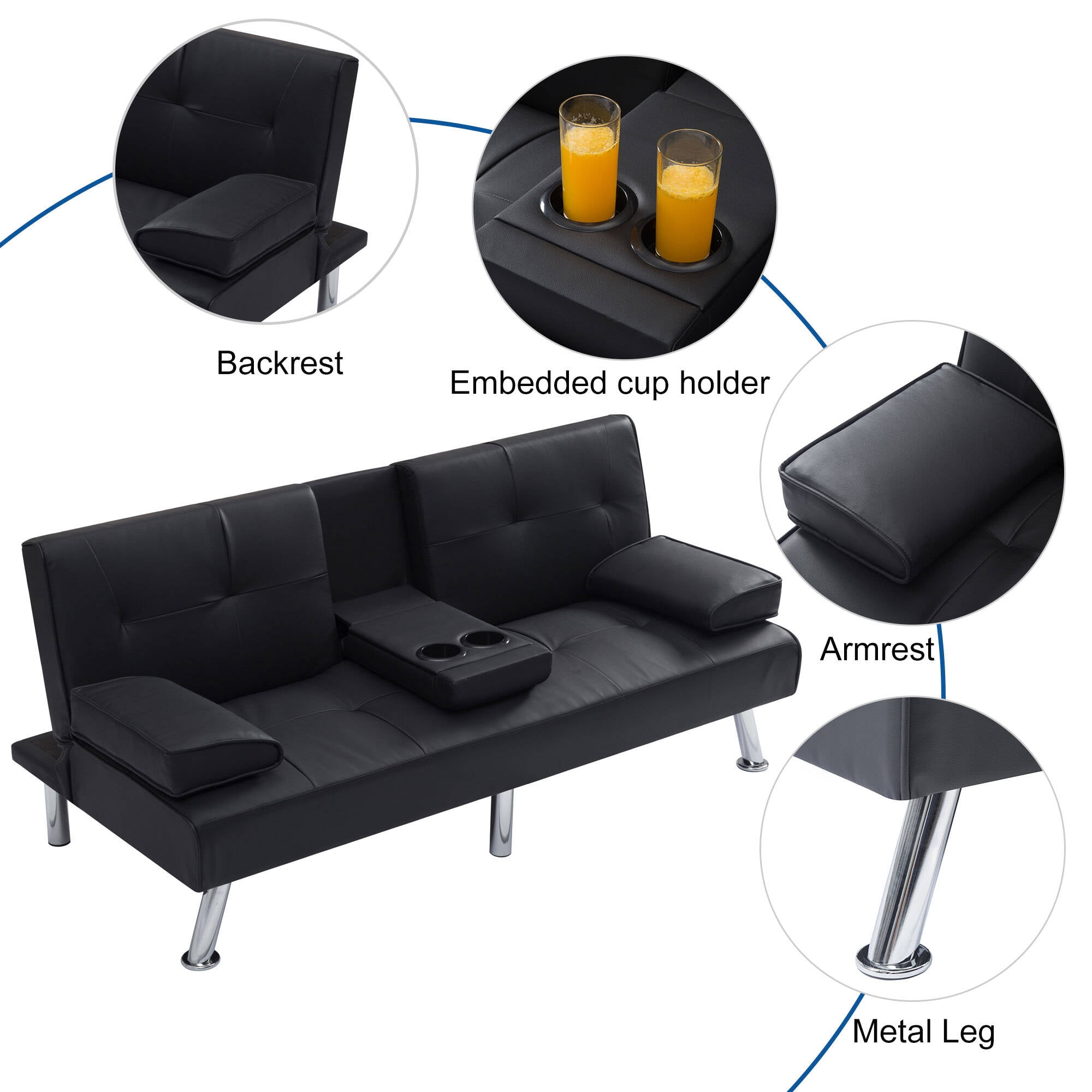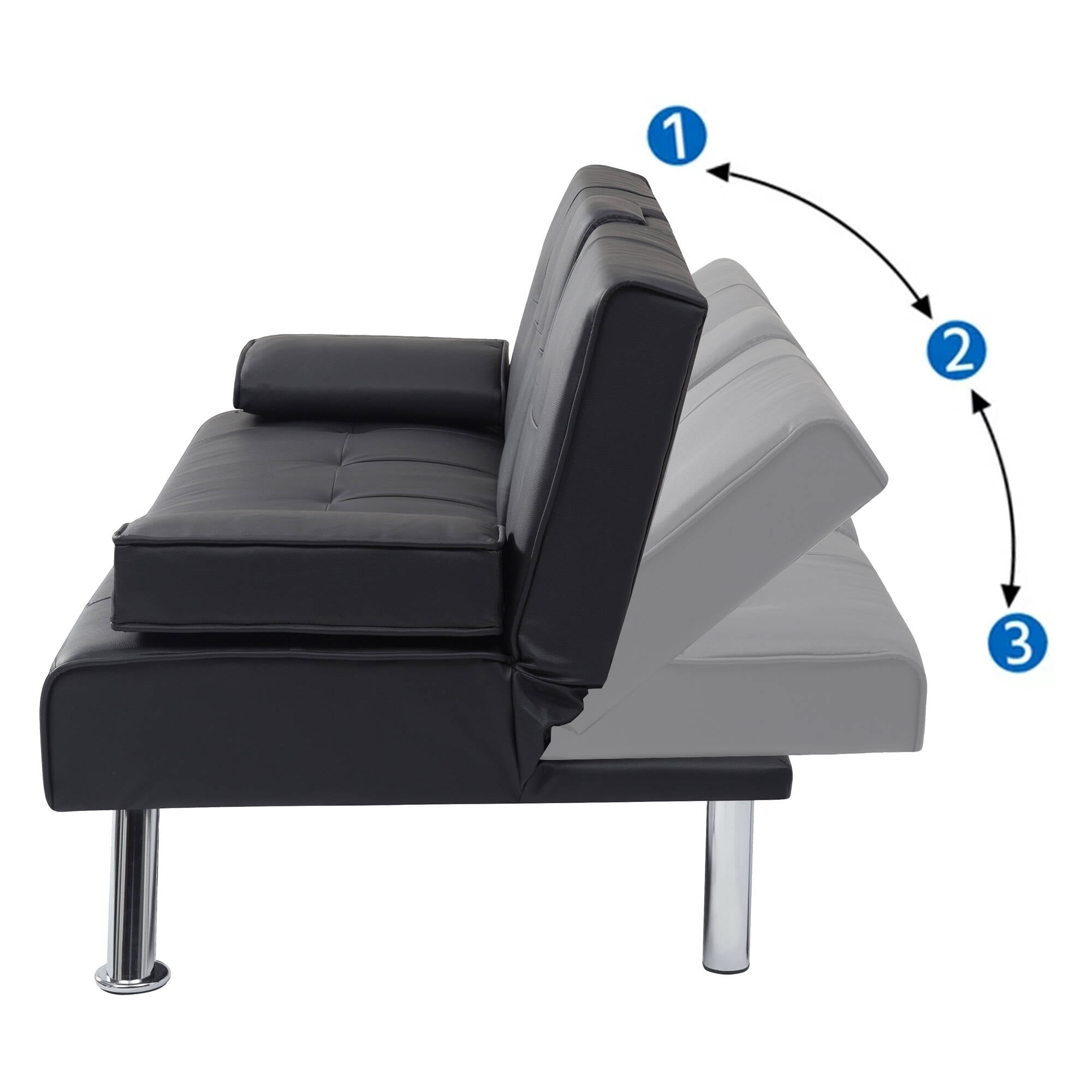 Folding Sofa Bed with Cup Holder Convertible Futon Couches Adjustable Backrest Modern PU Leather Furniture Upholstery for Living Room