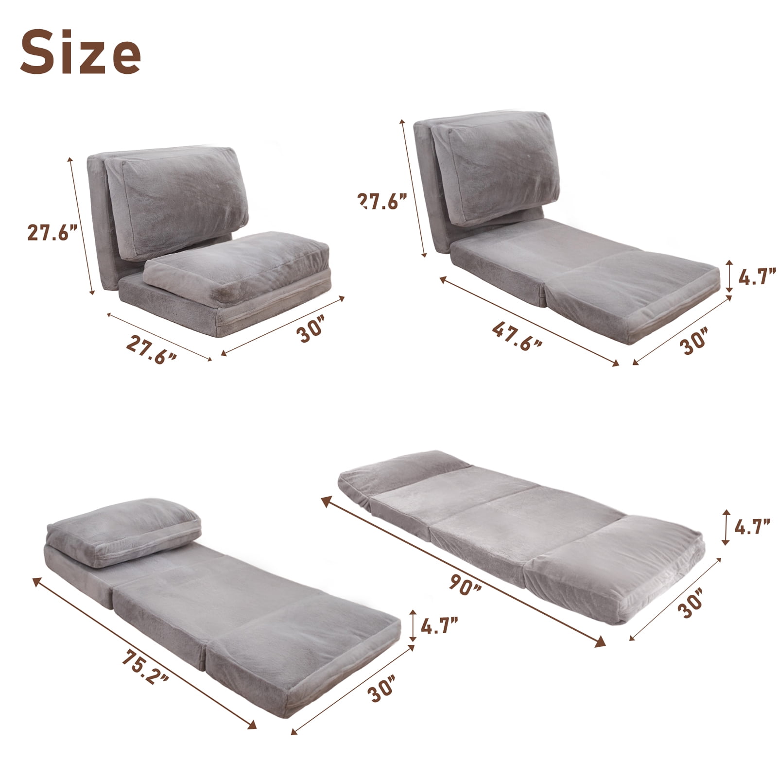 Folding Sofa Bed,Extra Thick and Long Fluffy 4 Position Convertible Flip Lounge Chair,Foam Filling Folding Matress Sofa Bean Bag with Washable Cover,Grey,30×95 Inch