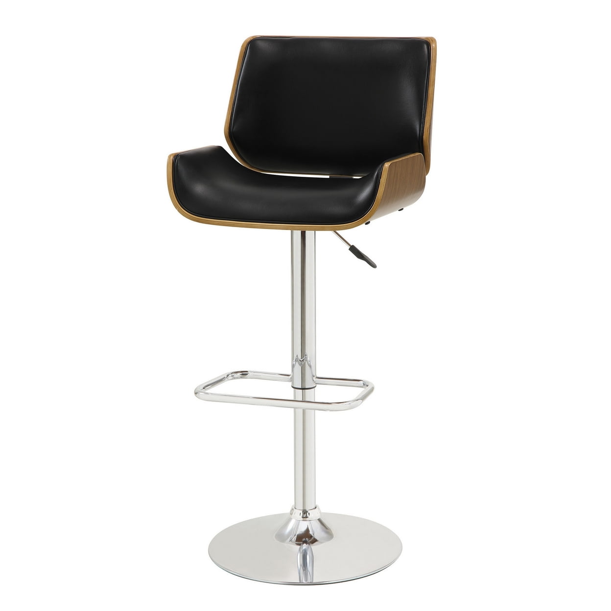 Upholstery: Black leatherette Wood finish: Walnut Metal finish: Chrome Assembly required: Yes Enhance the style of a home entertainment area by pulling one or several of these stools up to a bar This stool also works well solo at a reception desk in a professional setting